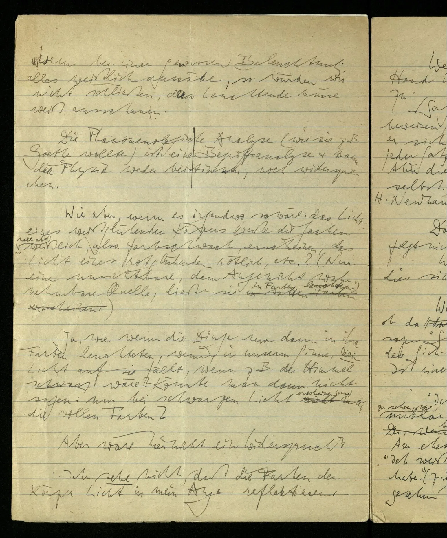 Wie aber, wenn es irgendwo so wäre: das Licht eines weißglühenden Körpers ließe die Sachen hell aber weißlich, also farbschwach, erscheinen, das Licht eines rotglühenden rötlich, etc.? (Nur eine unsichtbare, dem Auge nicht wahrnehmbare Quelle, ließe sie in Farben leuchten.)