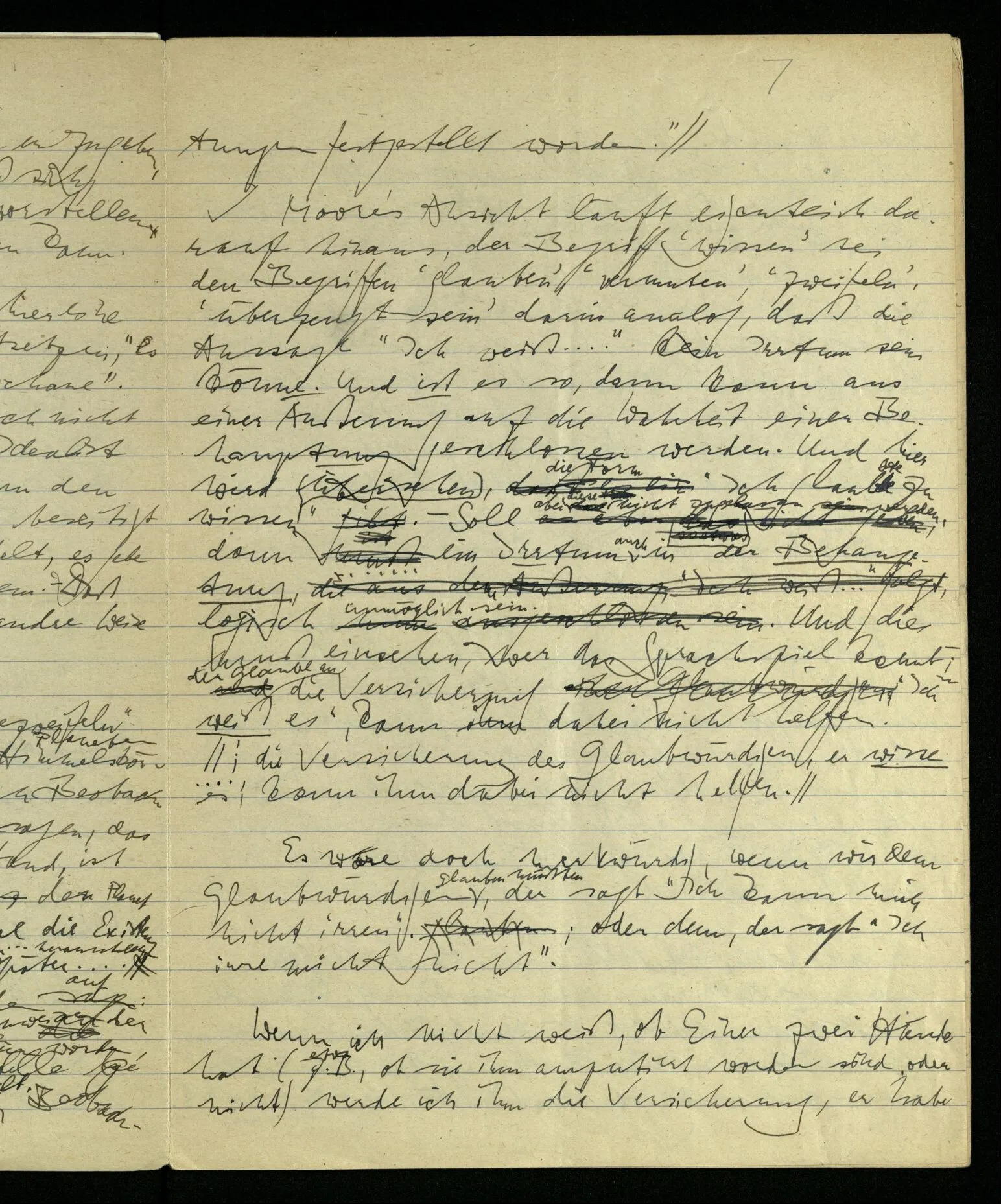 Der Unterschied des Begriffs “wissen” vom Begriff ‘sicher sein’ ist gar nicht von großer Wichtigkeit, außer da wo “Ich weiß …” heißen soll: Ich kann mich nicht irren. Im Gerichtssaal z.B. könnte in jeder Zeugenaussage statt “Ich weiß” “Ich bin sicher” gesagt werden. Ja, man könnte es sich denken, daß das “Ich weiß” dort verboten wäre. [Eine Stelle im Wilhelm Meister, wo “Du weißt” oder “Du wußtest” im Sinne “Du warst sicher” gebraucht wird, da es sich anders verhielt, als er wußte.]