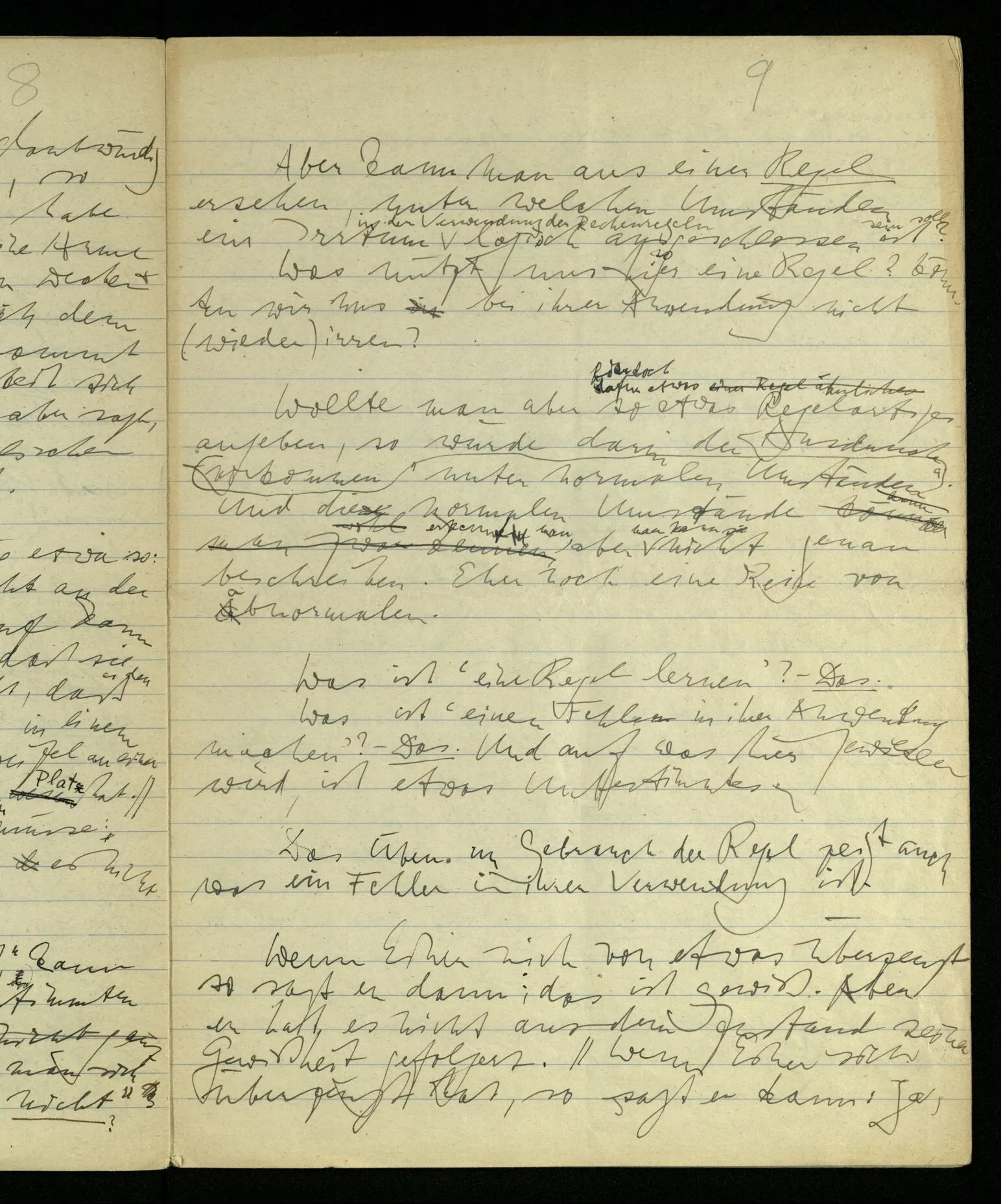 Wem man das Rechnen beibringt, wird dem auch beigebracht, er könne sich auf eine Rechnung unter den & den Umständen verlassen? Aber einmal müssen doch diese Erklärungen ein Ende haben. Wird ihm auch beigebracht, er könne sich auf seine Sinne verlassen – weil man ihm allerdings in manchen Fällen sagt man könne sich in dem & dem besonderen Fall nicht auf sie verlassen? – Regel & Ausnahme.