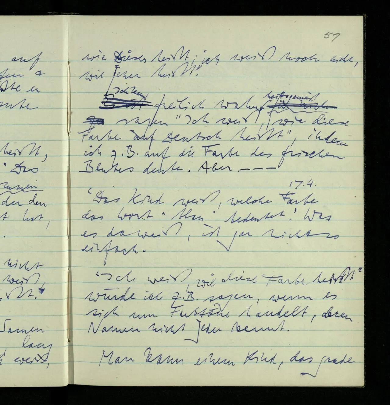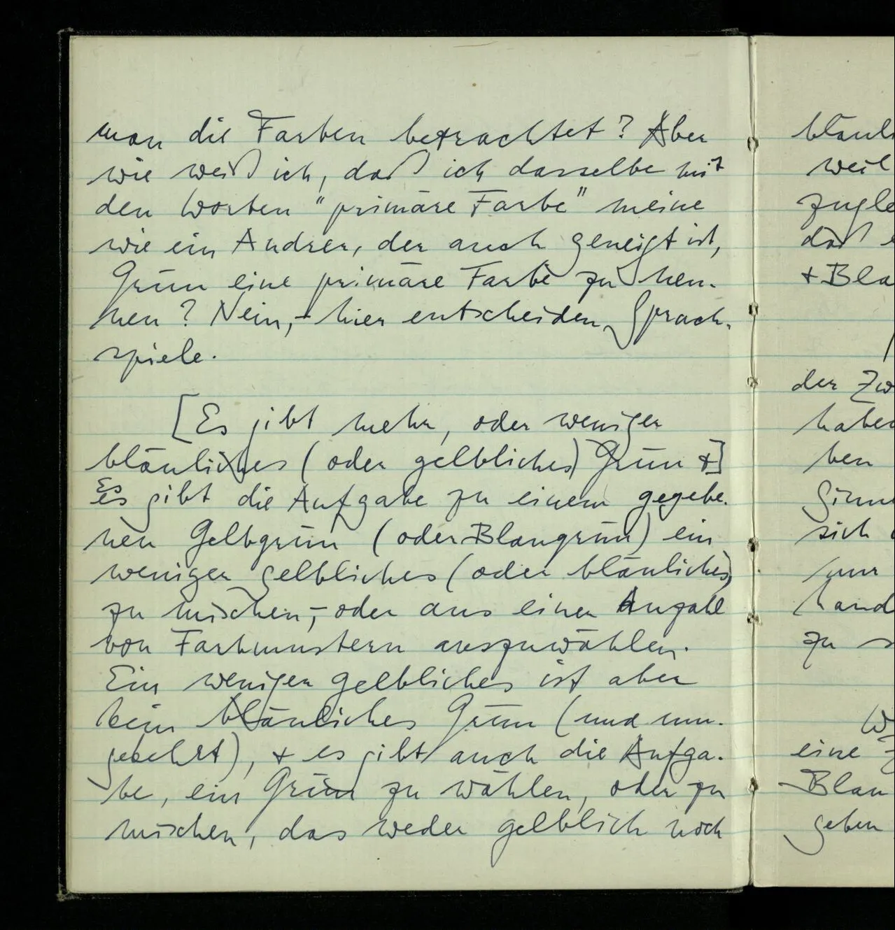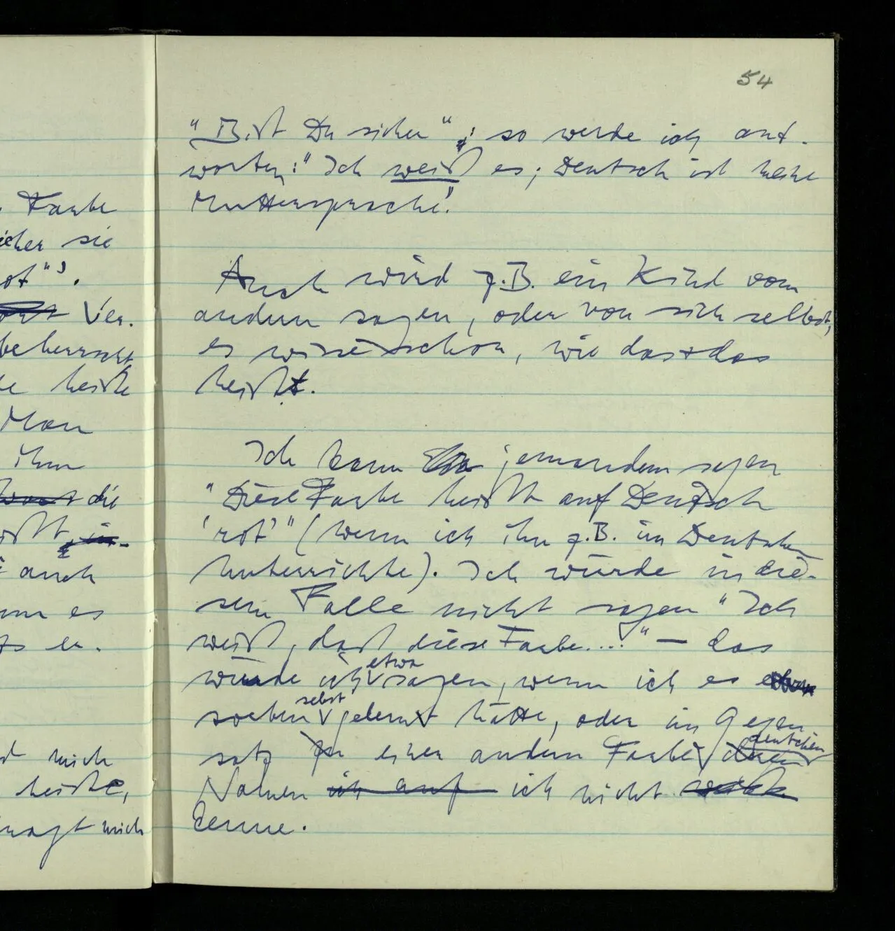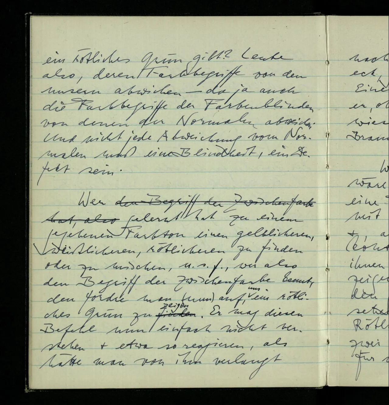 Wenn nun auch nicht Grün eine Zwischenfarbe von Gelb & Blau ist, könnte es nicht Leute geben, für die es ein bläuliches Gelb, ein rötliches Grün gibt? Leute also, deren Farbbegriffe von den unsern abwichen – da ja auch die Farbbegriffe der Farbenblinden von denen der Normalen abweichen. Und nicht jede Abweichung vom Normalen muß eine Blindheit, ein Defekt sein.