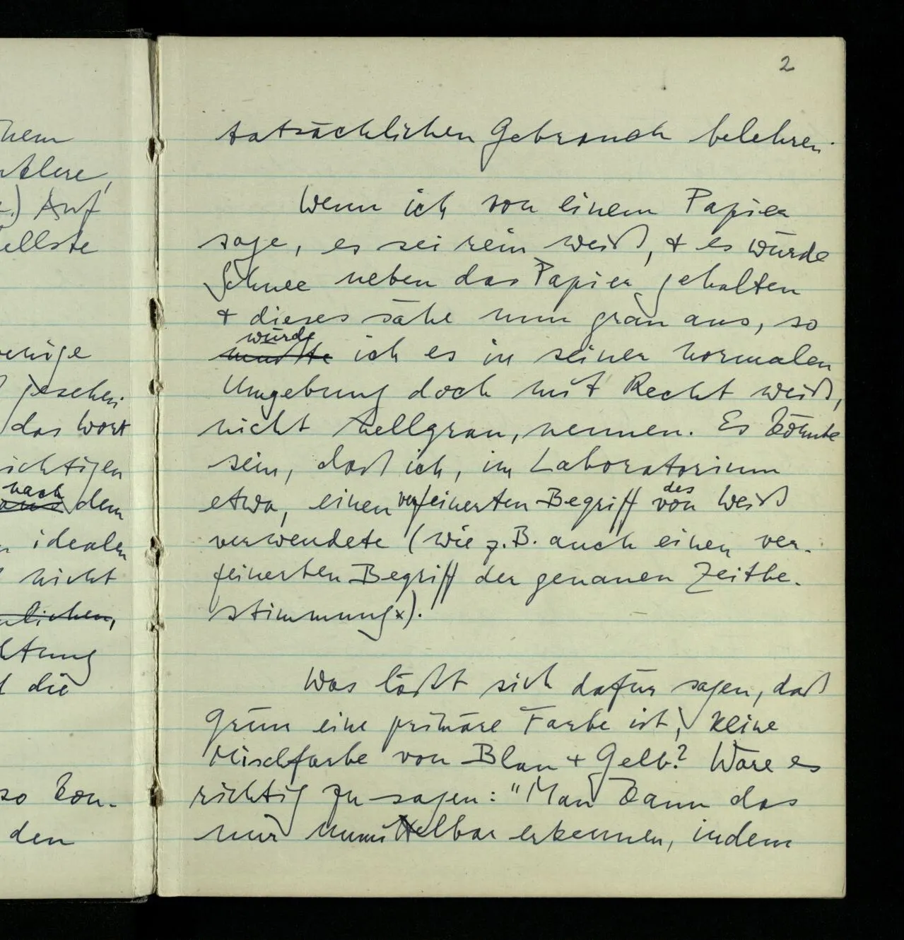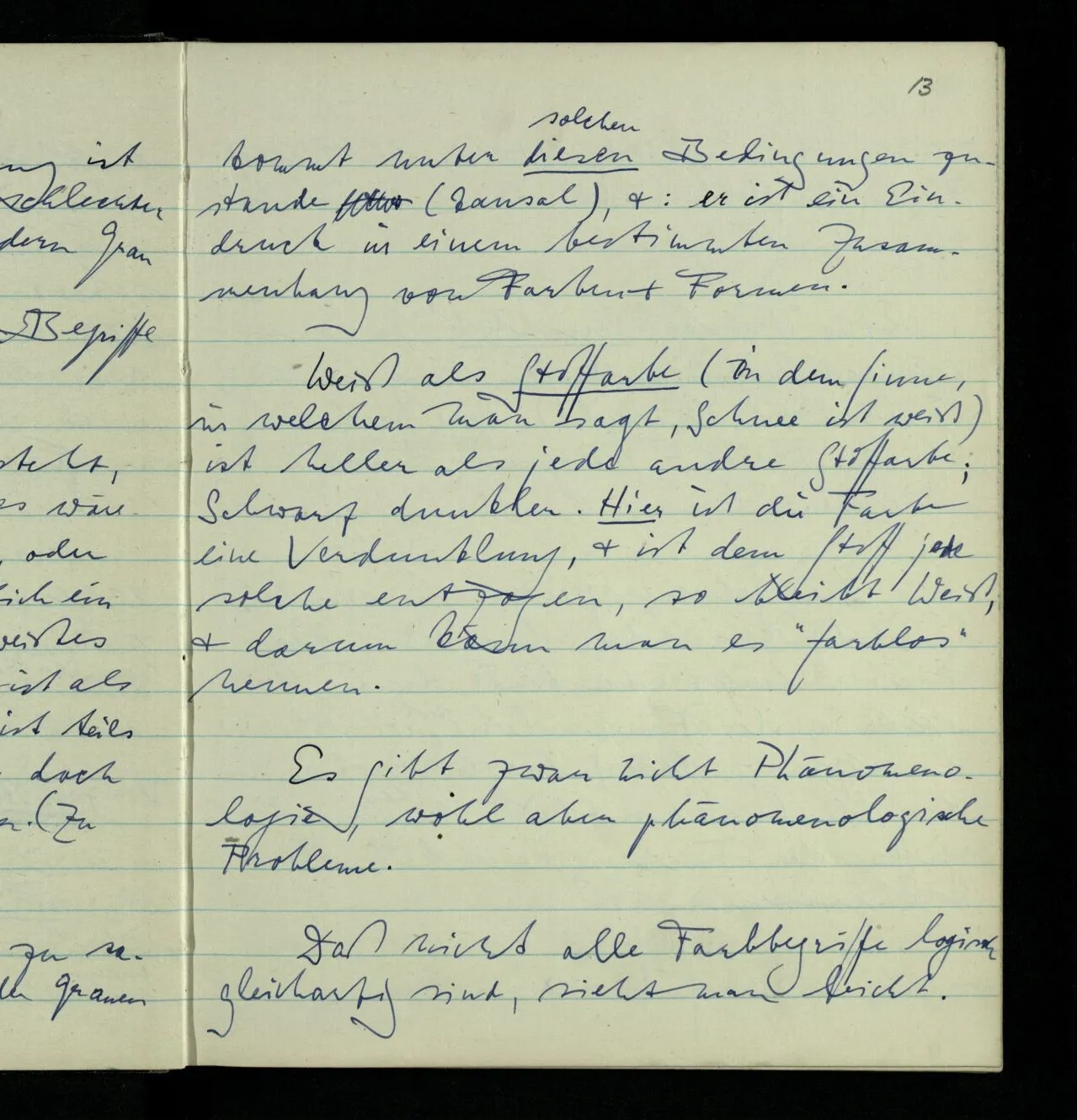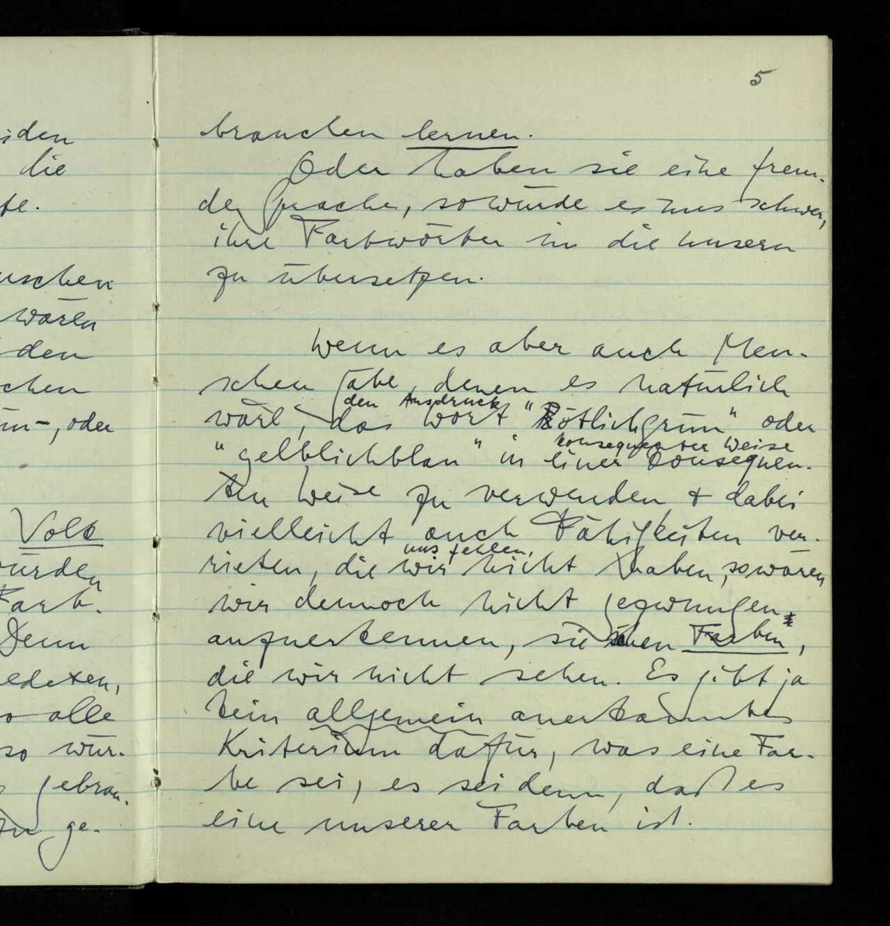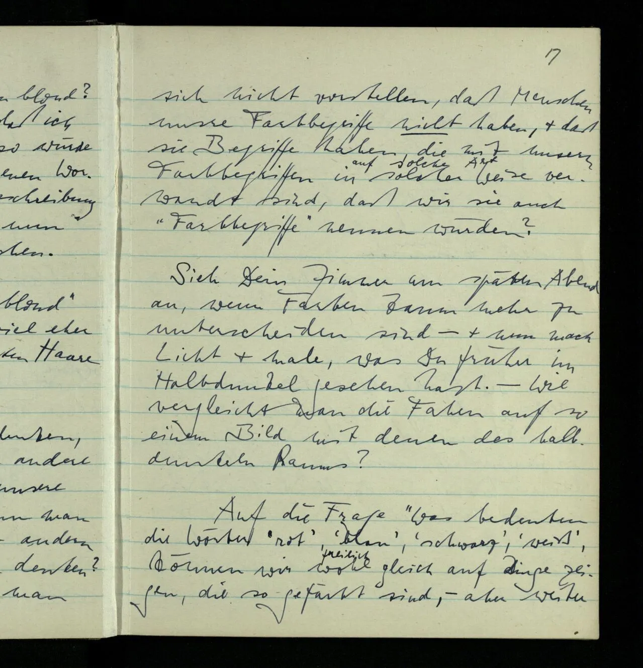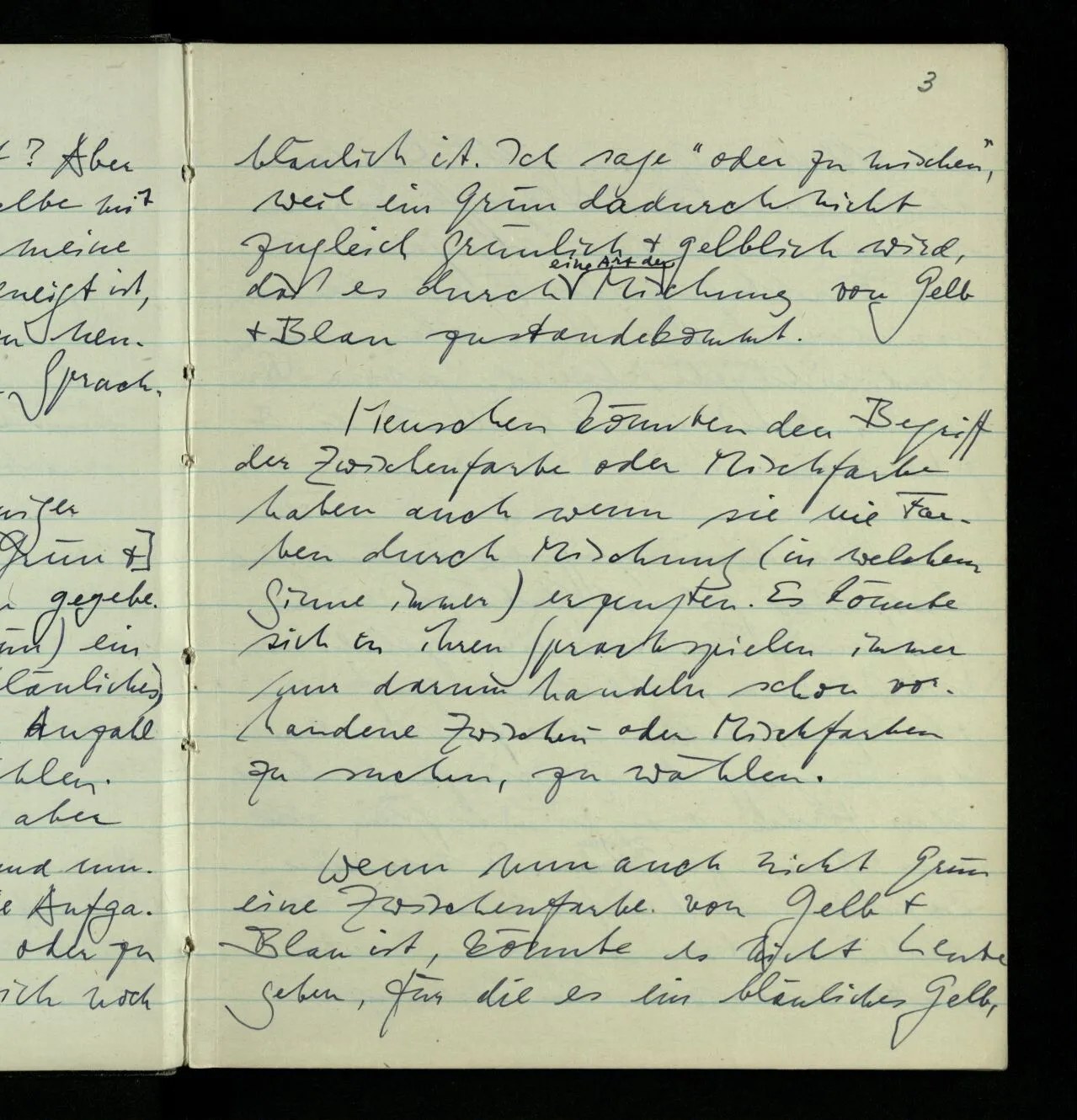 Wenn nun auch nicht Grün eine Zwischenfarbe von Gelb & Blau ist, könnte es nicht Leute geben, für die es ein bläuliches Gelb, ein rötliches Grün gibt? Leute also, deren Farbbegriffe von den unsern abwichen – da ja auch die Farbbegriffe der Farbenblinden von denen der Normalen abweichen. Und nicht jede Abweichung vom Normalen muß eine Blindheit, ein Defekt sein.