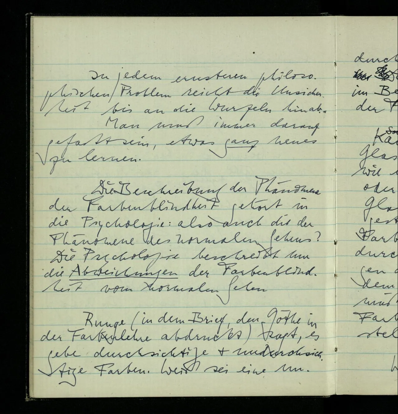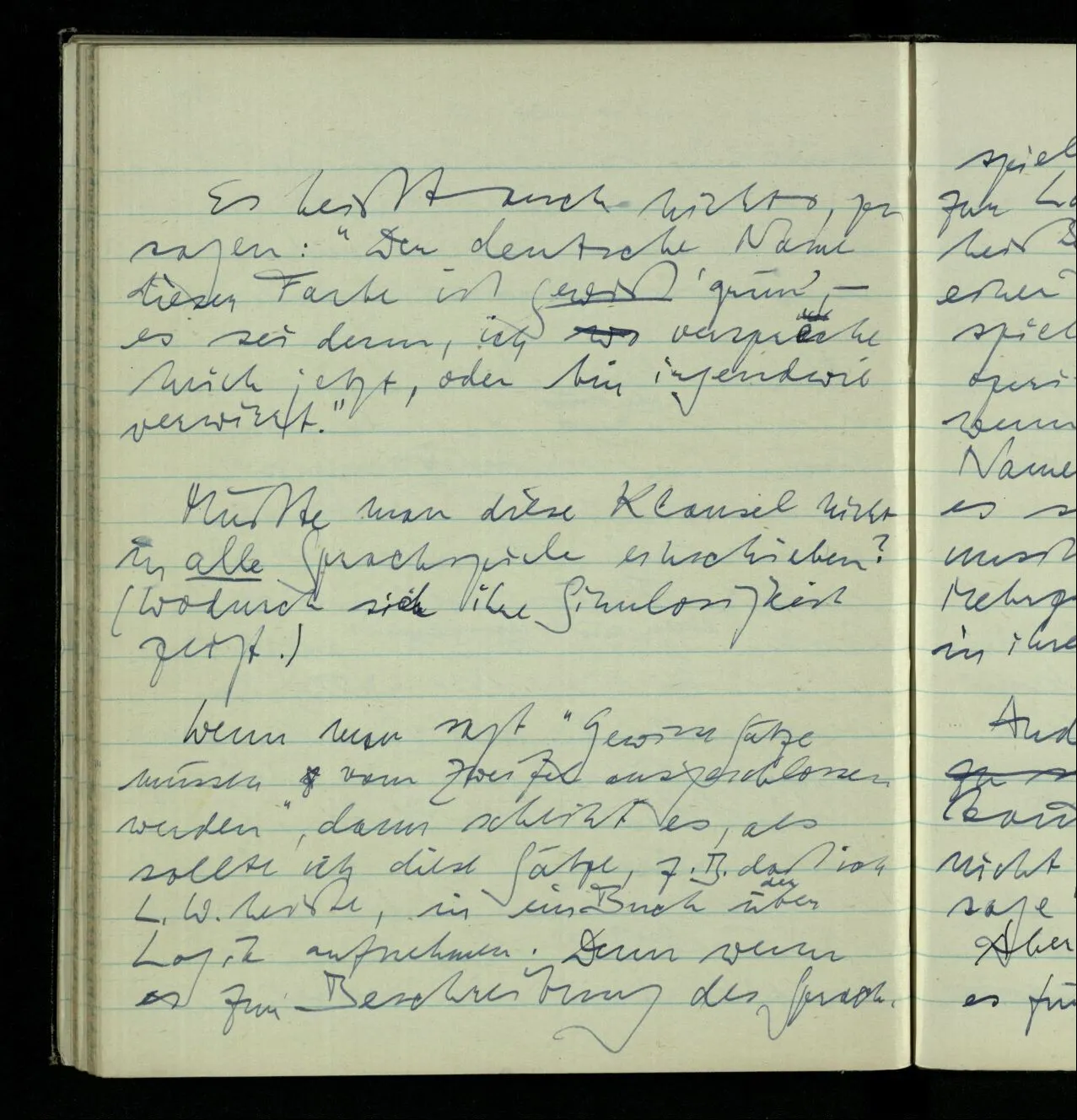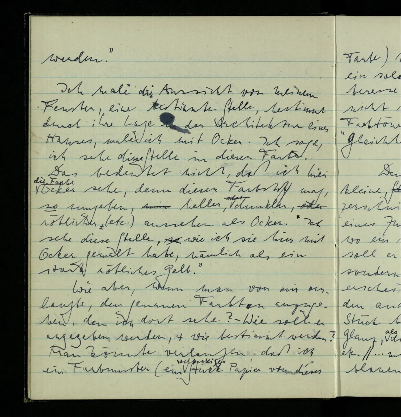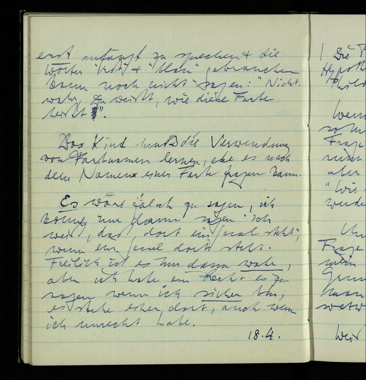 Wenn nun auch nicht Grün eine Zwischenfarbe von Gelb & Blau ist, könnte es nicht Leute geben, für die es ein bläuliches Gelb, ein rötliches Grün gibt? Leute also, deren Farbbegriffe von den unsern abwichen – da ja auch die Farbbegriffe der Farbenblinden von denen der Normalen abweichen. Und nicht jede Abweichung vom Normalen muß eine Blindheit, ein Defekt sein.