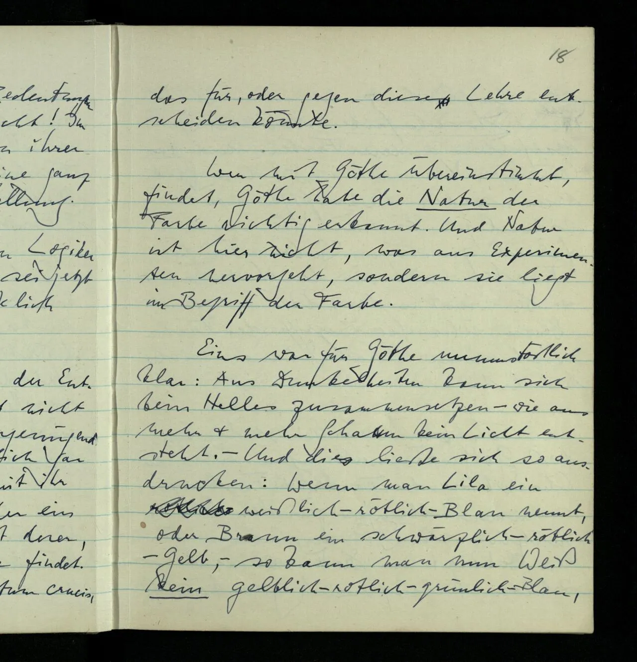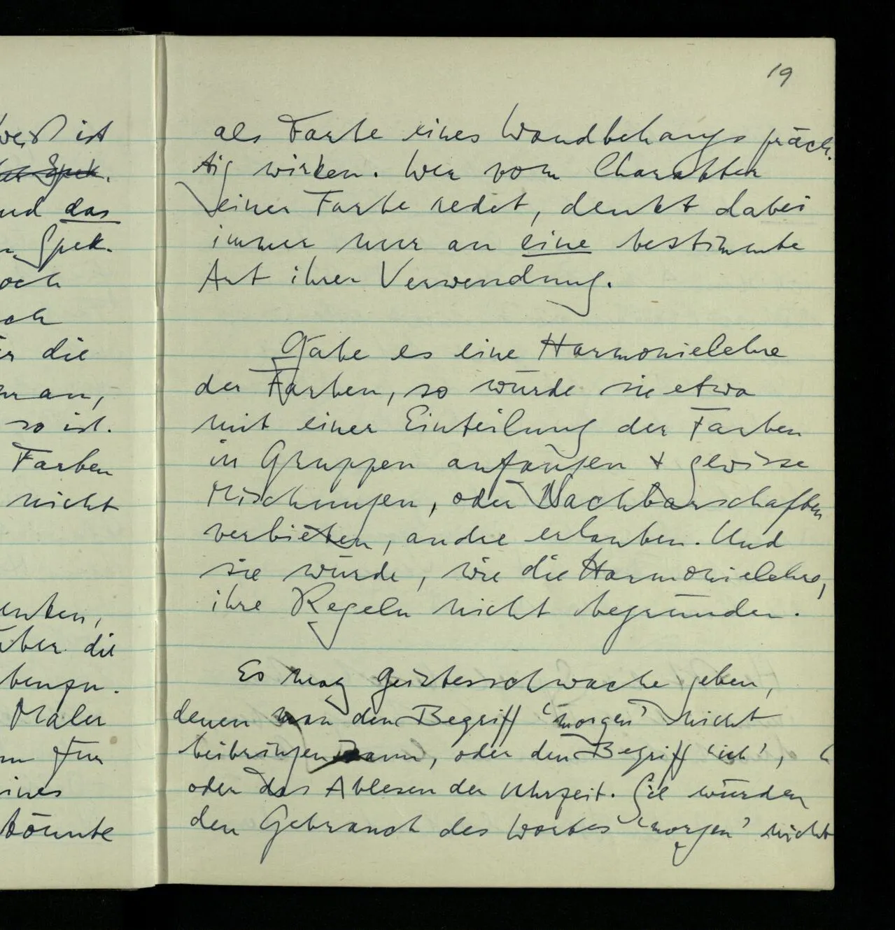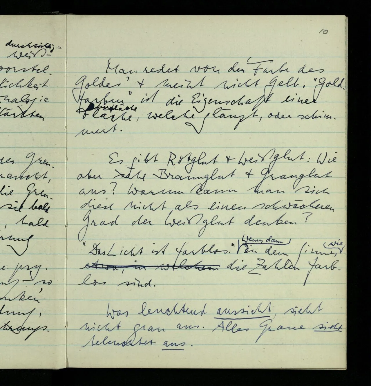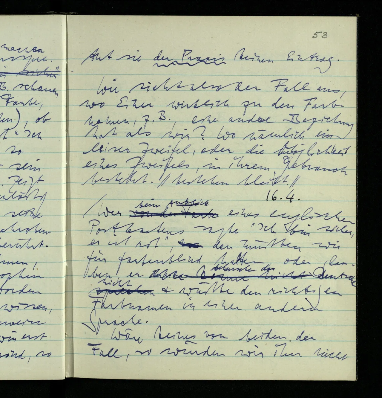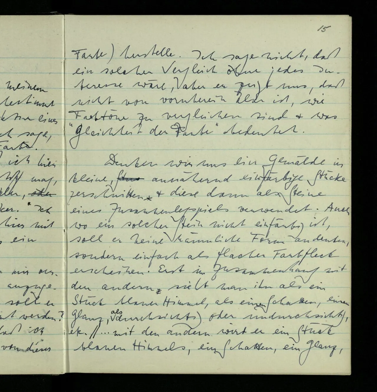 Wenn nun auch nicht Grün eine Zwischenfarbe von Gelb & Blau ist, könnte es nicht Leute geben, für die es ein bläuliches Gelb, ein rötliches Grün gibt? Leute also, deren Farbbegriffe von den unsern abwichen – da ja auch die Farbbegriffe der Farbenblinden von denen der Normalen abweichen. Und nicht jede Abweichung vom Normalen muß eine Blindheit, ein Defekt sein.