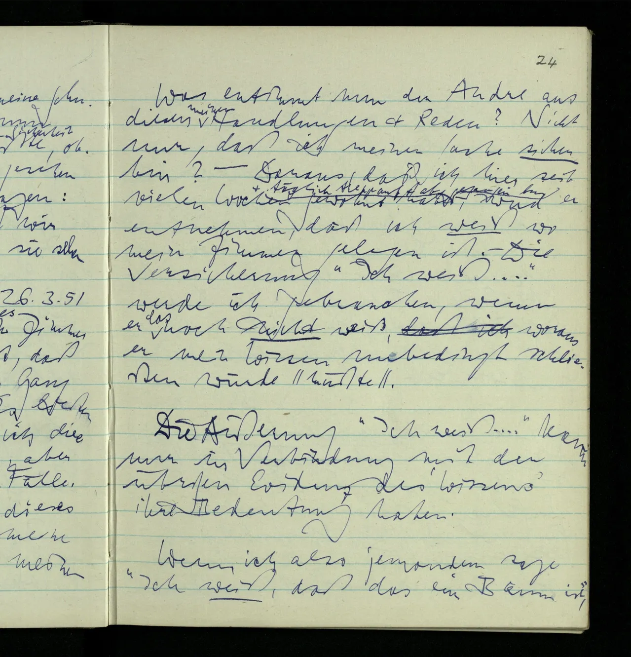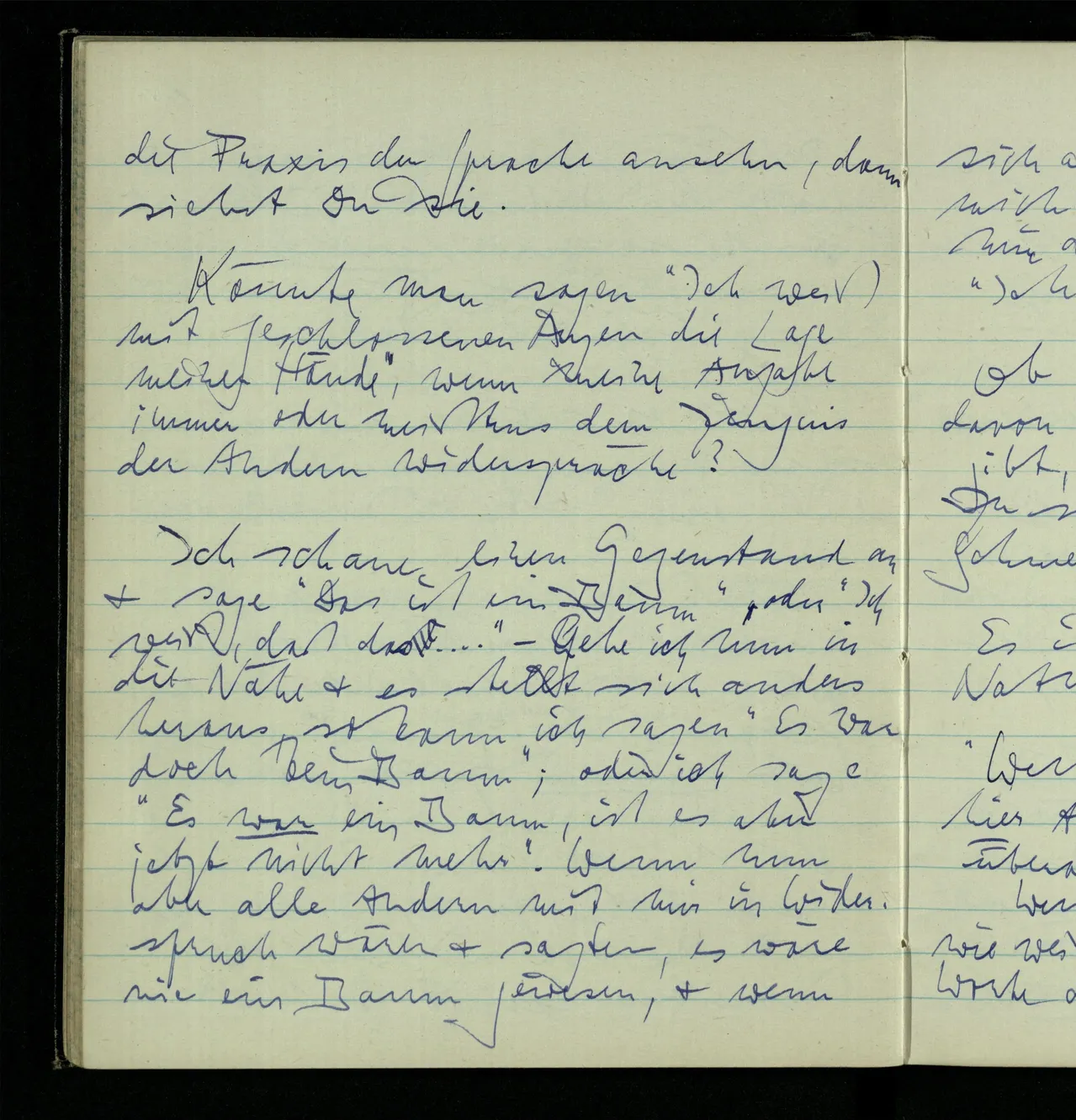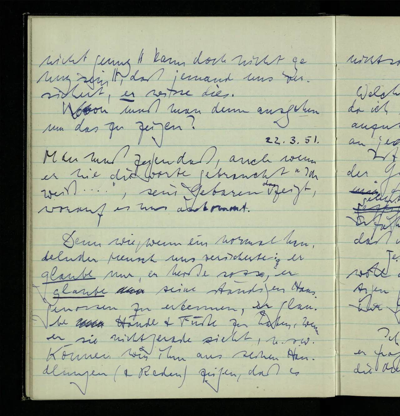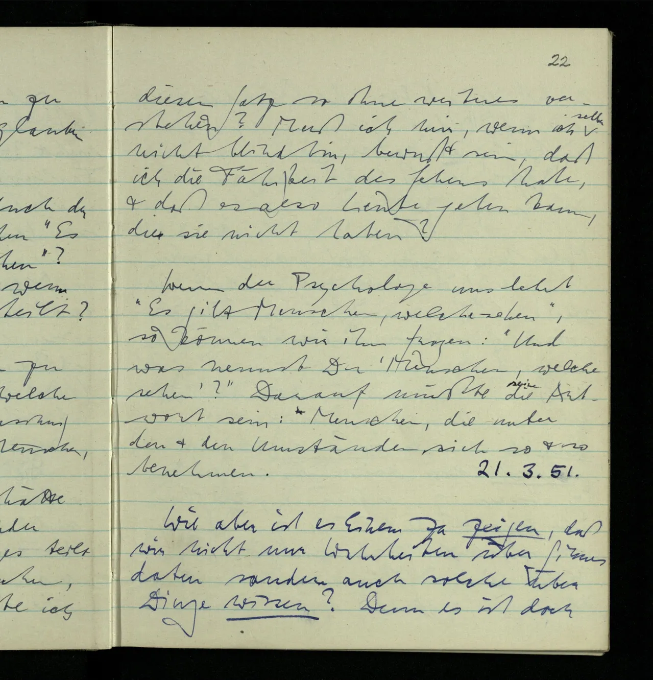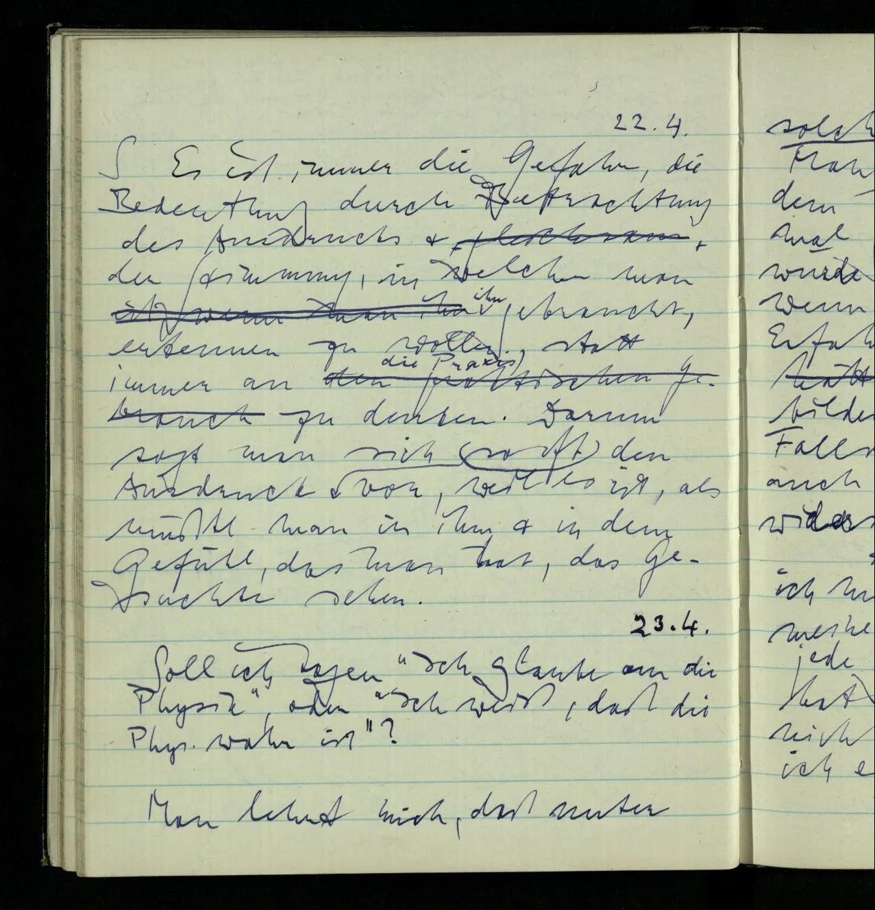 22.04.1951 Es ist immer die Gefahr, die Bedeutung durch Betrachtung des Ausdrucks & der Stimmung, in welcher man ihn gebraucht, erkennen zu wollen, statt immer an die Praxis zu denken. Darum sagt man sich den Ausdruck so oft vor, weil es ist, als müßte man in ihm & in dem Gefühl, das man hat, das Gesuchte sehen.