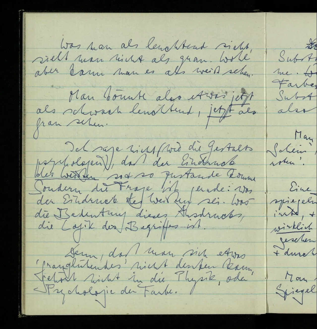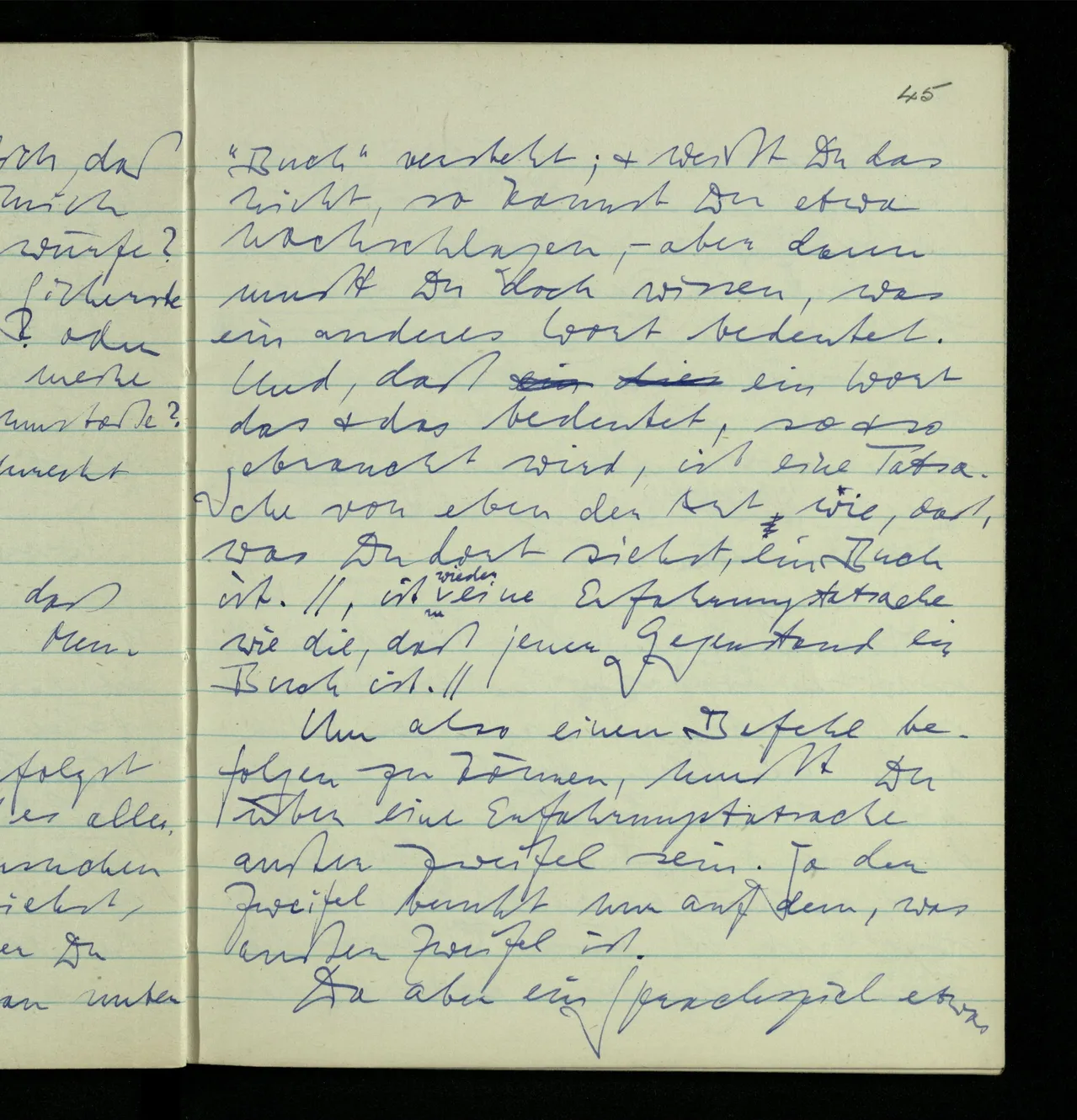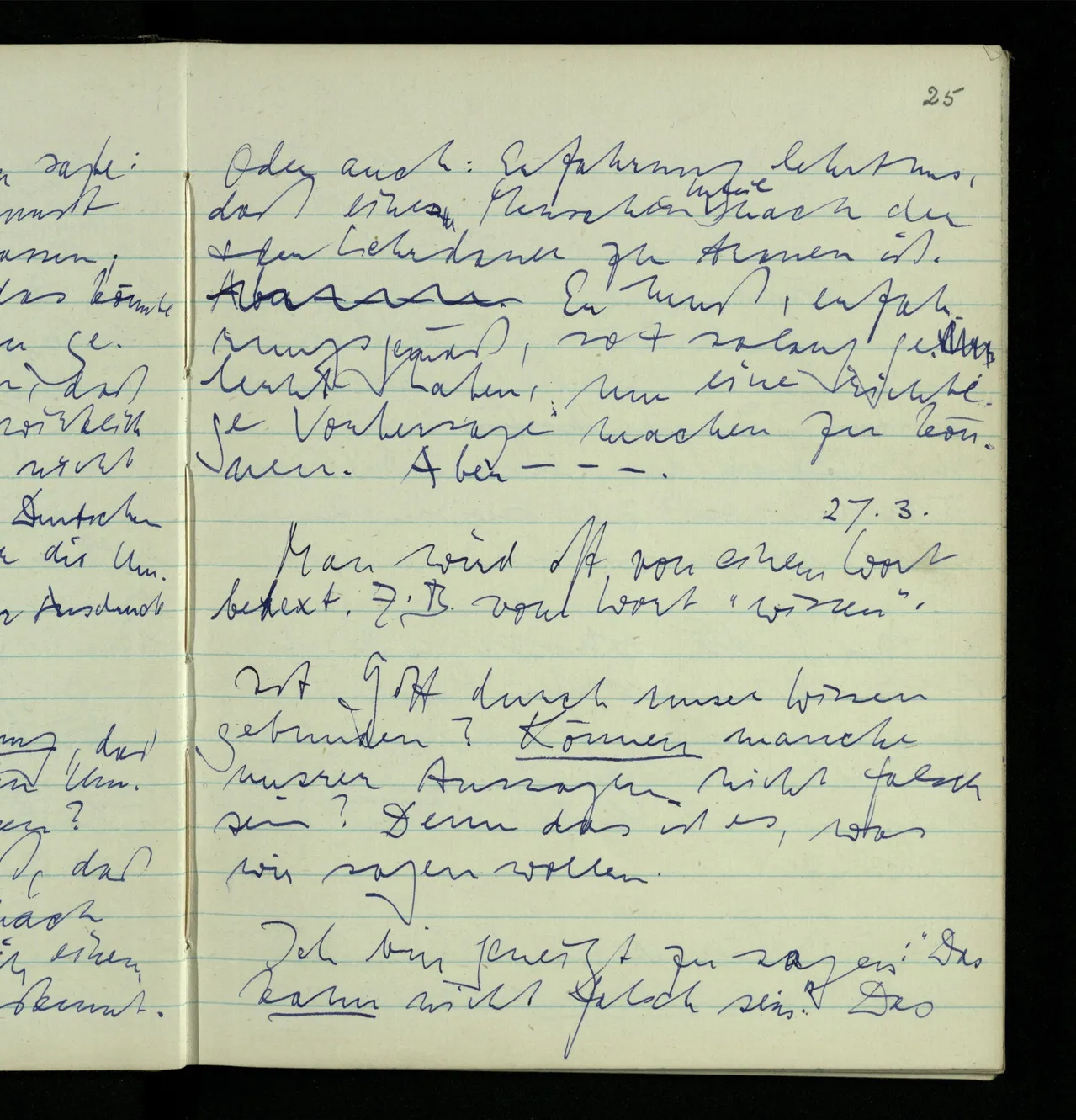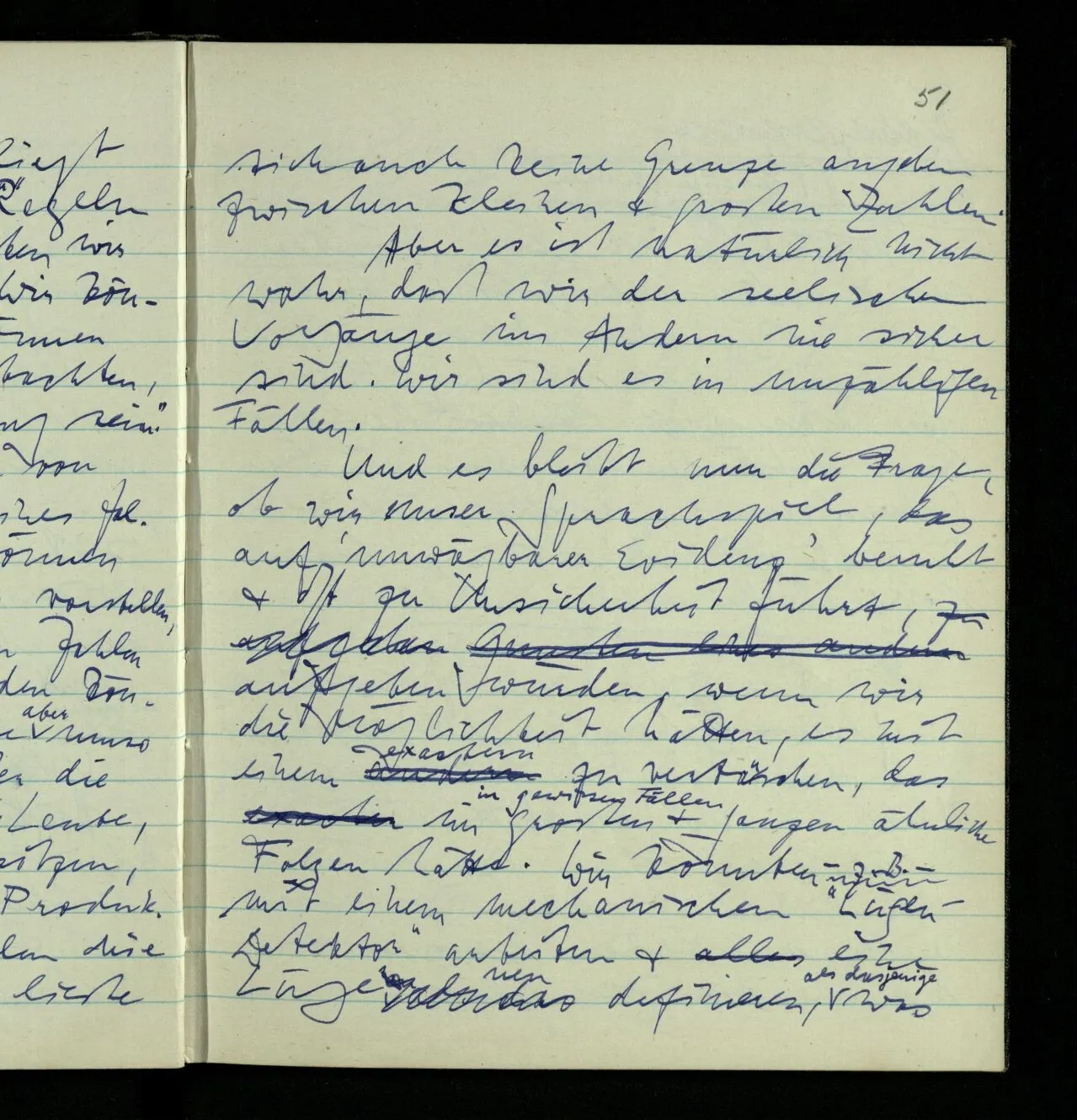 22.04.1951 Es ist immer die Gefahr, die Bedeutung durch Betrachtung des Ausdrucks & der Stimmung, in welcher man ihn gebraucht, erkennen zu wollen, statt immer an die Praxis zu denken. Darum sagt man sich den Ausdruck so oft vor, weil es ist, als müßte man in ihm & in dem Gefühl, das man hat, das Gesuchte sehen.