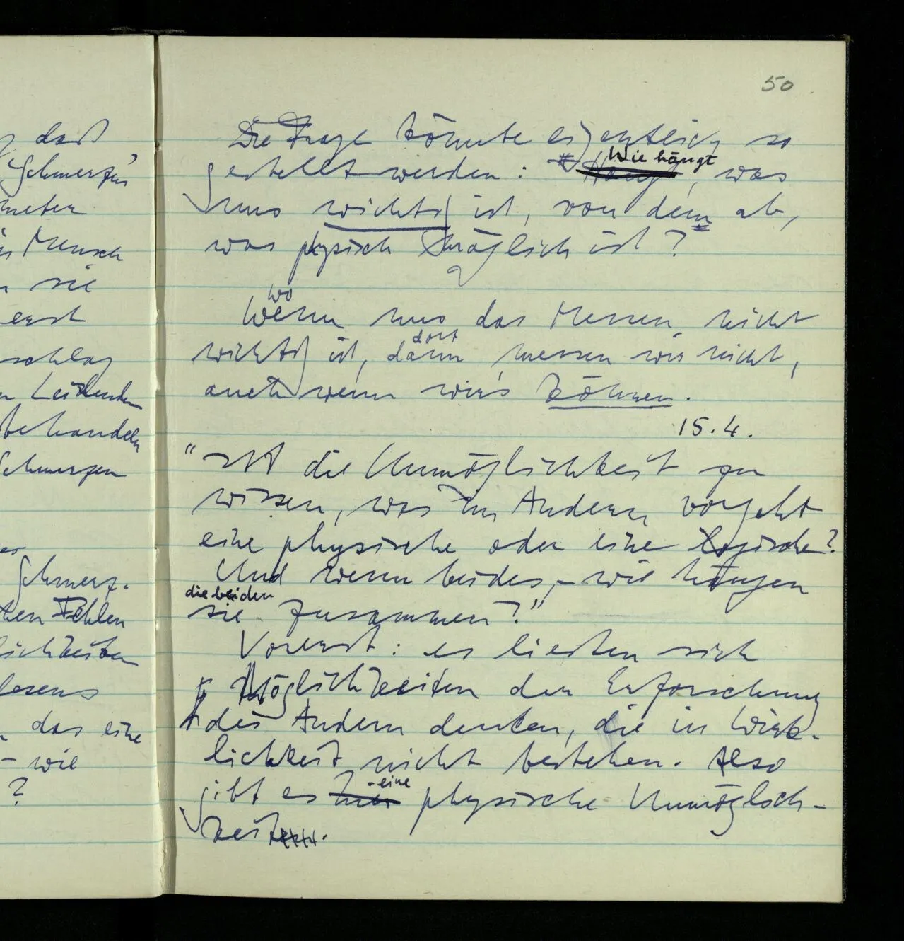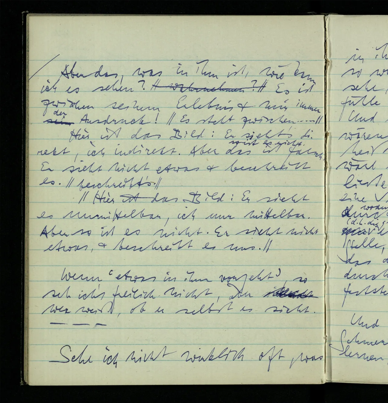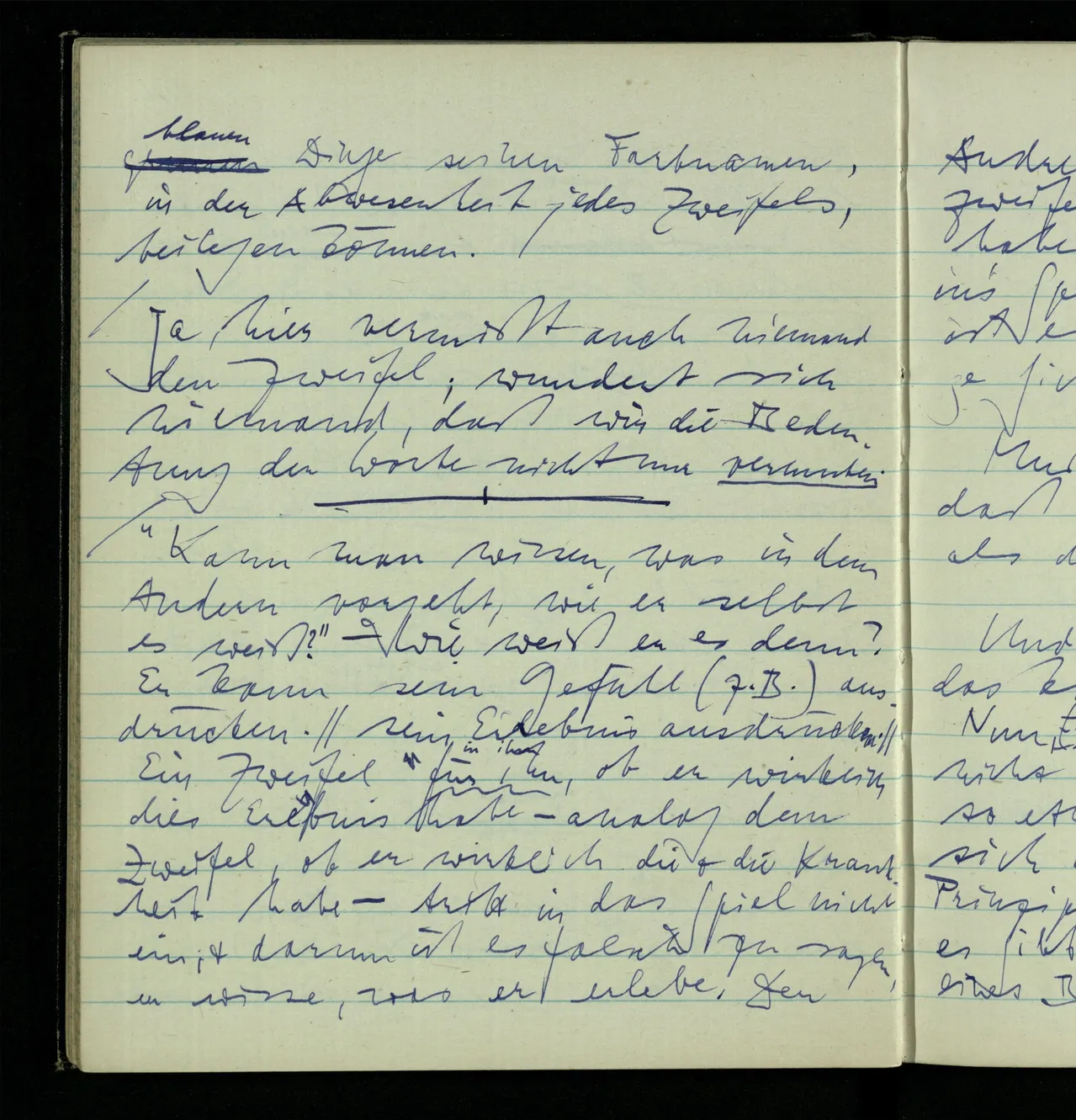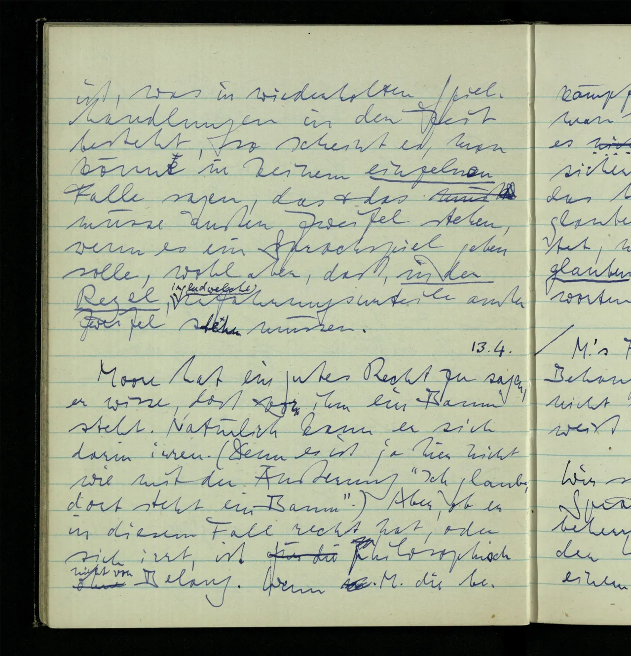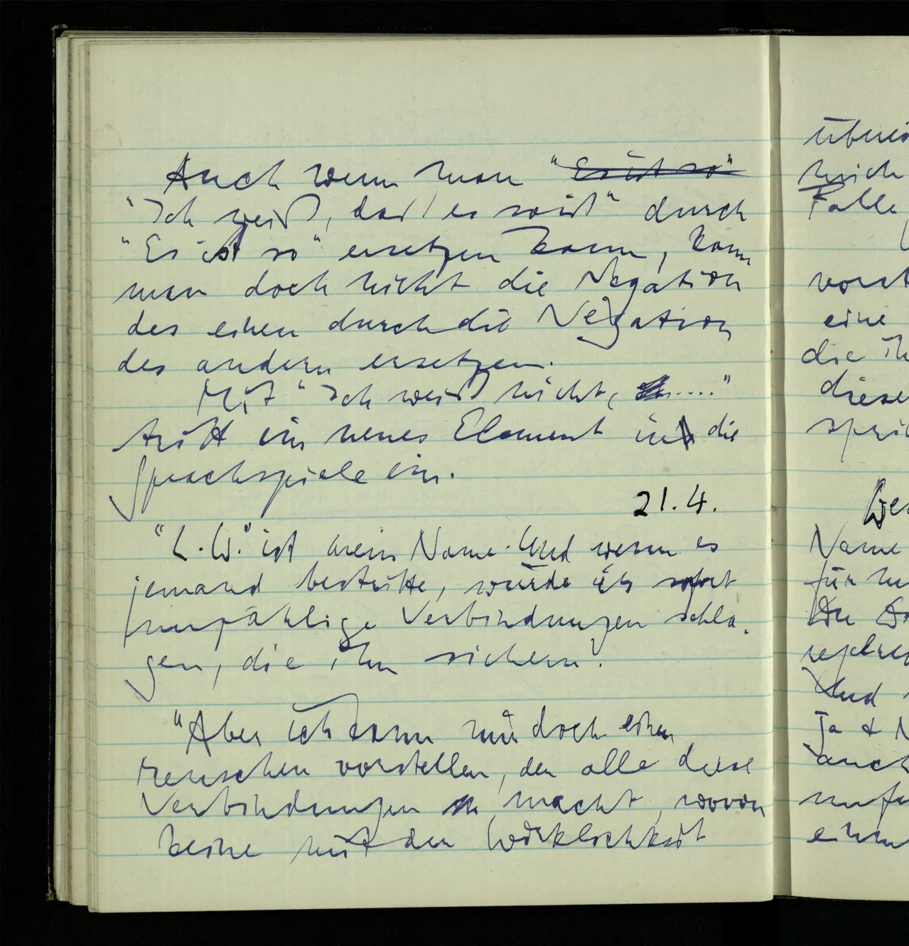 22.04.1951 Es ist immer die Gefahr, die Bedeutung durch Betrachtung des Ausdrucks & der Stimmung, in welcher man ihn gebraucht, erkennen zu wollen, statt immer an die Praxis zu denken. Darum sagt man sich den Ausdruck so oft vor, weil es ist, als müßte man in ihm & in dem Gefühl, das man hat, das Gesuchte sehen.
