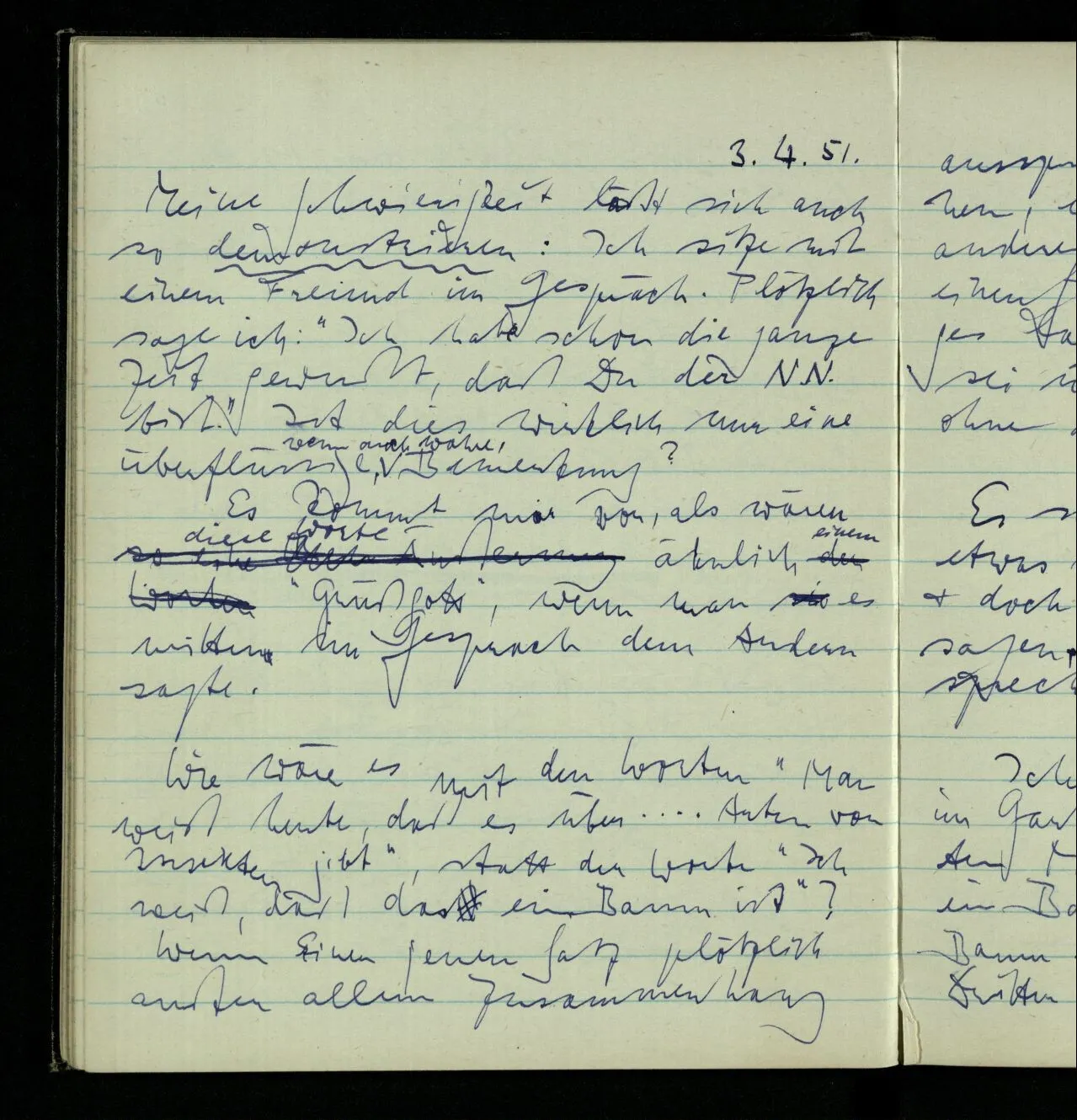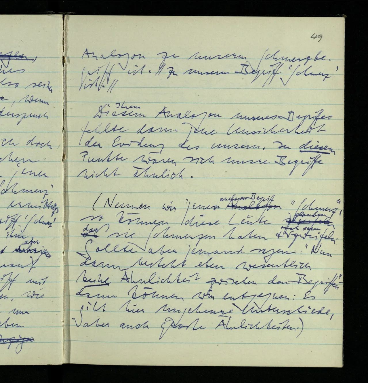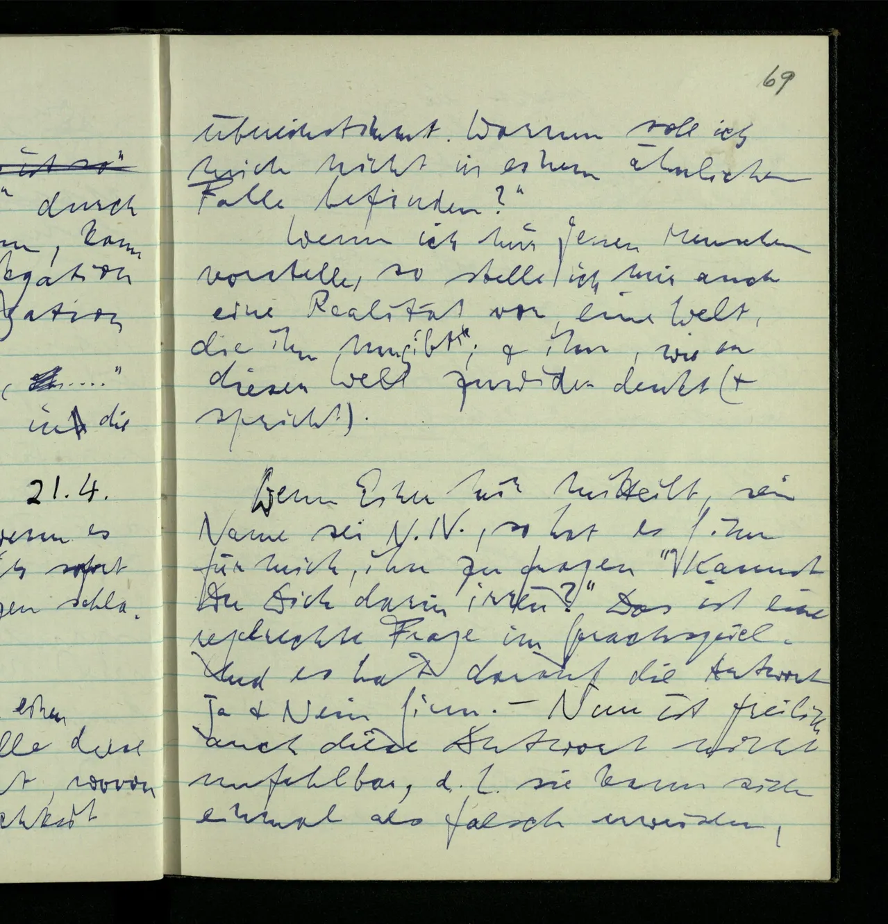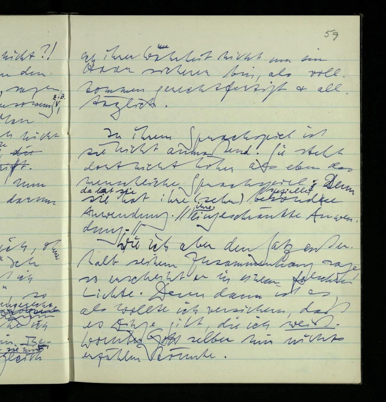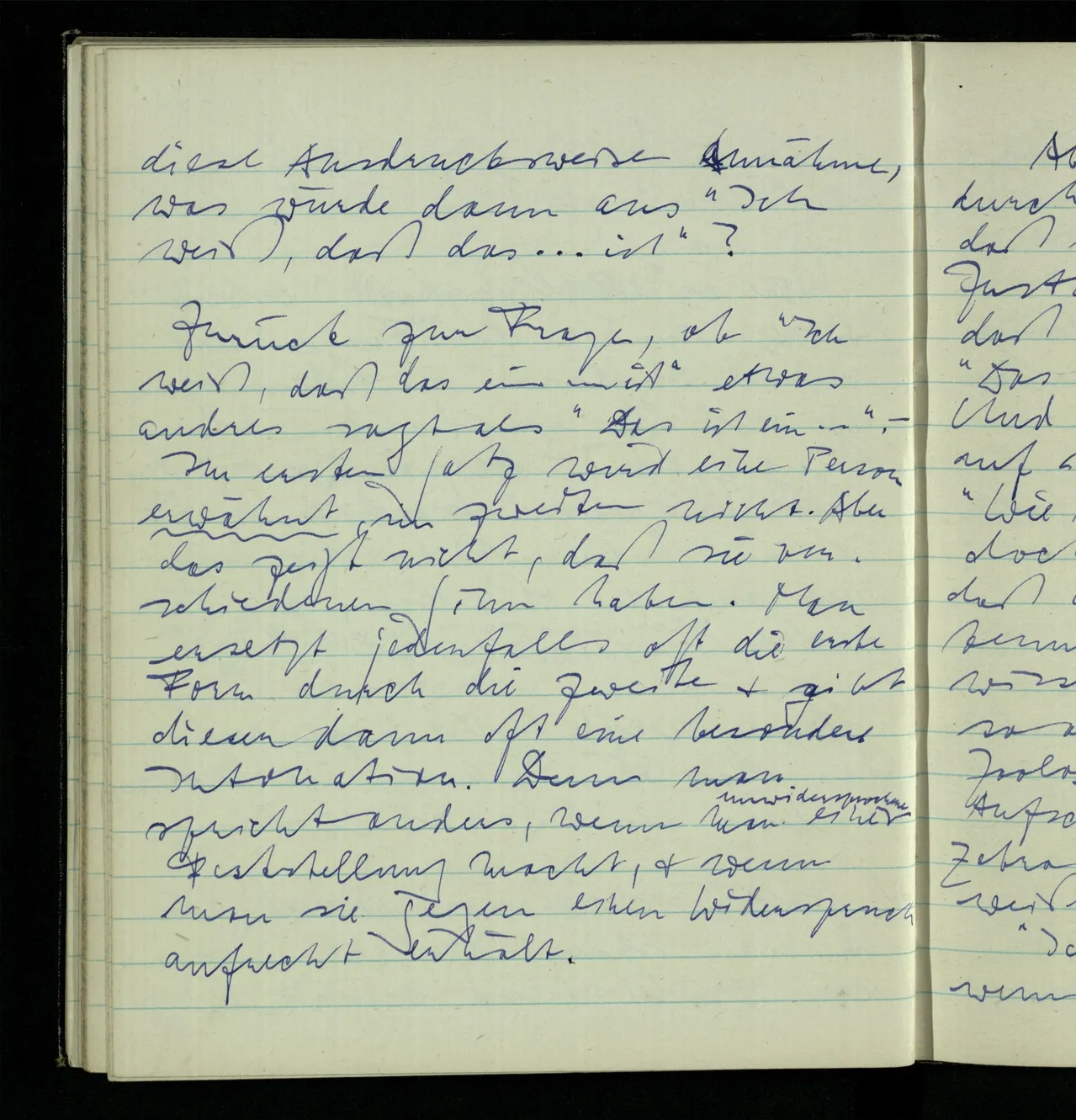 22.04.1951 Es ist immer die Gefahr, die Bedeutung durch Betrachtung des Ausdrucks & der Stimmung, in welcher man ihn gebraucht, erkennen zu wollen, statt immer an die Praxis zu denken. Darum sagt man sich den Ausdruck so oft vor, weil es ist, als müßte man in ihm & in dem Gefühl, das man hat, das Gesuchte sehen.
