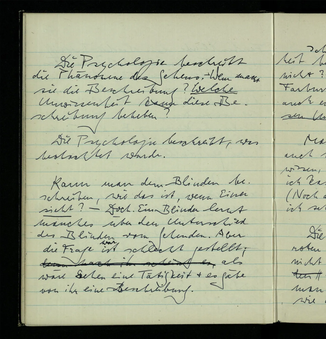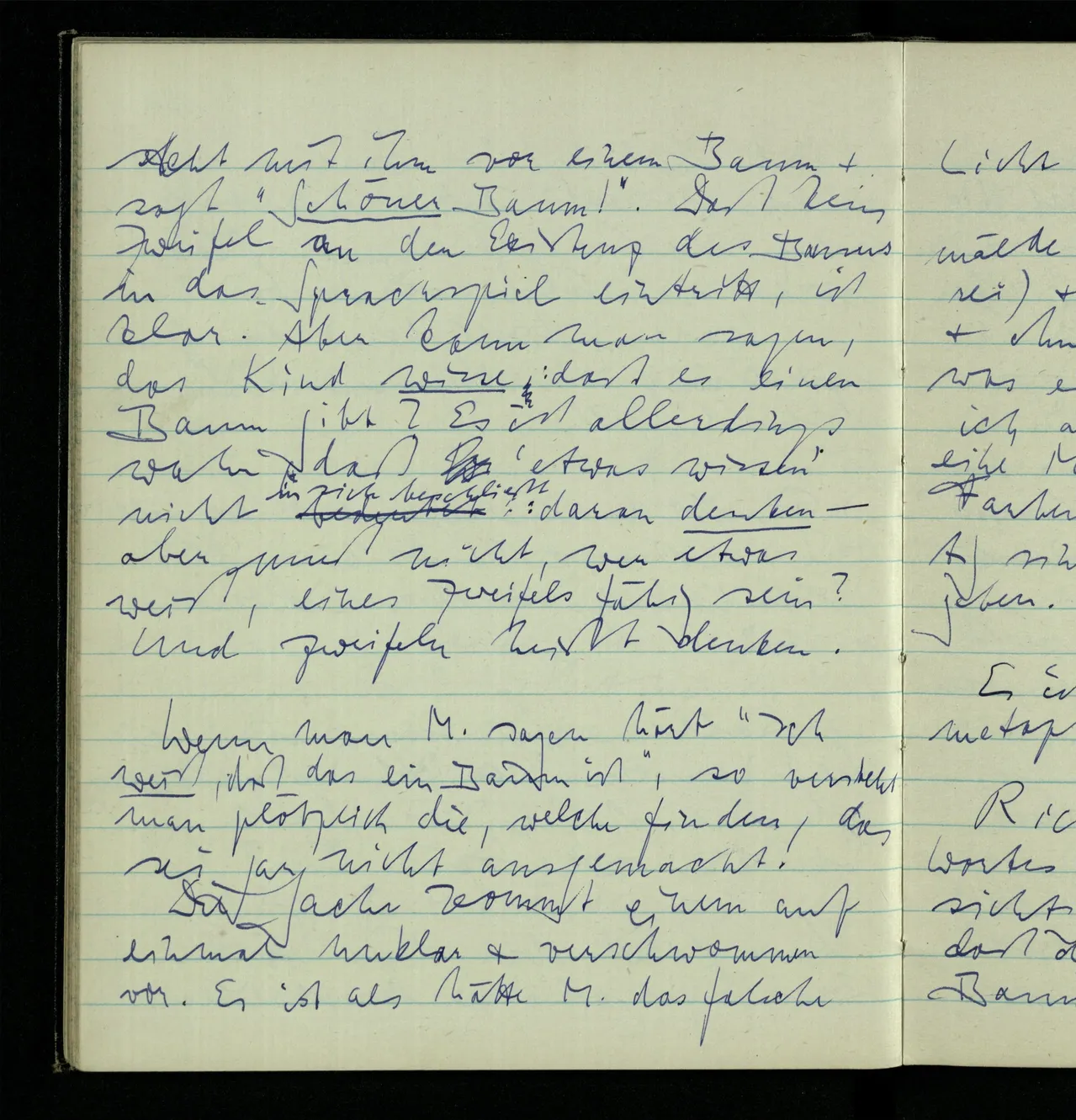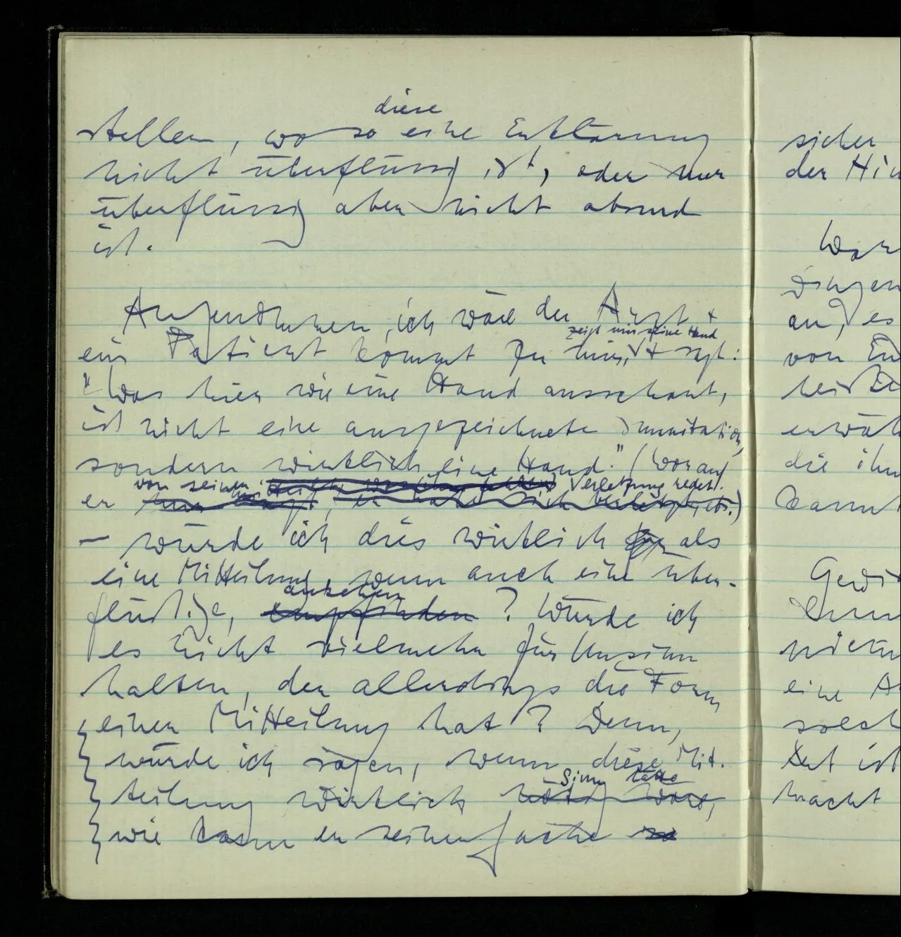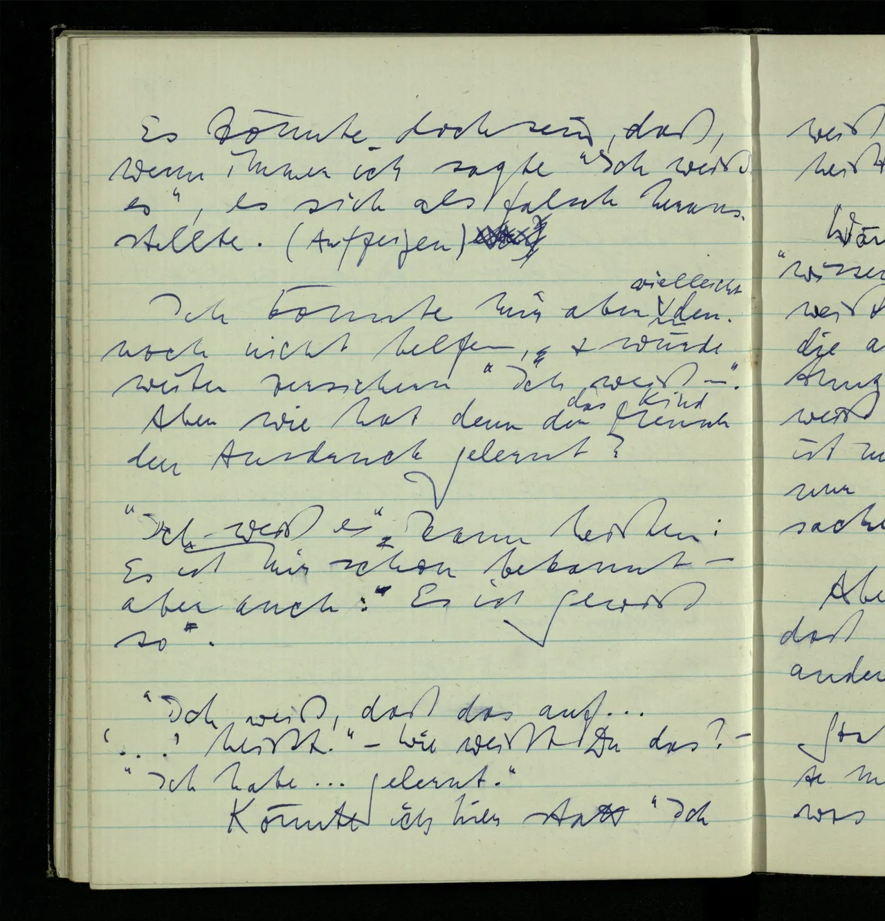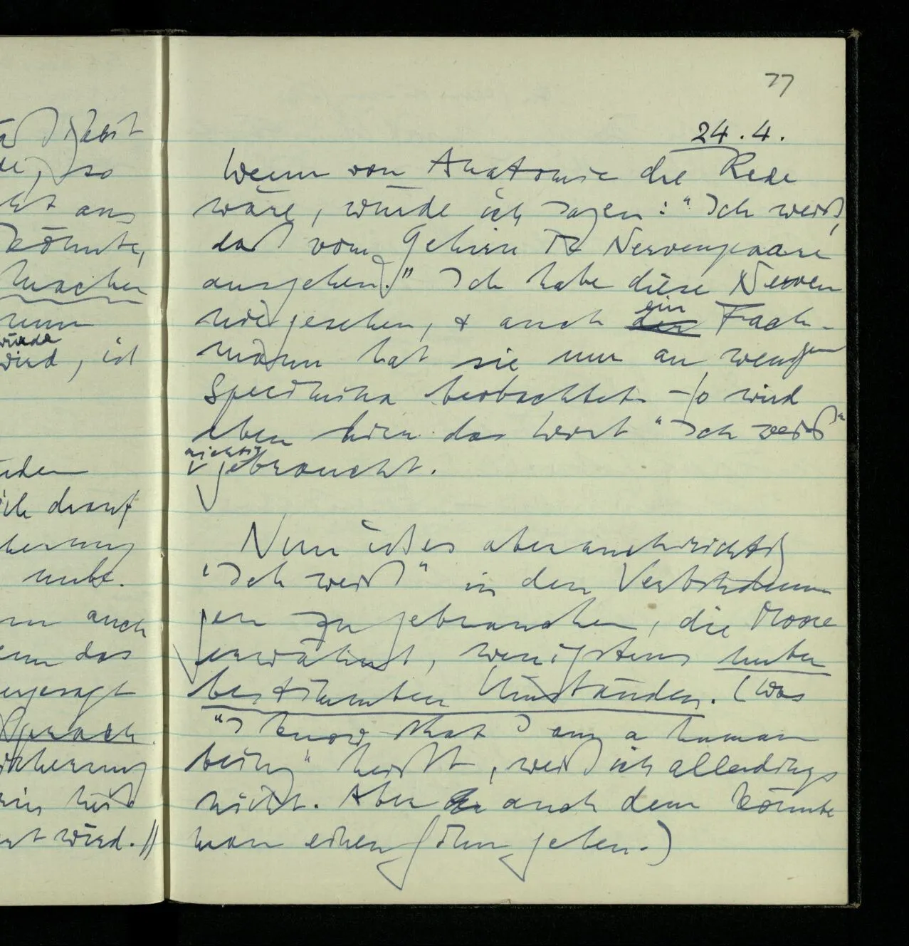 22.04.1951 Es ist immer die Gefahr, die Bedeutung durch Betrachtung des Ausdrucks & der Stimmung, in welcher man ihn gebraucht, erkennen zu wollen, statt immer an die Praxis zu denken. Darum sagt man sich den Ausdruck so oft vor, weil es ist, als müßte man in ihm & in dem Gefühl, das man hat, das Gesuchte sehen.