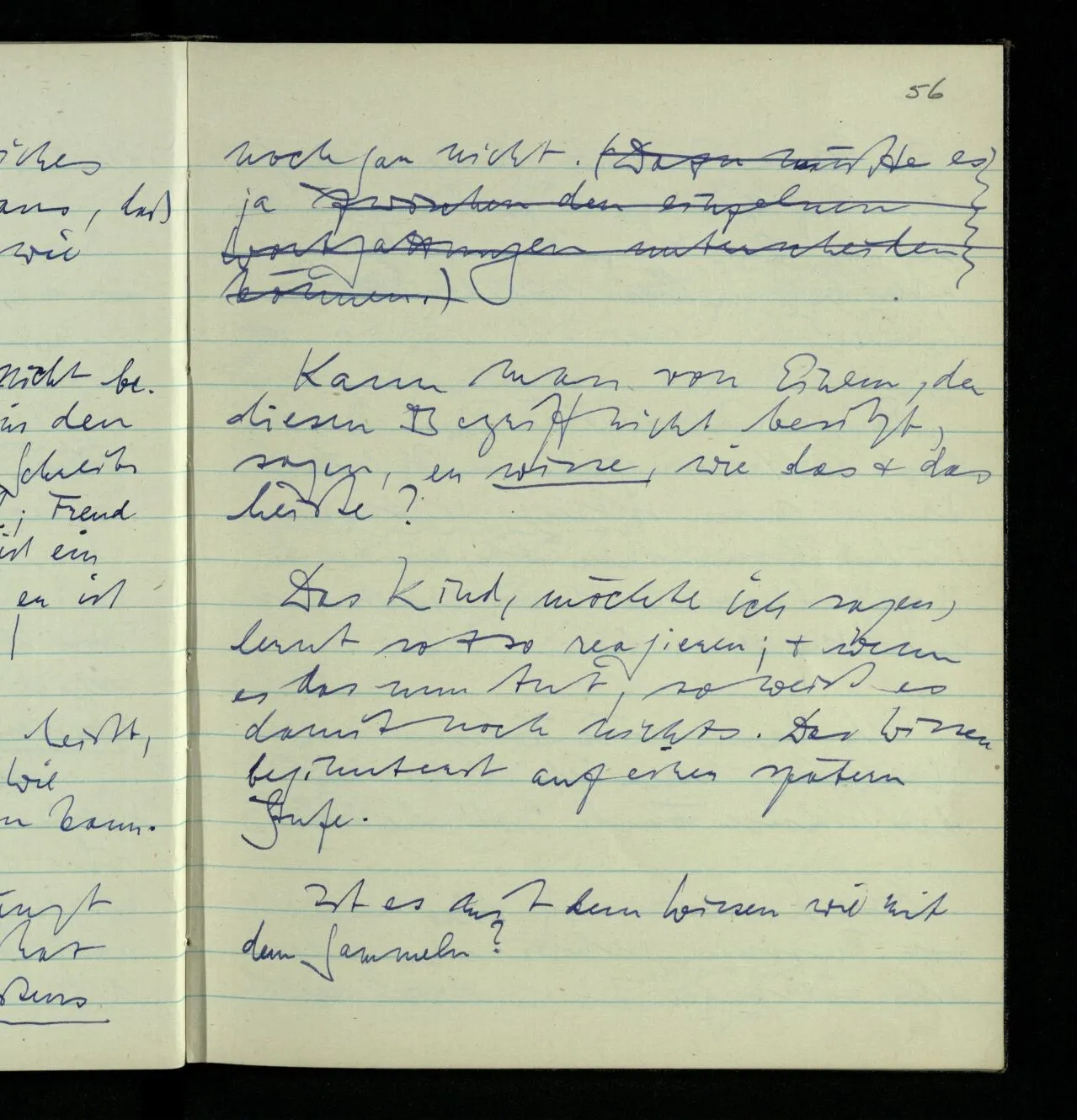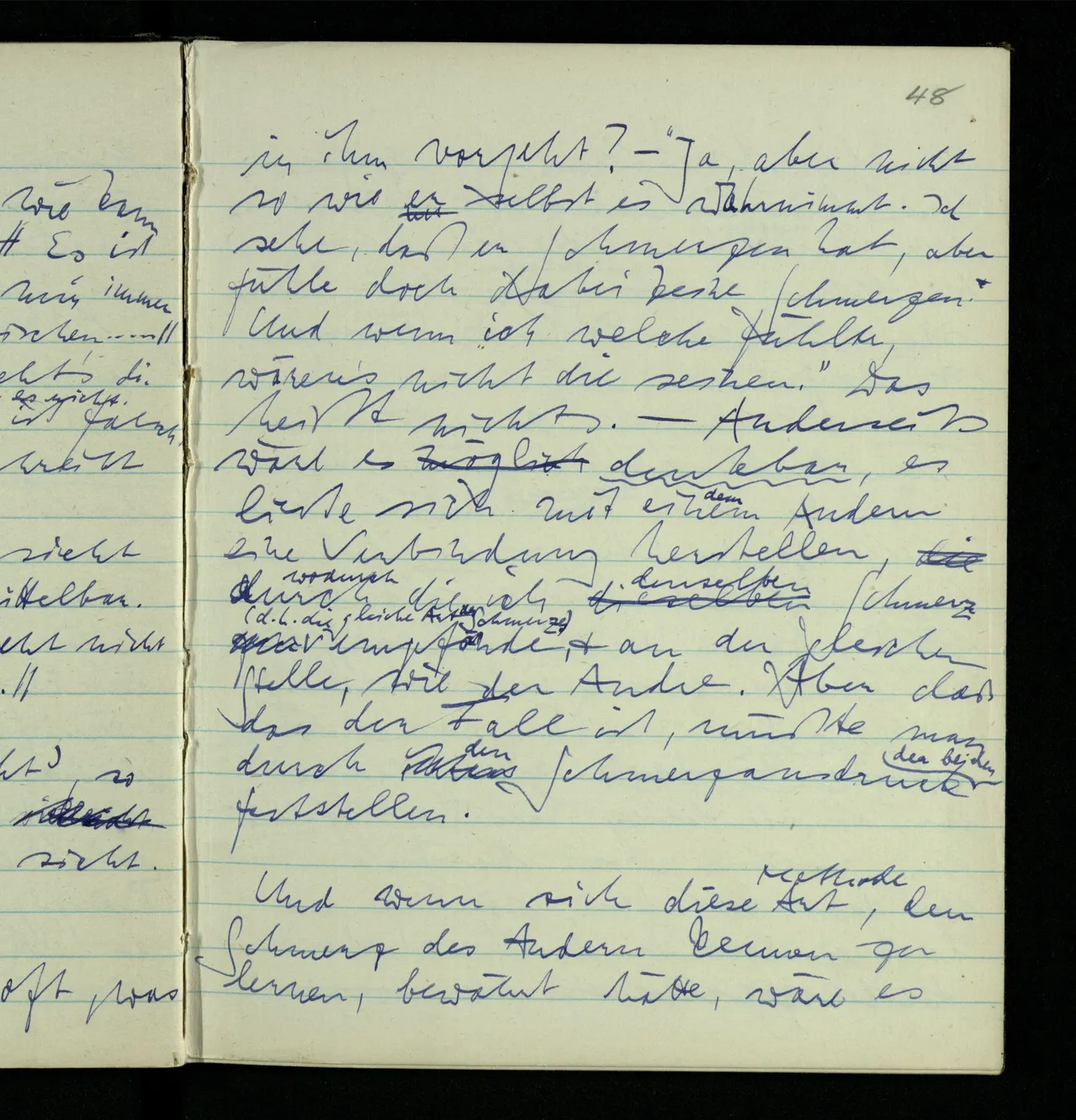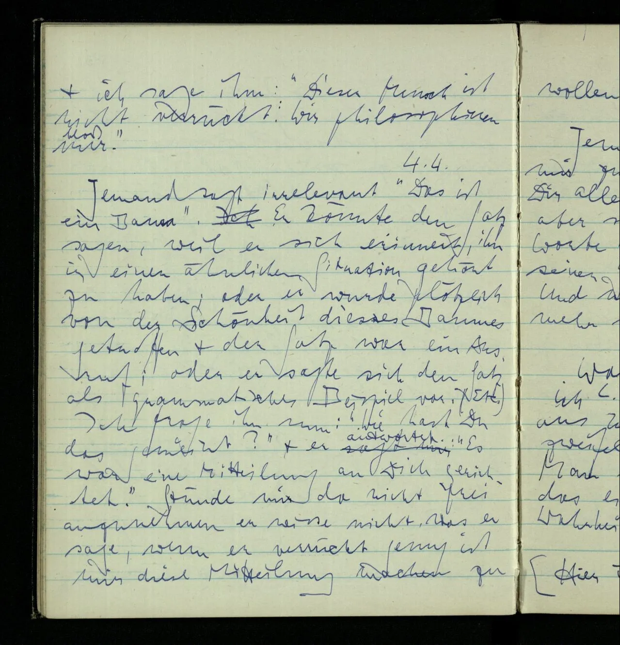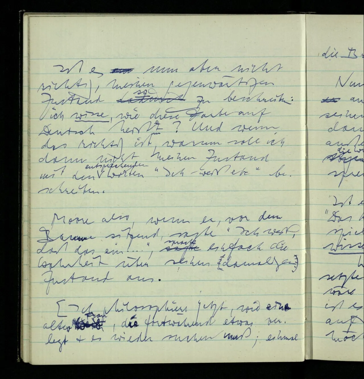 22.04.1951 Es ist immer die Gefahr, die Bedeutung durch Betrachtung des Ausdrucks & der Stimmung, in welcher man ihn gebraucht, erkennen zu wollen, statt immer an die Praxis zu denken. Darum sagt man sich den Ausdruck so oft vor, weil es ist, als müßte man in ihm & in dem Gefühl, das man hat, das Gesuchte sehen.