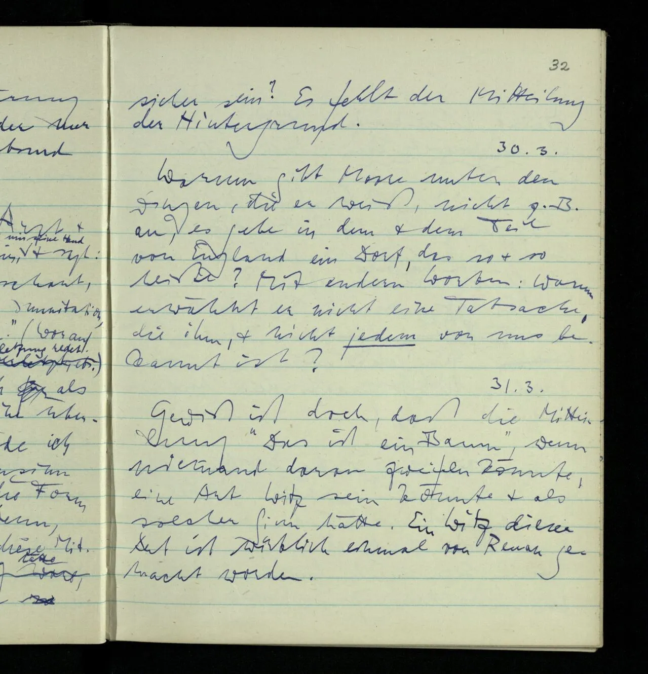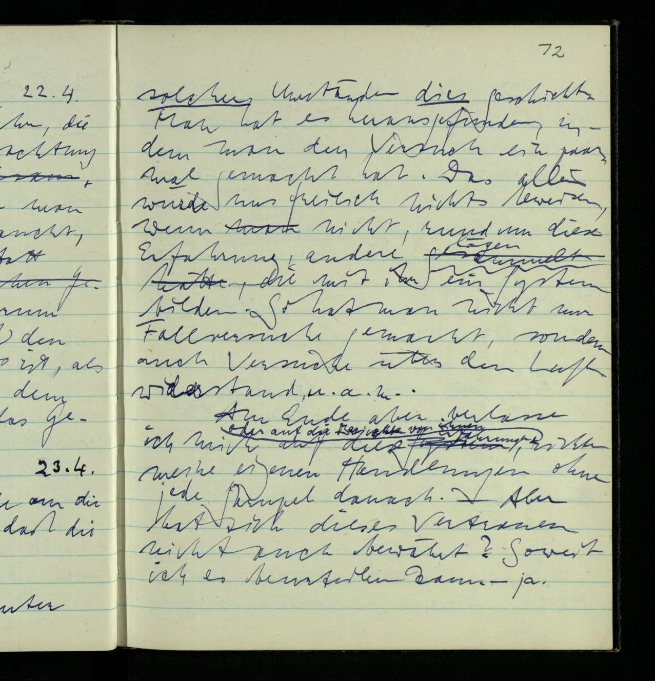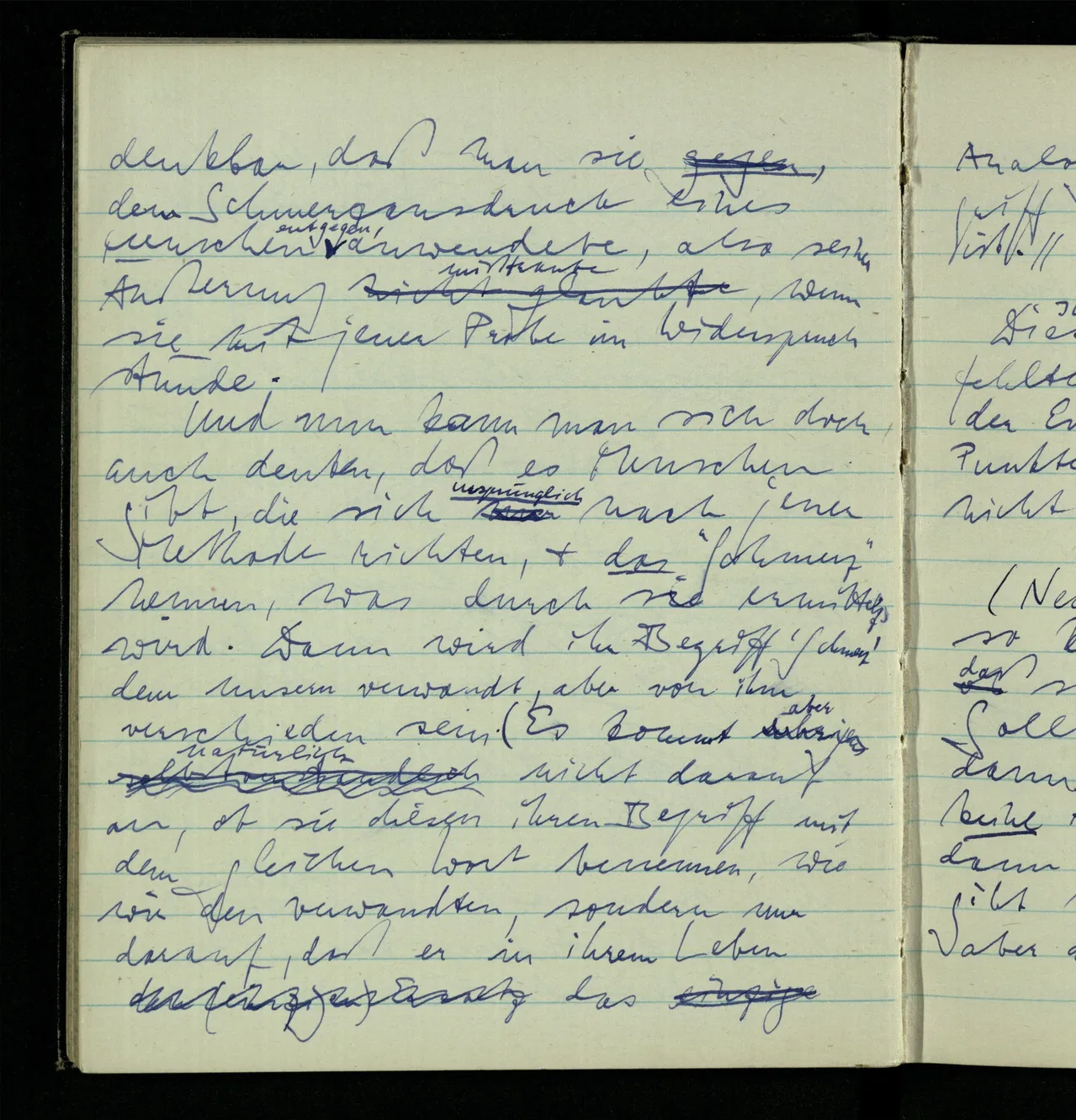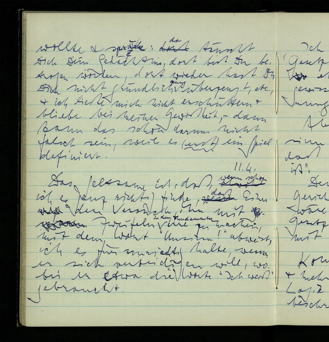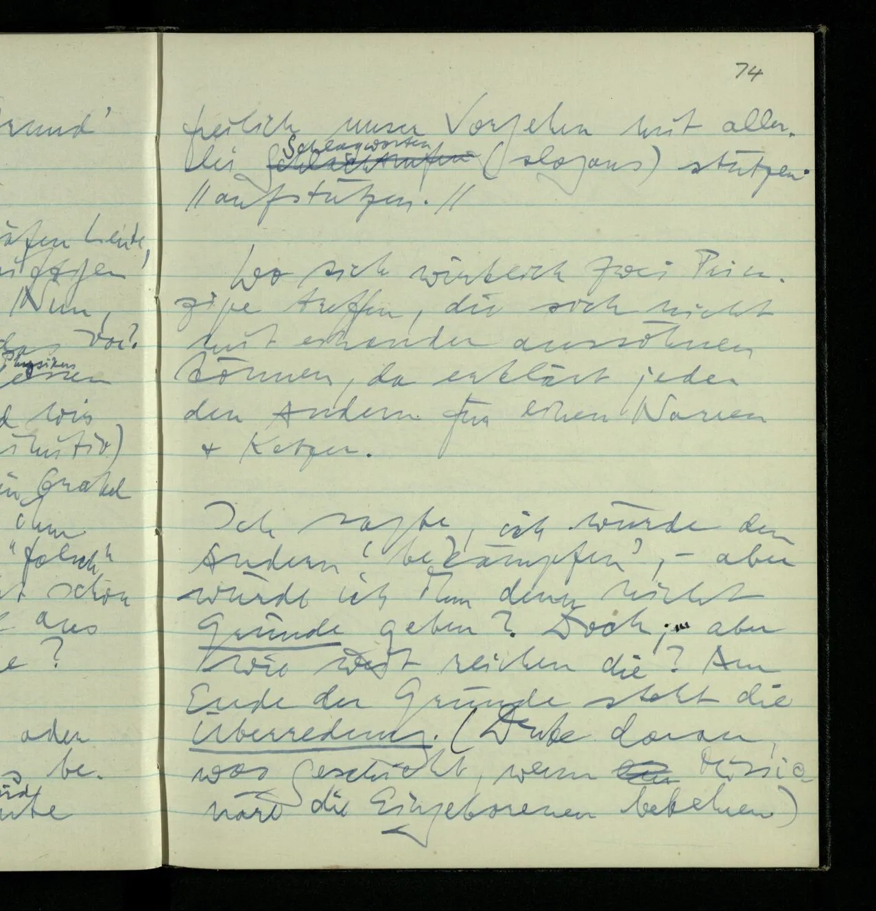 22.04.1951 Es ist immer die Gefahr, die Bedeutung durch Betrachtung des Ausdrucks & der Stimmung, in welcher man ihn gebraucht, erkennen zu wollen, statt immer an die Praxis zu denken. Darum sagt man sich den Ausdruck so oft vor, weil es ist, als müßte man in ihm & in dem Gefühl, das man hat, das Gesuchte sehen.