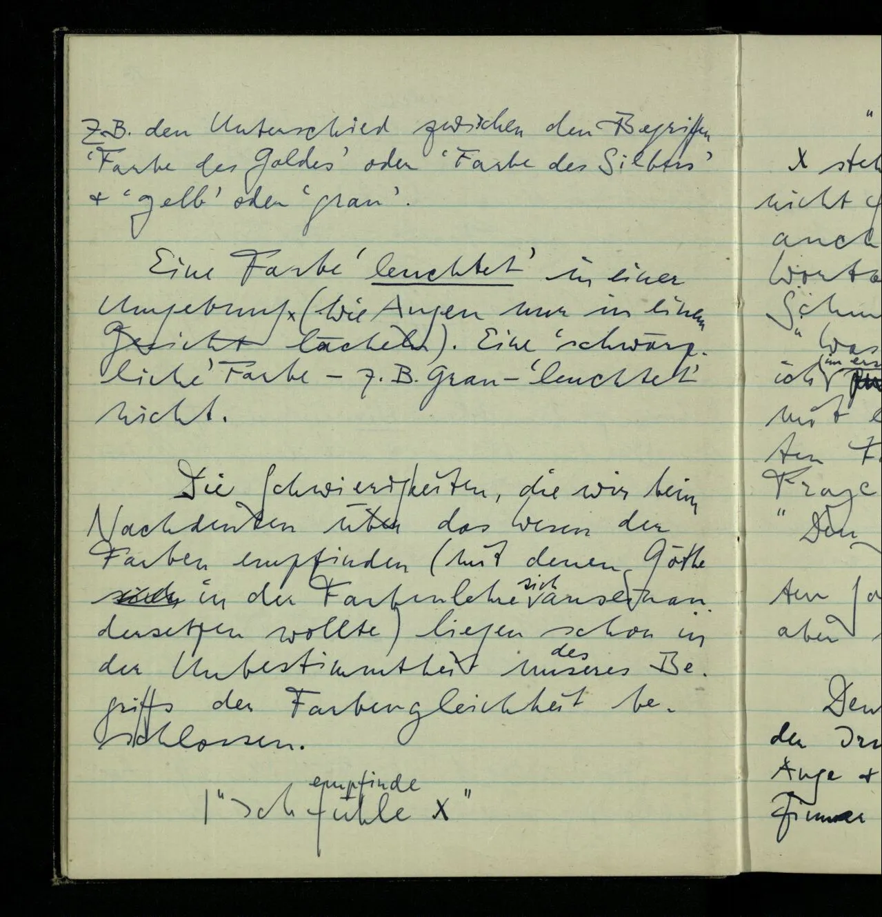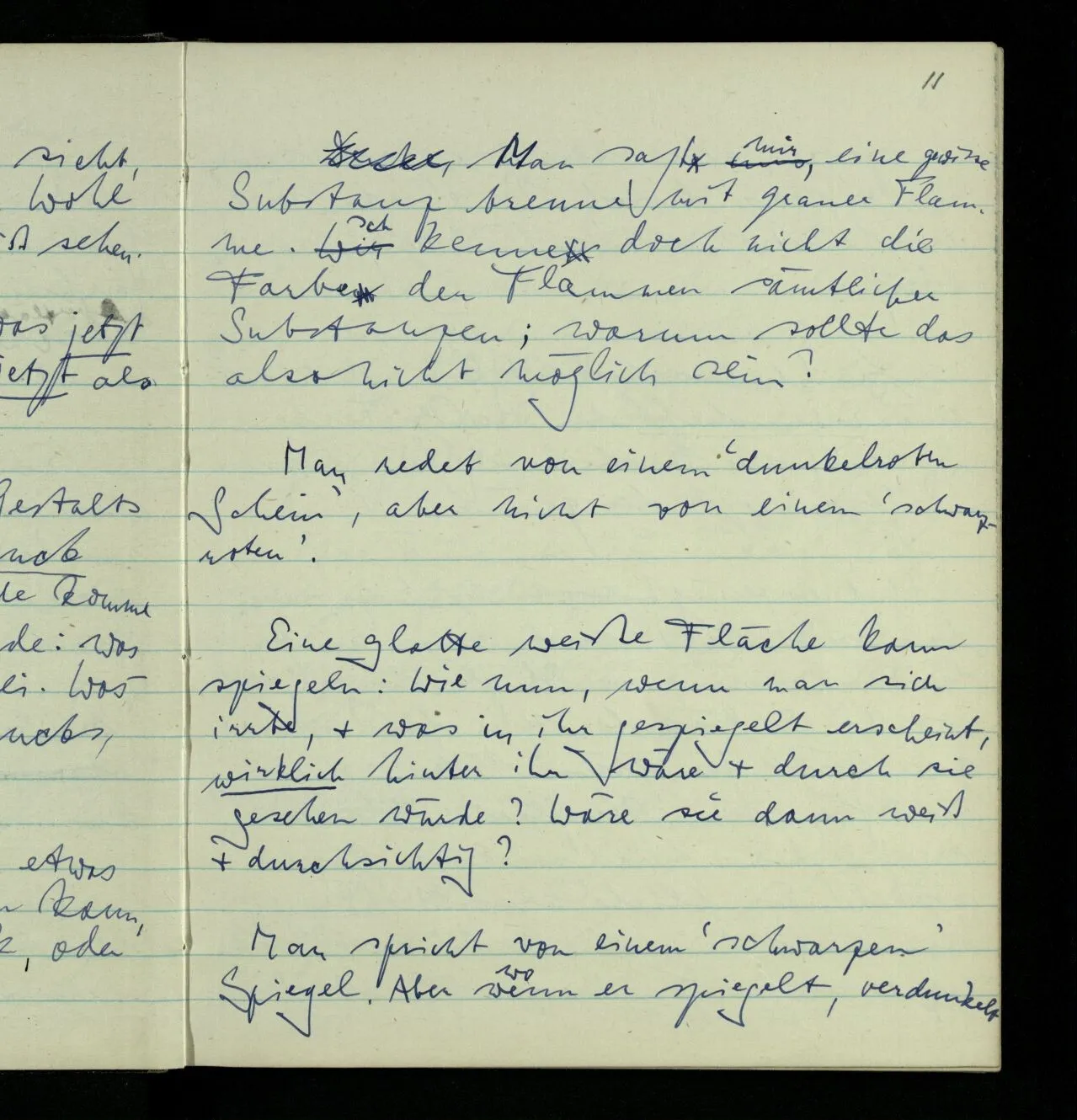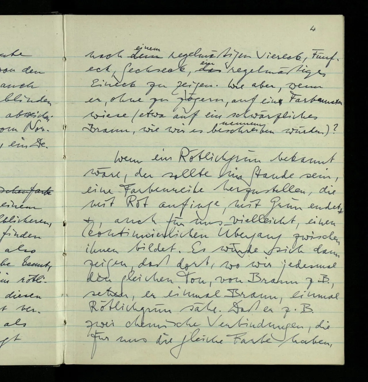 Wem ein Rötlichgrün bekannt wäre, der sollte im Stande sein, eine Farbenreihe herzustellen, die mit Rot anfinge, mit Grün endet &, auch für uns vielleicht, einen kontinuierlichen Übergang zwischen ihnen bildet. Es würde sich dann zeigen, daß dort, wo wir jedesmal den gleichen Ton, von Braun z.B., sehen, er einmal Braun, einmal Rötlichgrün sähe. Daß er z.B. zwei chemische Verbindungen, die für uns die gleiche Farbe haben, nach der Farbe unterscheiden könnte & die eine braun die andre rötlichgrün nennte.