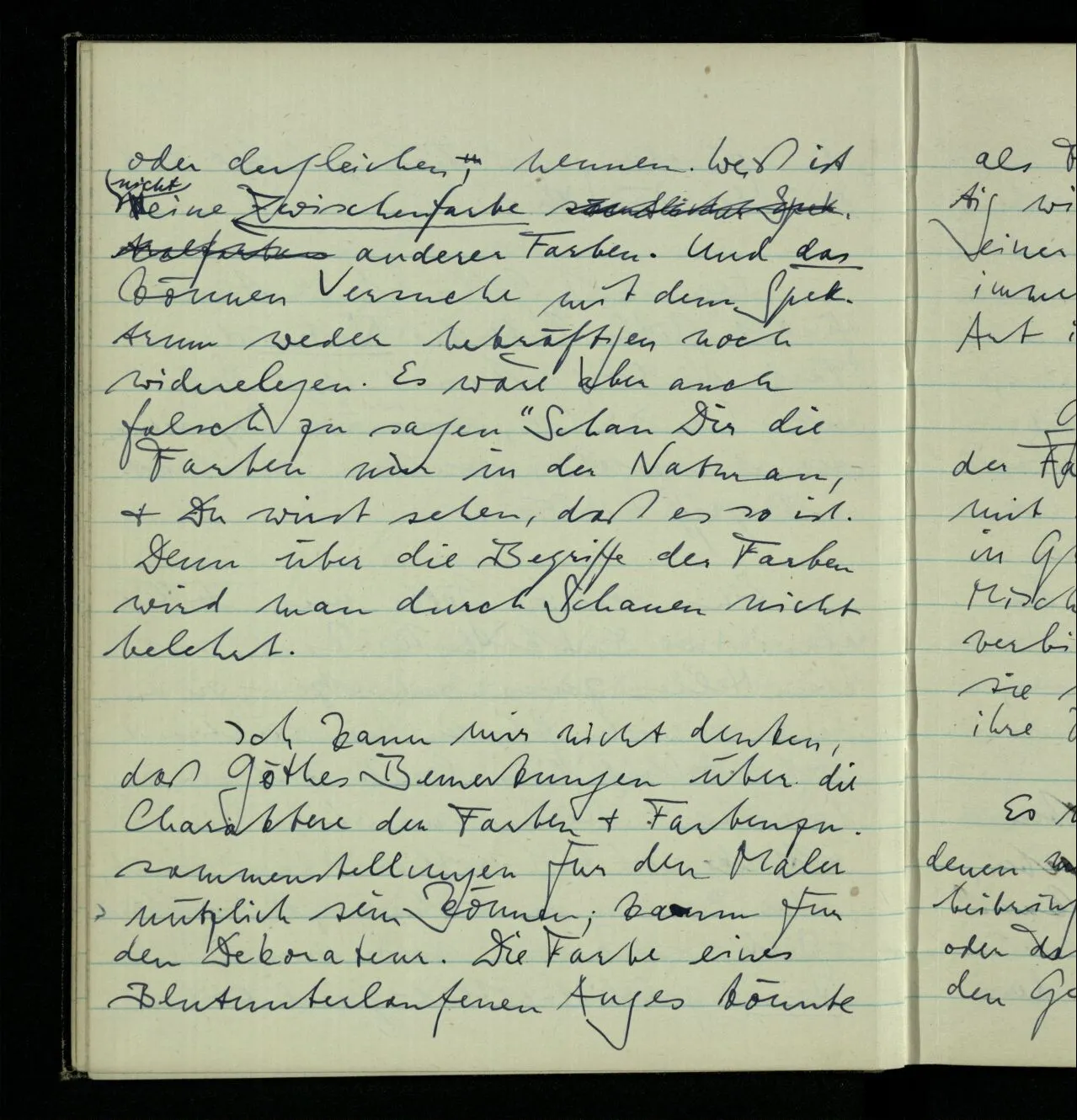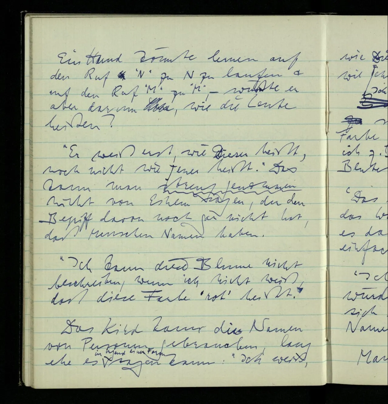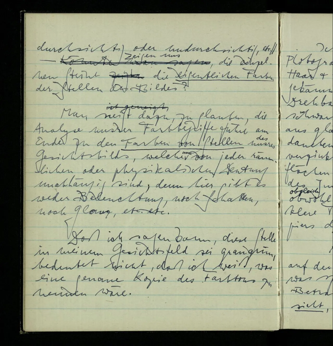 Wem ein Rötlichgrün bekannt wäre, der sollte im Stande sein, eine Farbenreihe herzustellen, die mit Rot anfinge, mit Grün endet &, auch für uns vielleicht, einen kontinuierlichen Übergang zwischen ihnen bildet. Es würde sich dann zeigen, daß dort, wo wir jedesmal den gleichen Ton, von Braun z.B., sehen, er einmal Braun, einmal Rötlichgrün sähe. Daß er z.B. zwei chemische Verbindungen, die für uns die gleiche Farbe haben, nach der Farbe unterscheiden könnte & die eine braun die andre rötlichgrün nennte.