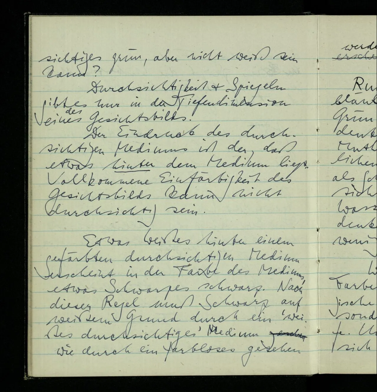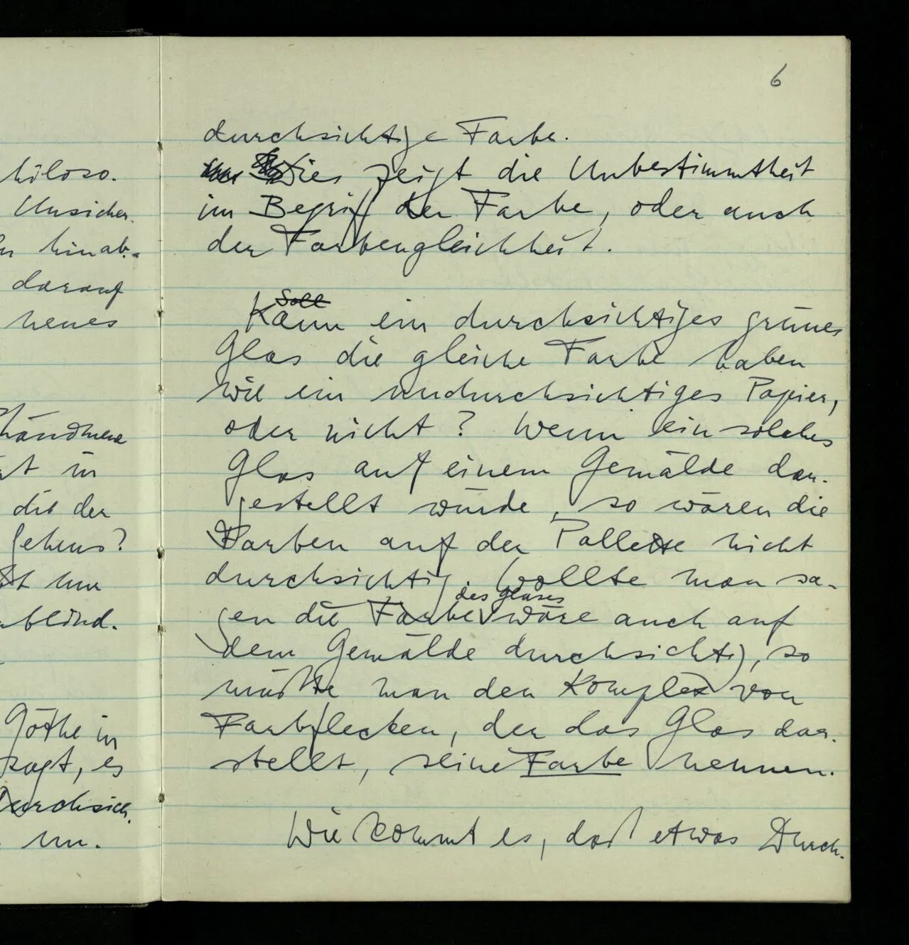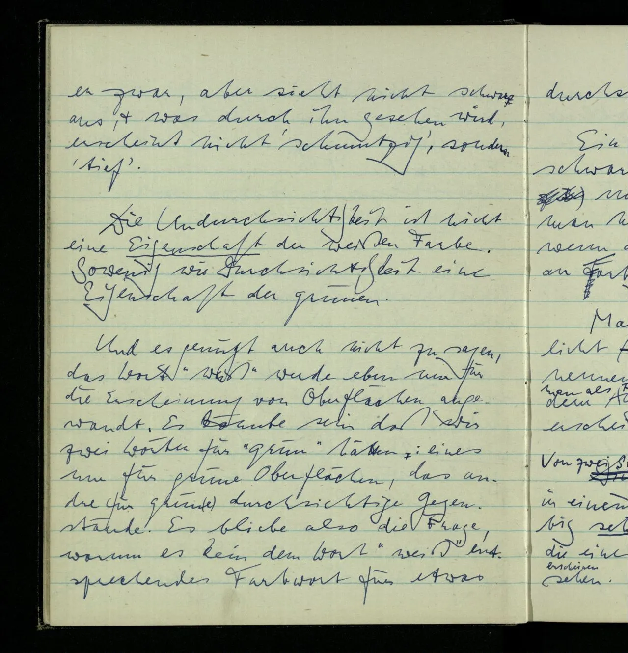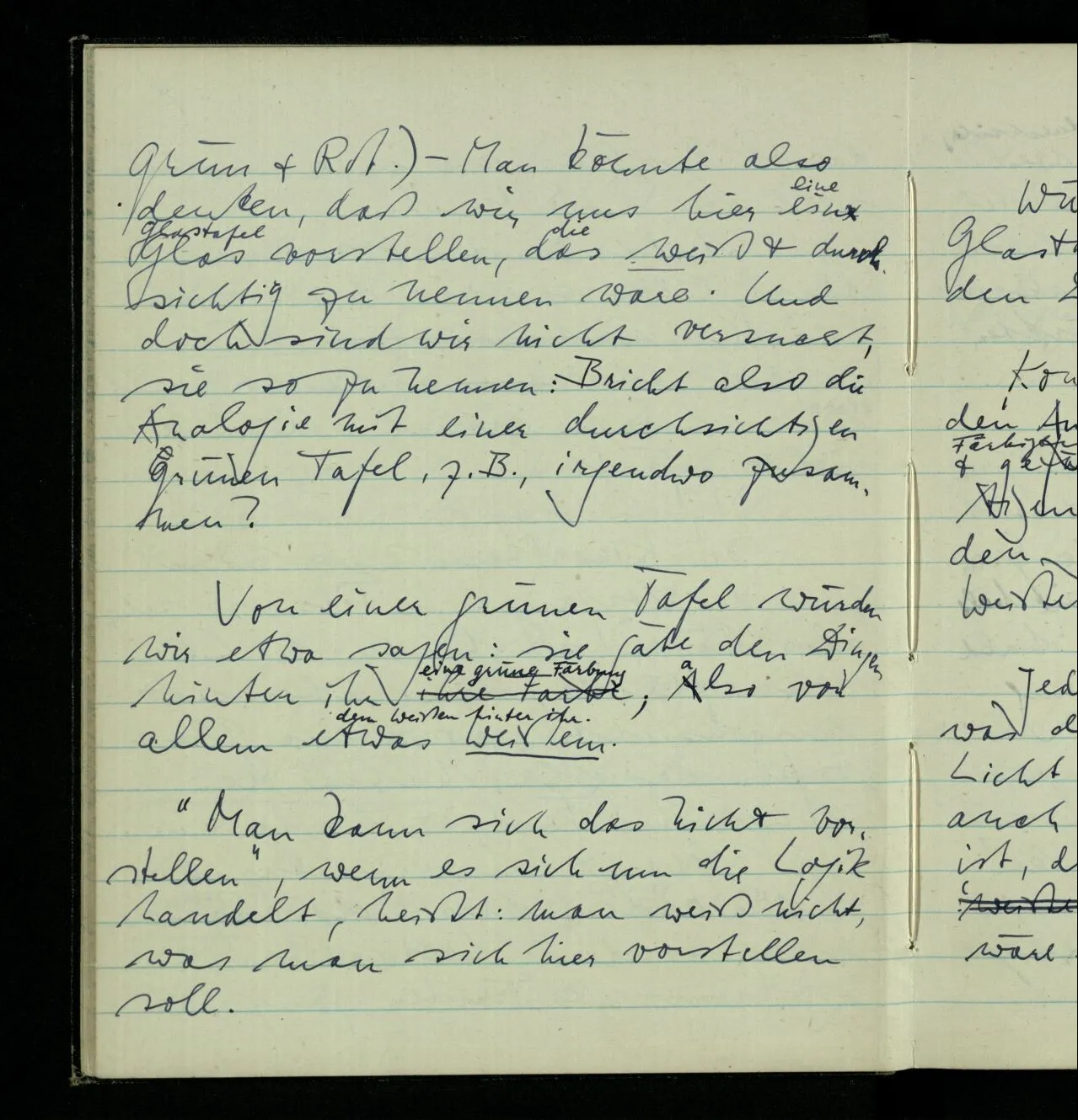Kann ein durchsichtiges grünes Glas die gleiche Farbe haben wie ein undurchsichtiges Papier, oder nicht? Wenn ein solches Glas auf einem Gemälde dargestellt würde, so wären die Farben auf der Palette nicht durchsichtig. Wollte man sagen die Farbe des Glases wäre auch auf dem Gemälde durchsichtig, so müßte man den Komplex von Farbflecken, der das Glas darstellt, seine Farbe nennen.