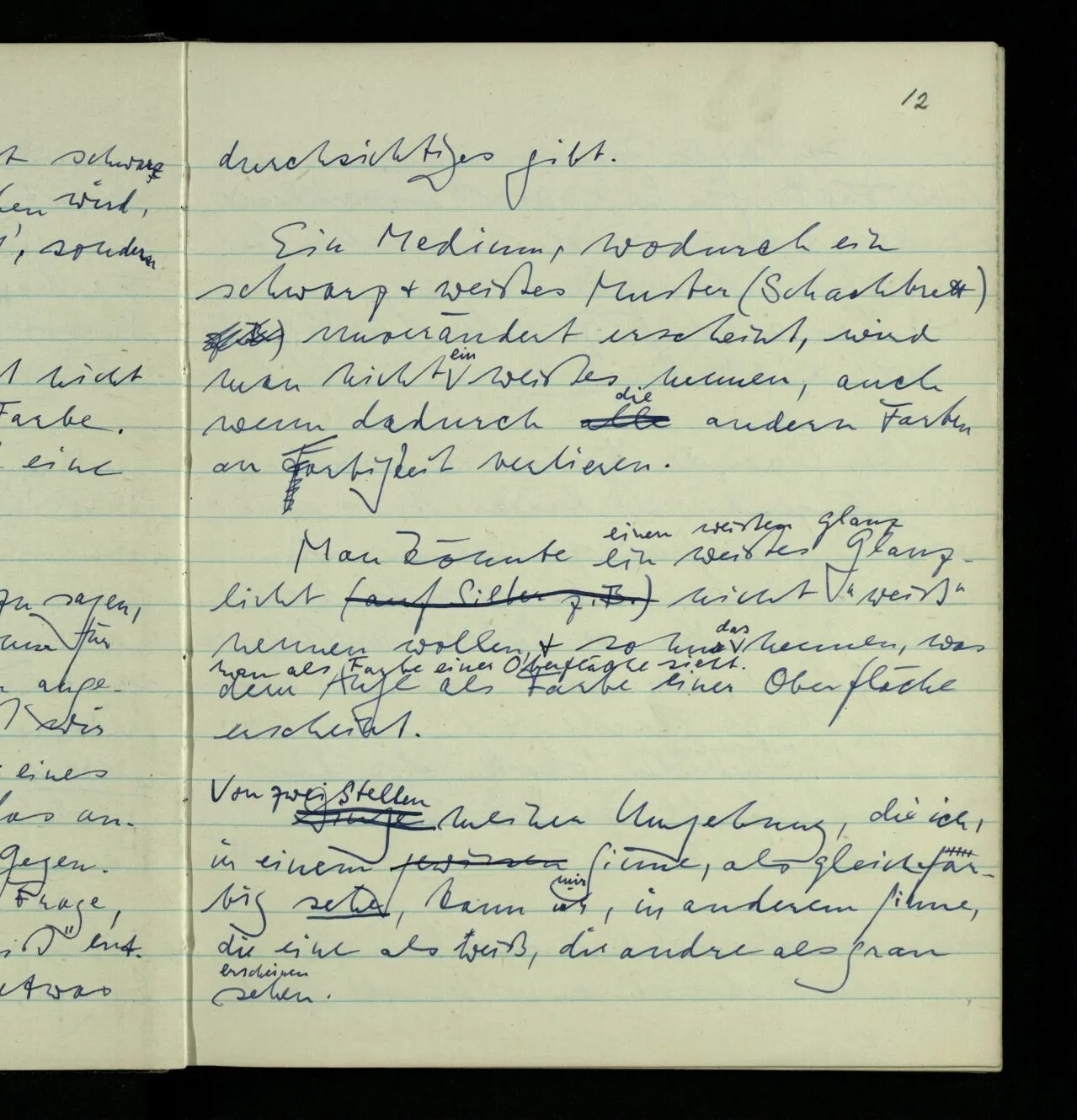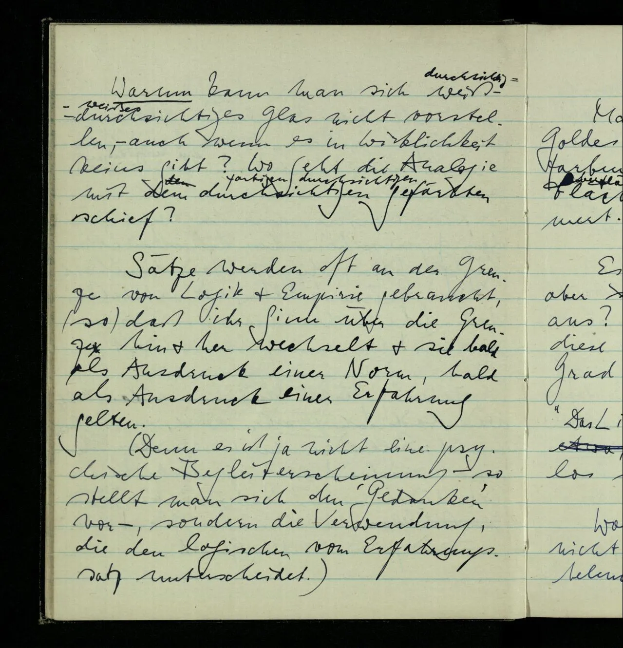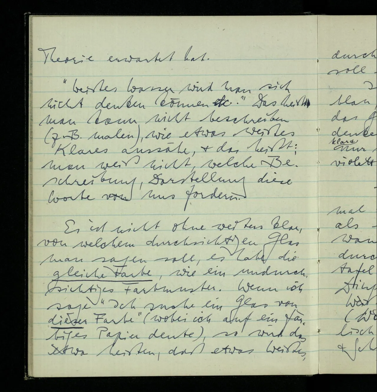 Es ist nicht ohne weiteres klar, von welchem durchsichtigen Glas man sagen soll, es habe die gleiche Farbe, wie ein undurchsichtiges Farbmuster. Wenn ich sage “Ich suche ein Glas von dieser Farbe” (wobei ich auf ein farbiges Papier deute), so wird das etwa heißen, daß etwas Weißes, durch das Glas gesehen, ausschauen soll wie mein Muster. Ist das Muster rosa; himmelblau, lila, so wird man sich das Glas trübe denken, aber vielleicht auch klar & nur schwach rötlich, bläulich oder violett gefärbt.