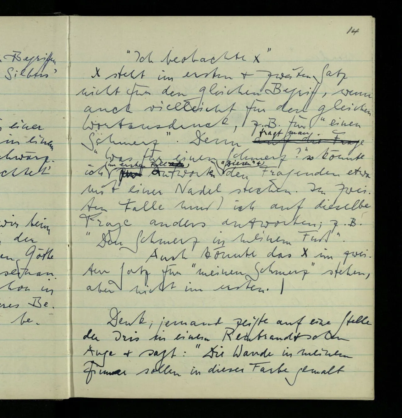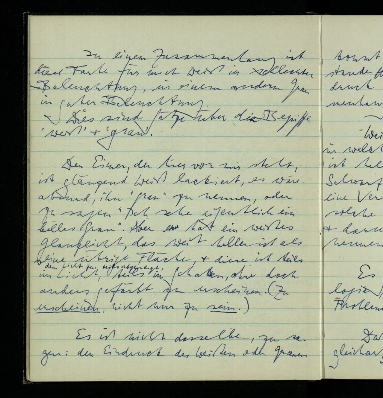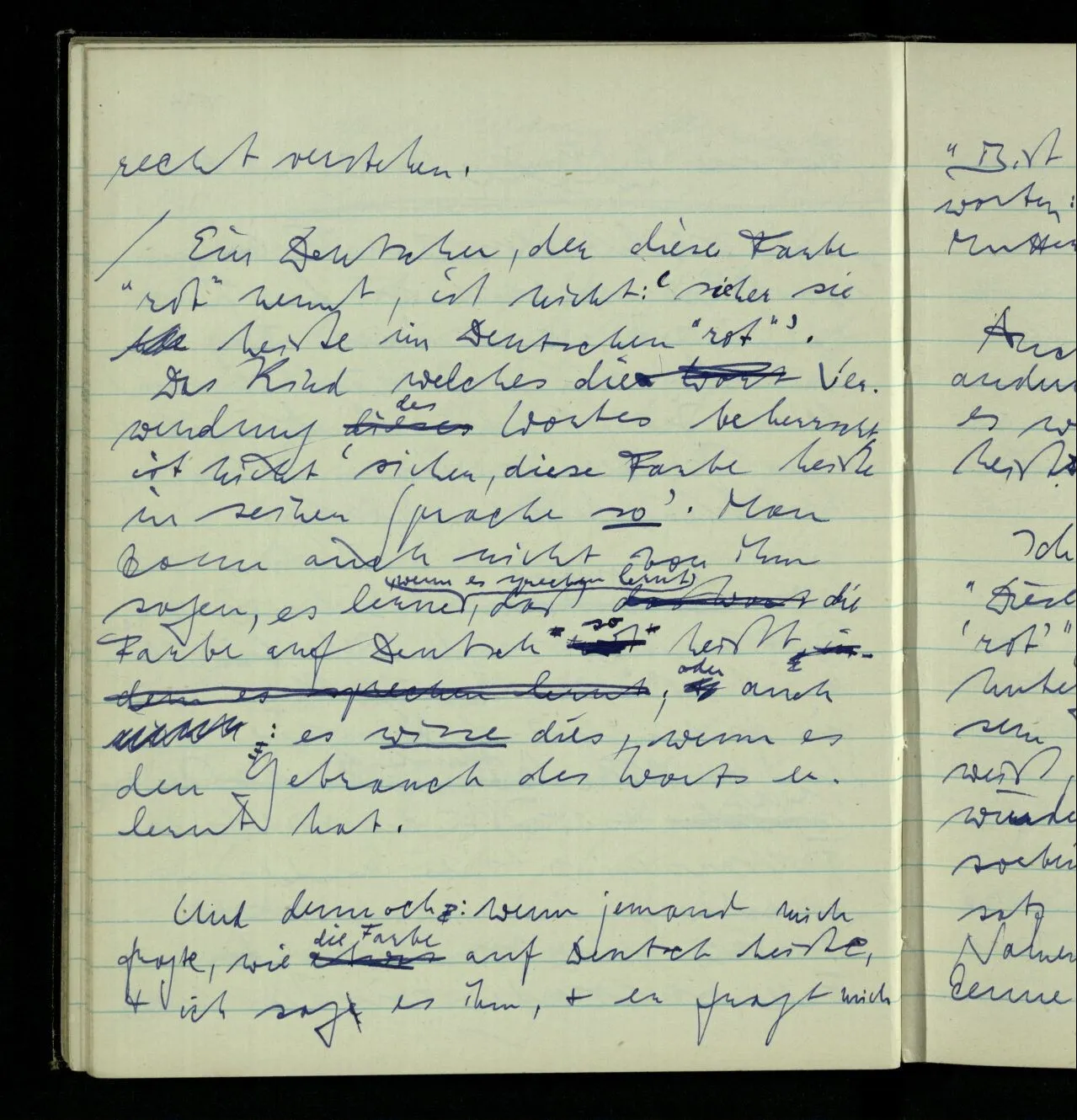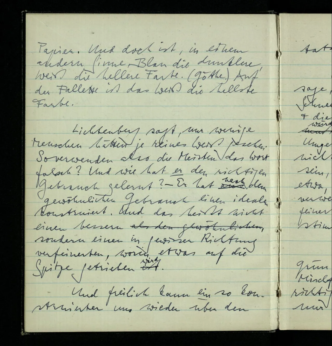 Lichtenberg sagt, nur wenige Menschen hätten je reines Weiß gesehen. So verwenden also die Meisten das Wort falsch? Und wie hat er den richtigen Gebrauch gelernt? – Er hat nach dem gewöhnlichen Gebrauch einen idealen konstruiert. Und das heißt nicht einen bessern, sondern einen in gewisser Richtung verfeinerten, worin etwas auf die Spitze getrieben wird.