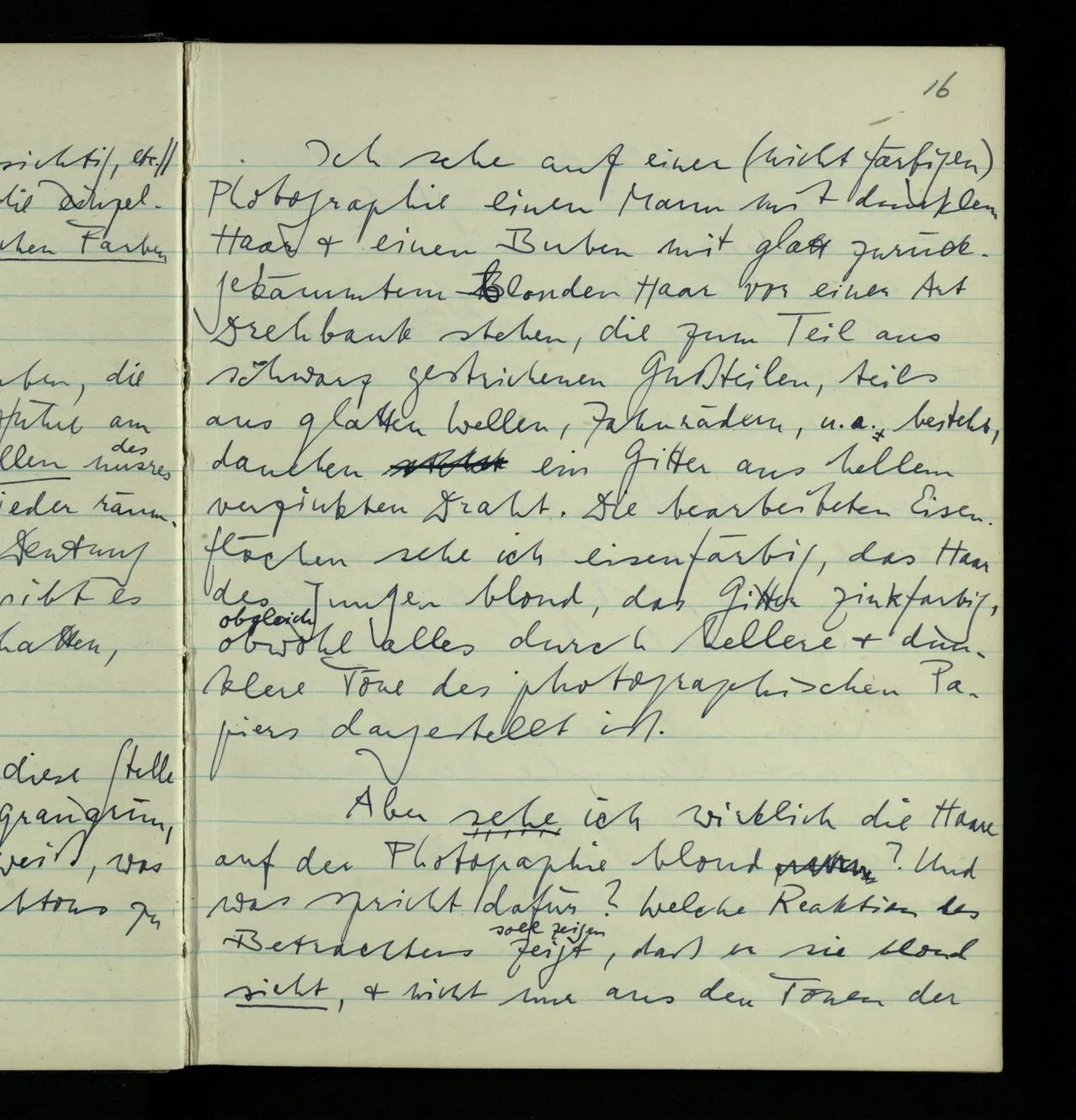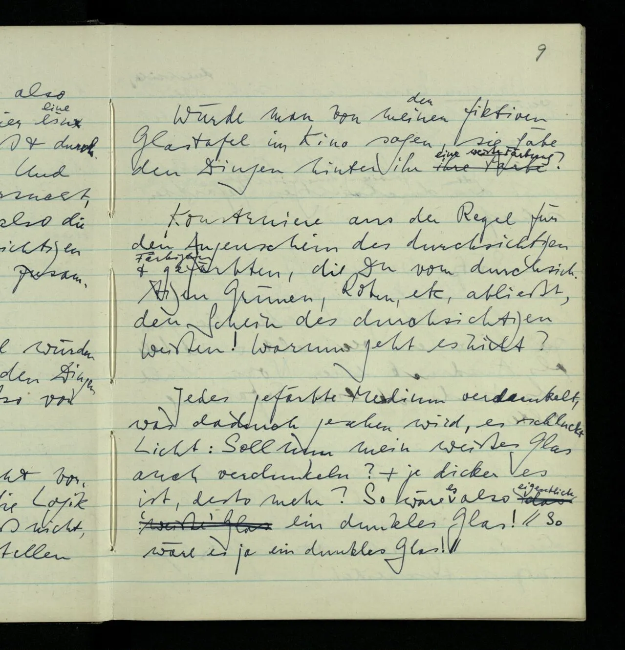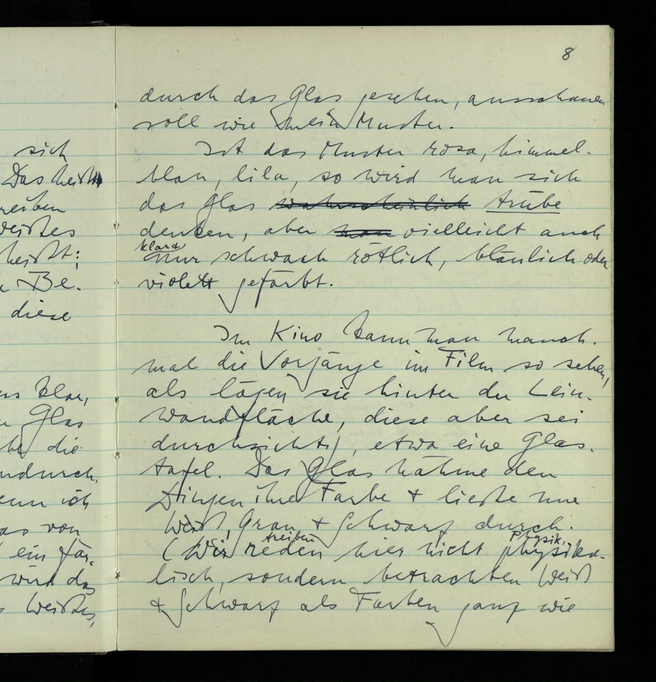 Im Kino kann man manchmal die Vorgänge im Film so sehen, als lägen sie hinter der Leinwandfläche, diese aber sei durchsichtig, etwa eine Glastafel. Das Glas nähme den Dingen ihre Farbe & ließe nur Weiß, Grau & Schwarz durch.