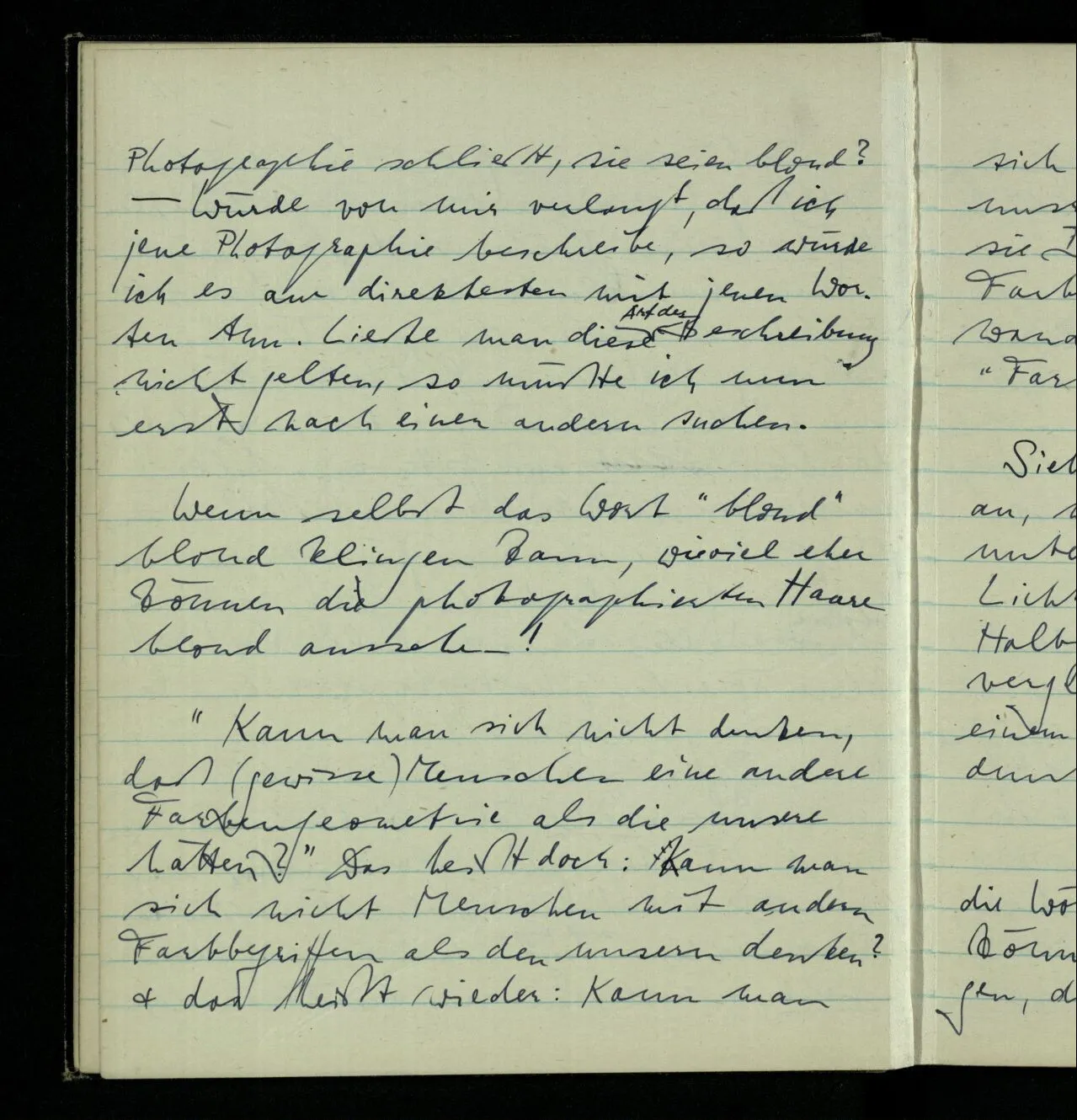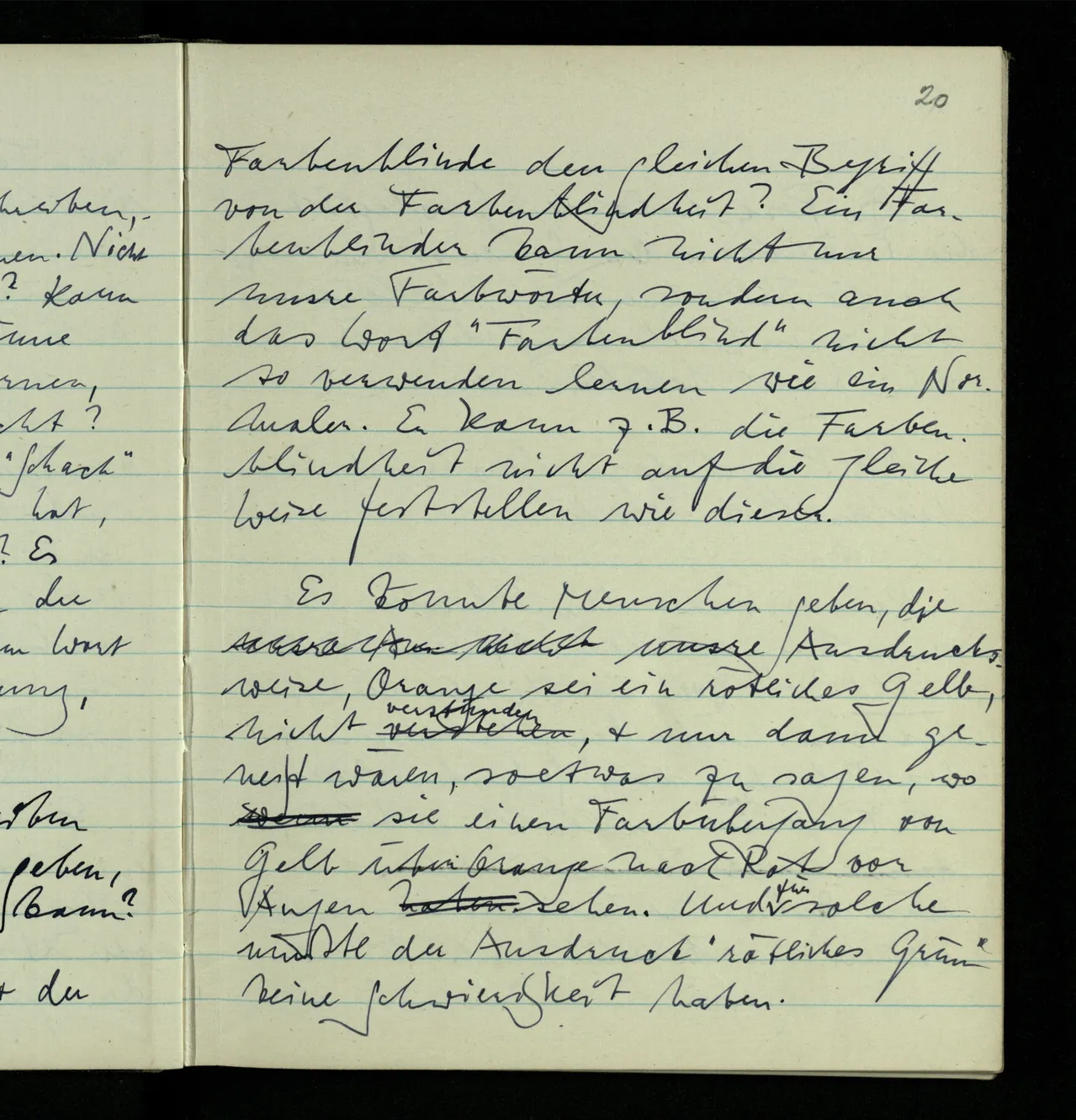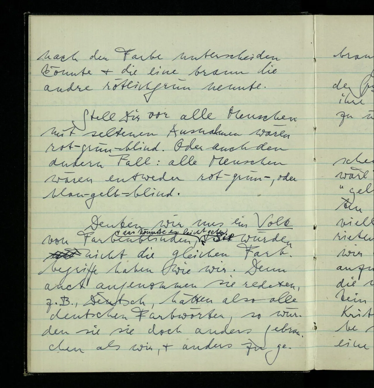 Denken wir uns ein Volk von Farbenblinden, & das könnte es leicht geben. Sie würden nicht die gleichen Farbbegriffe haben wie wir. Denn auch angenommen sie redeten, z.B., Deutsch, hätten also alle deutschen Farbwörter, so würden sie sie doch anders gebrauchen als wir, & anders zu gebrauchen lernen. Oder haben sie eine fremde Sprache, so würde es uns schwer, ihre Farbwörter in die unsern zu übersetzen.