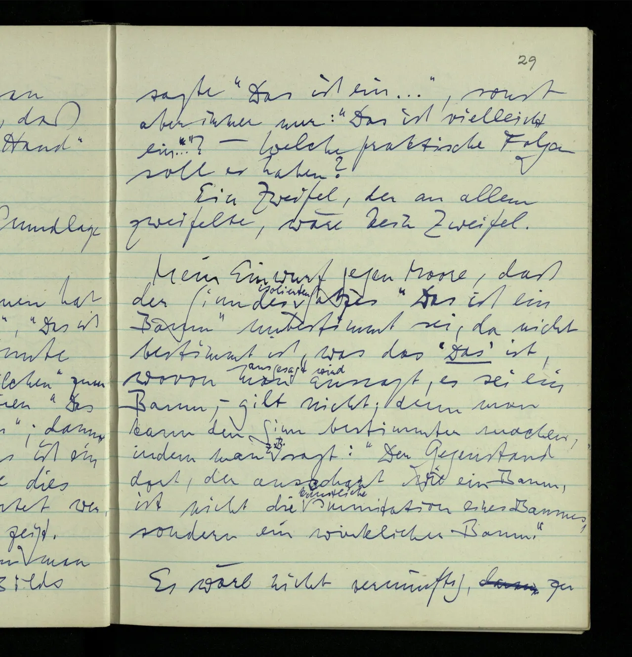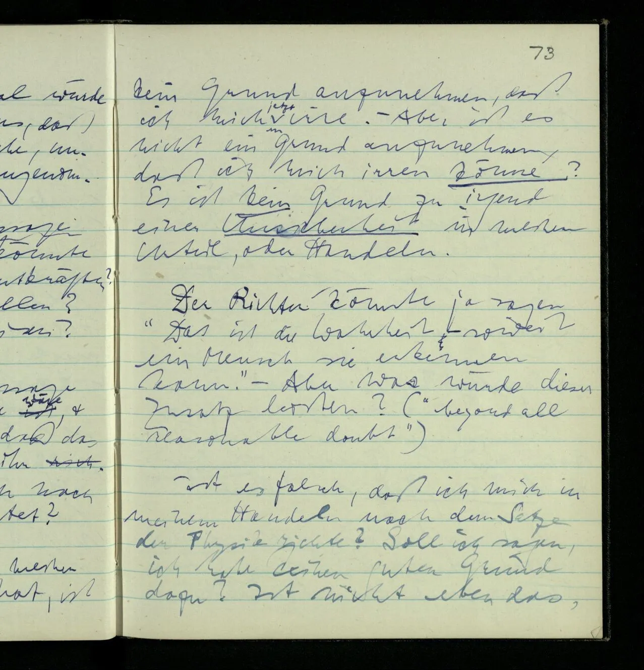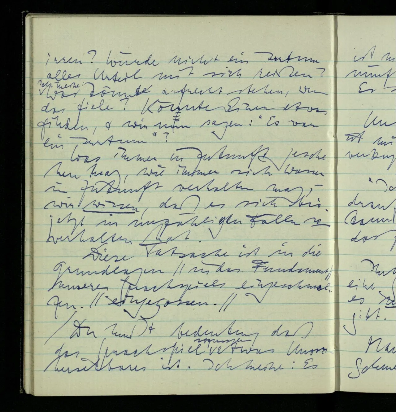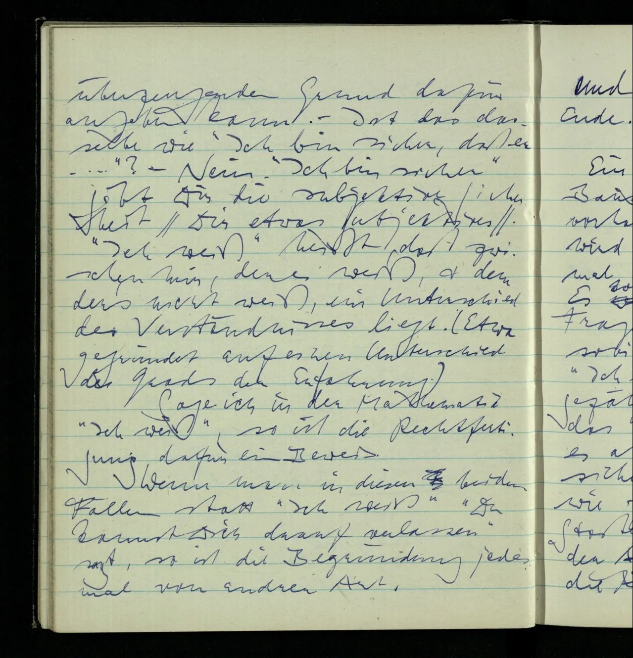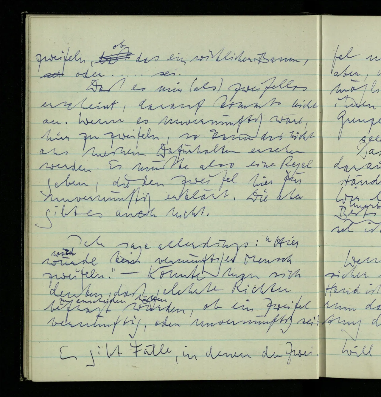 Man könnte z.B. die Sicherheit des Satzes, daß Wasser ca. bei 100˚ C kocht, beschreiben. Es ist das z.B. nicht ein Satz, den ich einmal gehört habe wie etwa den & jenen, die ich nennen könnte. Ich habe das Experiment selber in der Schule gemacht. Der Satz ist ein sehr elementarer unserer Lehrbücher, denen in solchen Dingen zu trauen ist, weil …. – Man kann nun allem dem Beispiele entgegenhalten, die zeigen, daß Menschen dies & jenes für gewiß gehalten haben, was sich später, unsrer Meinung nach, für falsch erwiesen hat. Aber dieses Argument ist wertlos. Zu sagen: wir können am Ende nur solche Gründe anführen, die wir für Gründe halten, sagt gar nichts. Kann es denn nicht auch geschehen, daß man heute einen Irrtum früherer Zeiten zu erkennen glaubt, & später darauf kommt, daß die erste Ansicht richtig war. etc. Ich glaube es liegt hier ein Mißverständnis des Wesens unserer Sprachspiele zu Grunde.