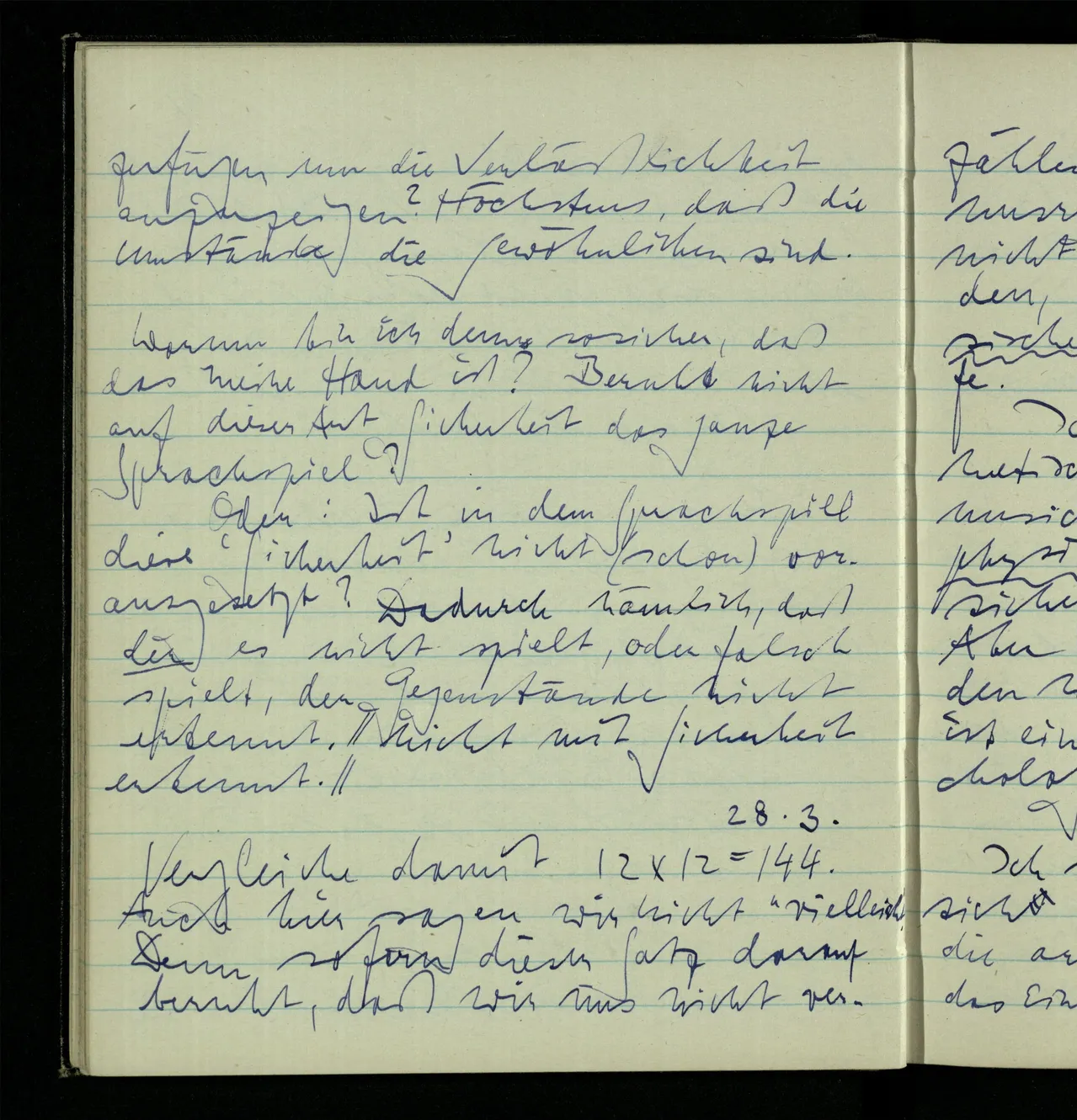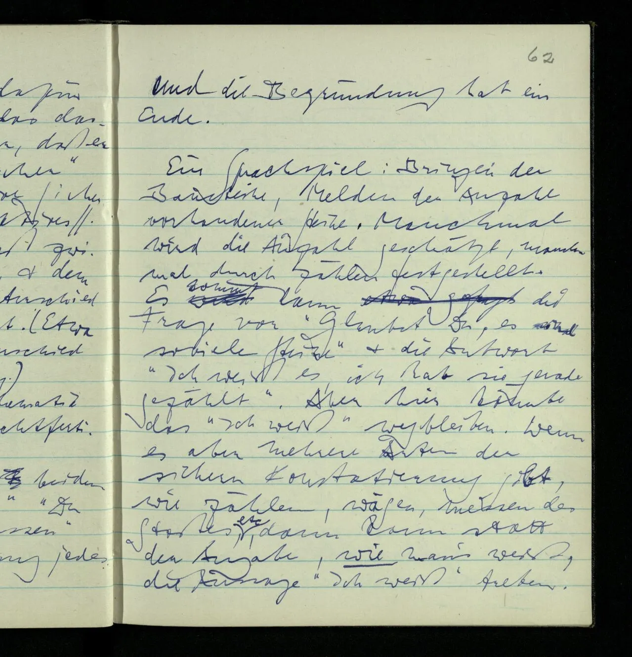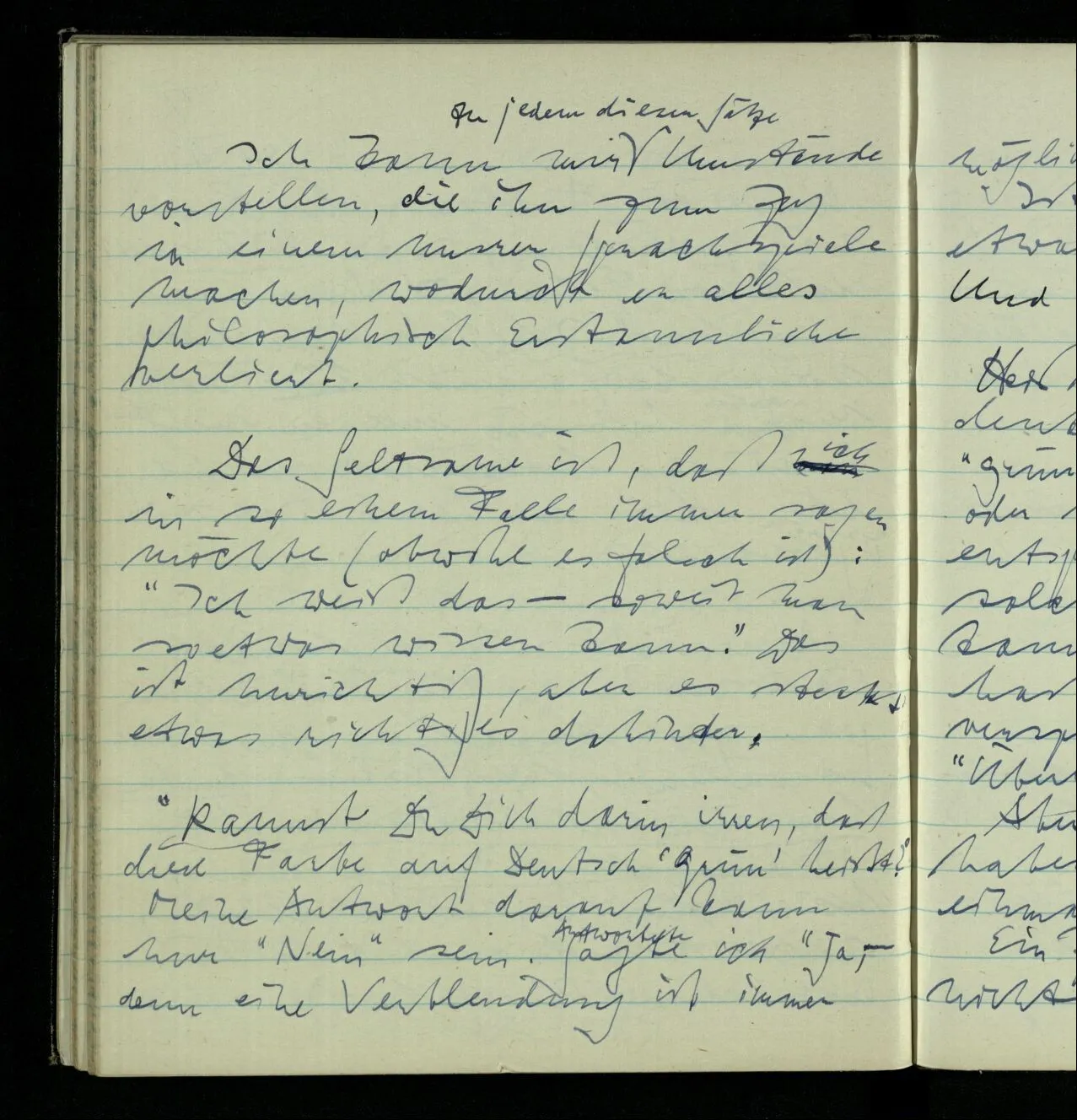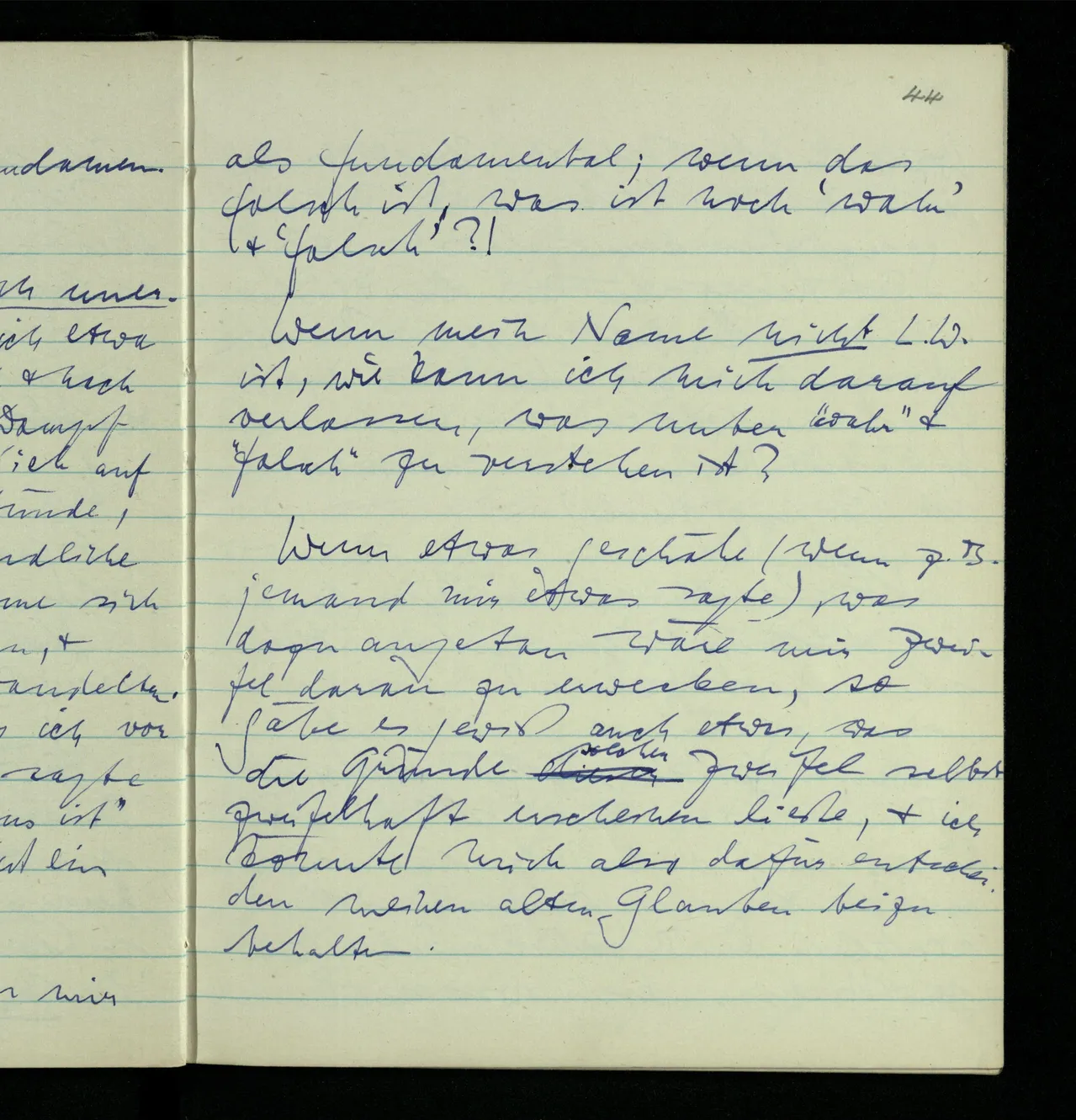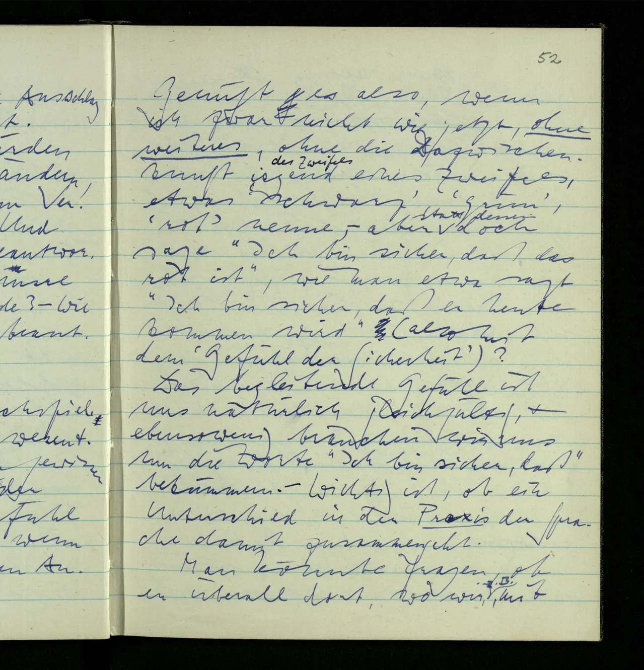 Man könnte z.B. die Sicherheit des Satzes, daß Wasser ca. bei 100˚ C kocht, beschreiben. Es ist das z.B. nicht ein Satz, den ich einmal gehört habe wie etwa den & jenen, die ich nennen könnte. Ich habe das Experiment selber in der Schule gemacht. Der Satz ist ein sehr elementarer unserer Lehrbücher, denen in solchen Dingen zu trauen ist, weil …. – Man kann nun allem dem Beispiele entgegenhalten, die zeigen, daß Menschen dies & jenes für gewiß gehalten haben, was sich später, unsrer Meinung nach, für falsch erwiesen hat. Aber dieses Argument ist wertlos. Zu sagen: wir können am Ende nur solche Gründe anführen, die wir für Gründe halten, sagt gar nichts. Kann es denn nicht auch geschehen, daß man heute einen Irrtum früherer Zeiten zu erkennen glaubt, & später darauf kommt, daß die erste Ansicht richtig war. etc. Ich glaube es liegt hier ein Mißverständnis des Wesens unserer Sprachspiele zu Grunde.