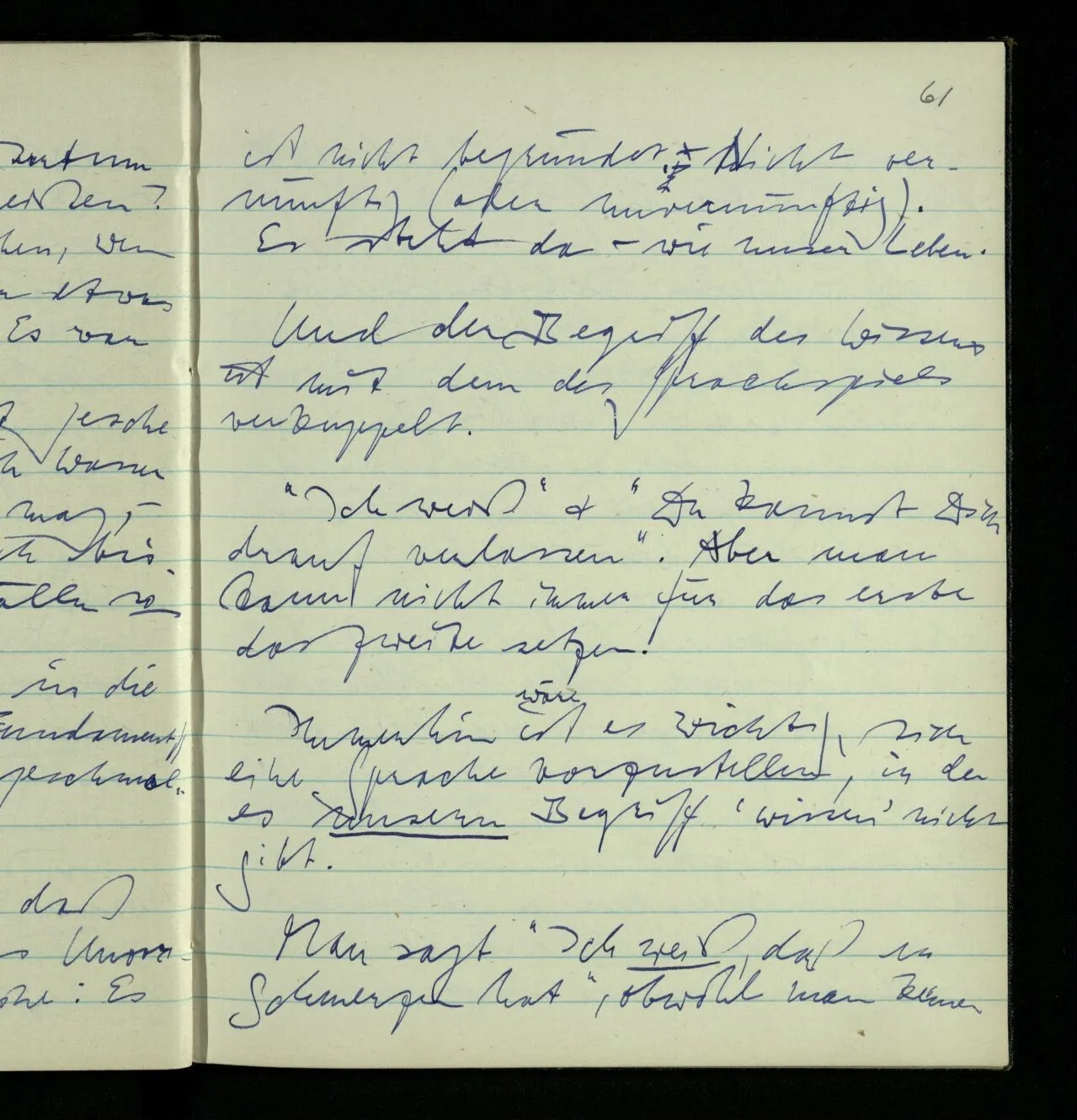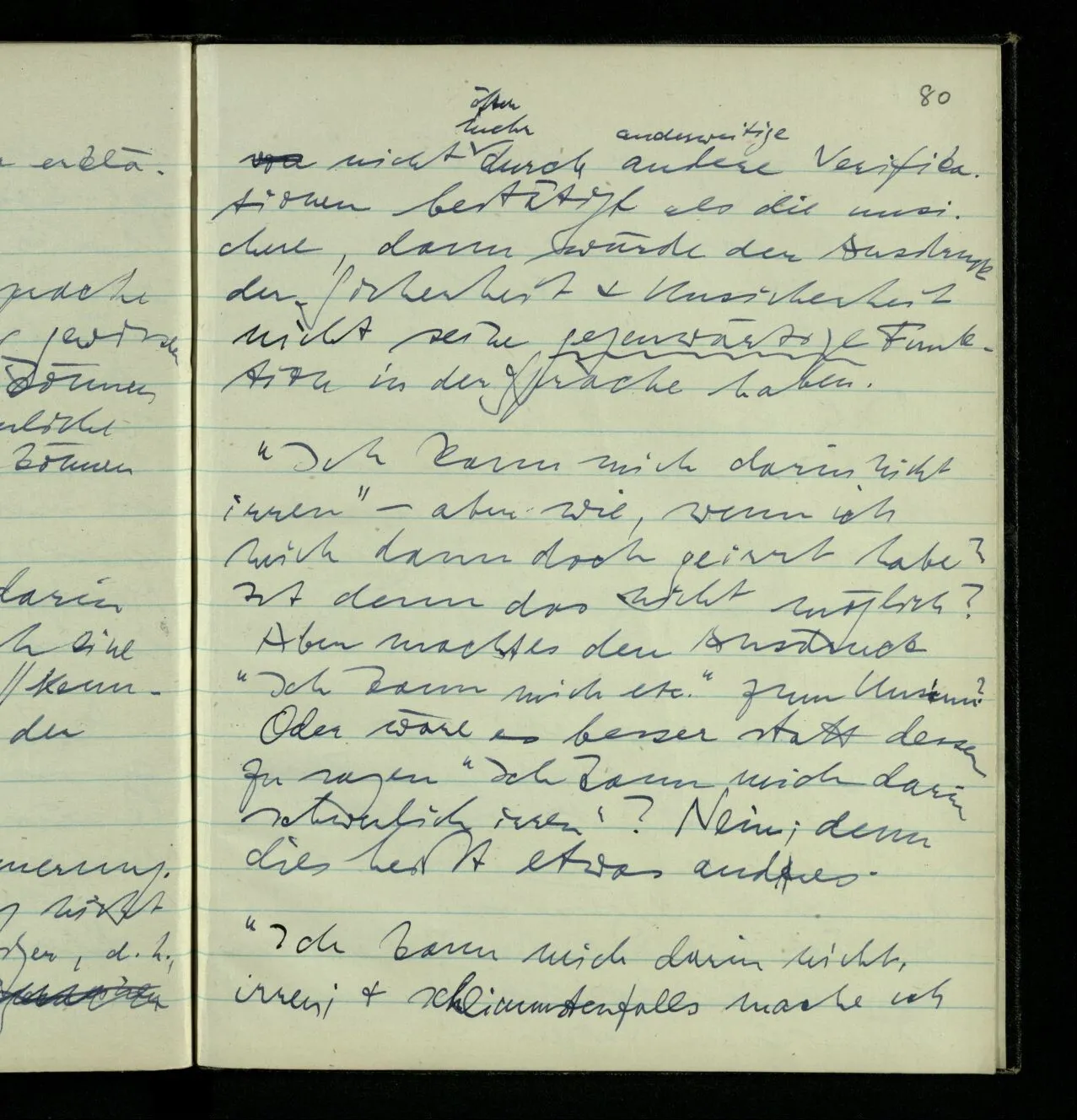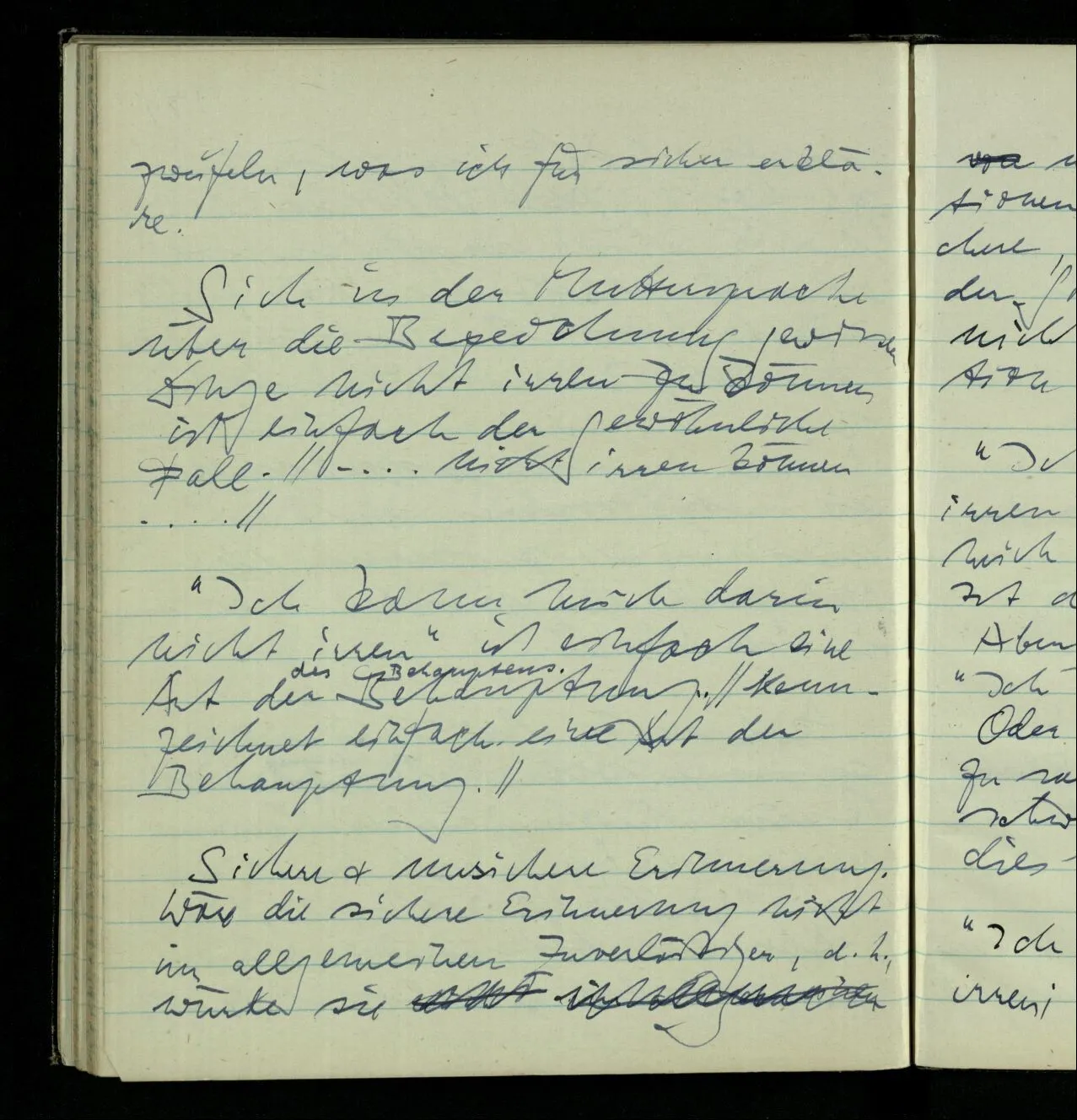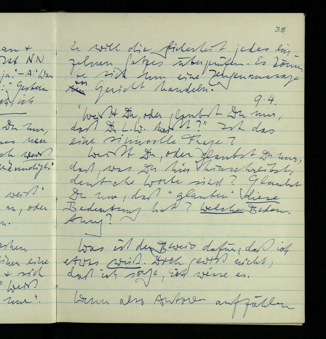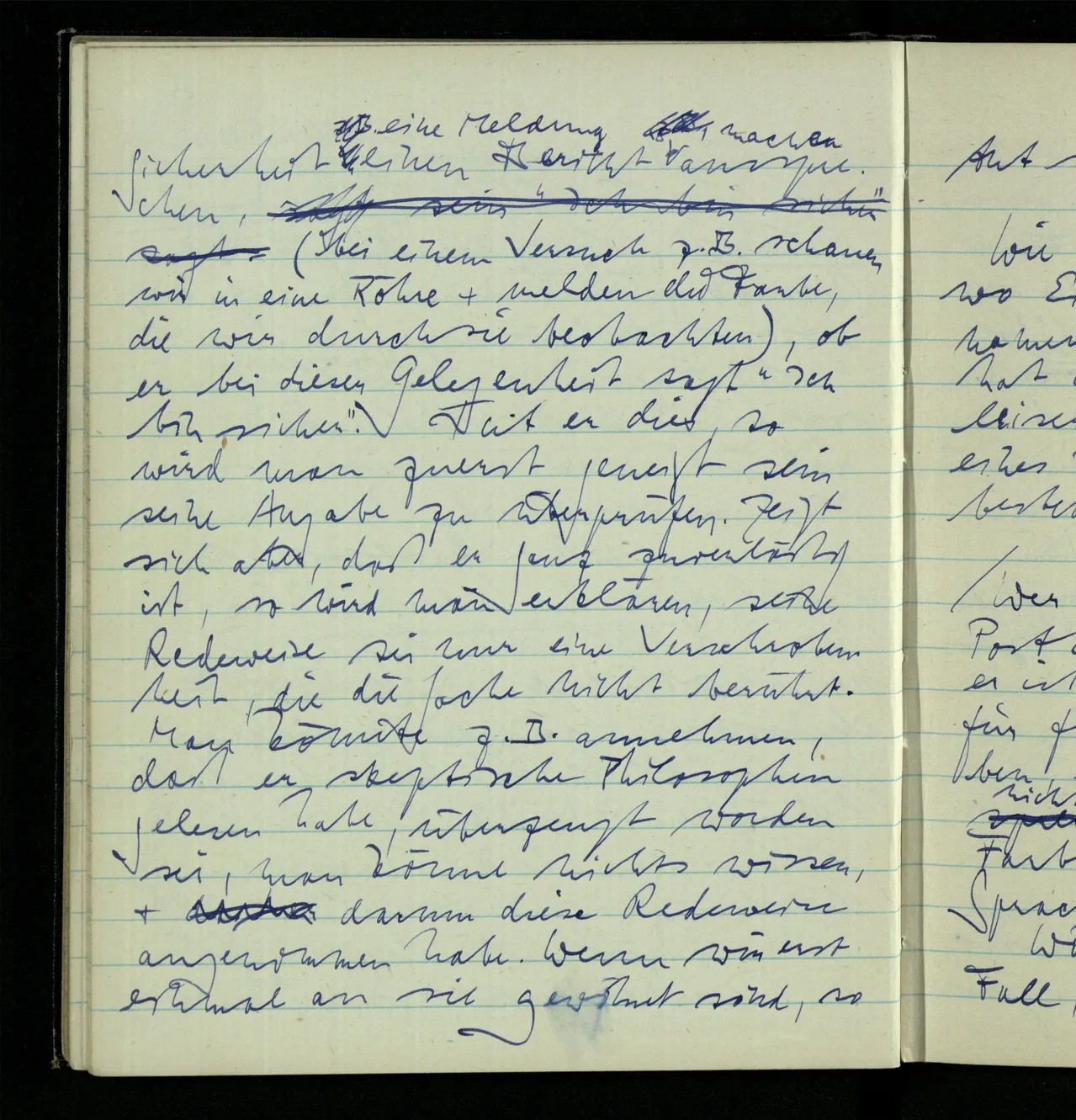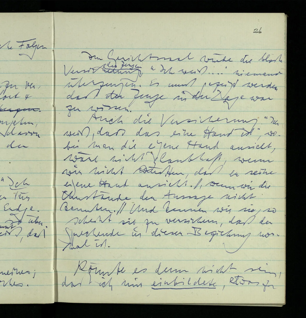 Man könnte z.B. die Sicherheit des Satzes, daß Wasser ca. bei 100˚ C kocht, beschreiben. Es ist das z.B. nicht ein Satz, den ich einmal gehört habe wie etwa den & jenen, die ich nennen könnte. Ich habe das Experiment selber in der Schule gemacht. Der Satz ist ein sehr elementarer unserer Lehrbücher, denen in solchen Dingen zu trauen ist, weil …. – Man kann nun allem dem Beispiele entgegenhalten, die zeigen, daß Menschen dies & jenes für gewiß gehalten haben, was sich später, unsrer Meinung nach, für falsch erwiesen hat. Aber dieses Argument ist wertlos. Zu sagen: wir können am Ende nur solche Gründe anführen, die wir für Gründe halten, sagt gar nichts. Kann es denn nicht auch geschehen, daß man heute einen Irrtum früherer Zeiten zu erkennen glaubt, & später darauf kommt, daß die erste Ansicht richtig war. etc. Ich glaube es liegt hier ein Mißverständnis des Wesens unserer Sprachspiele zu Grunde.