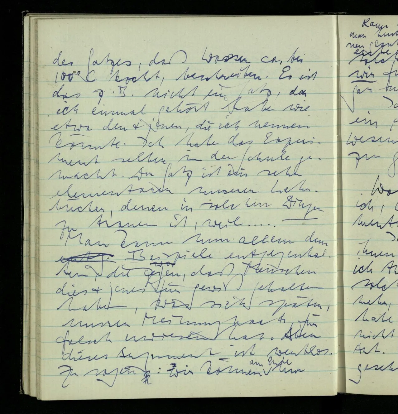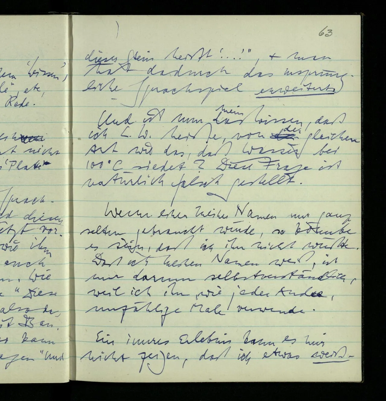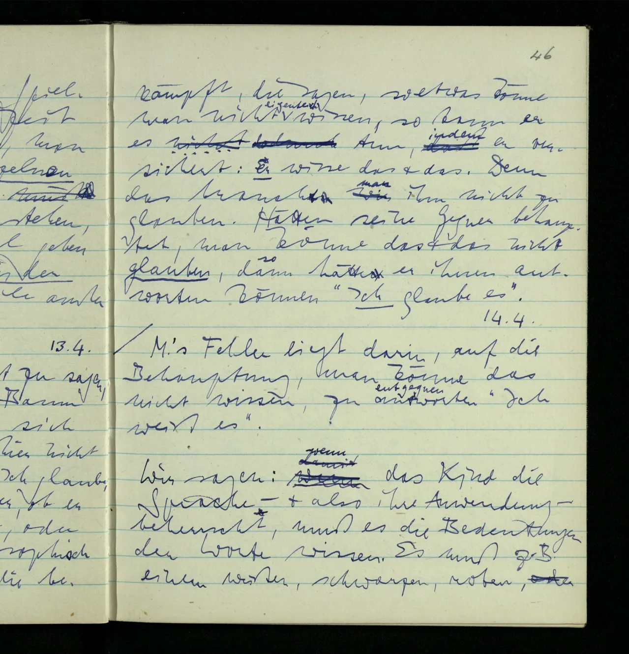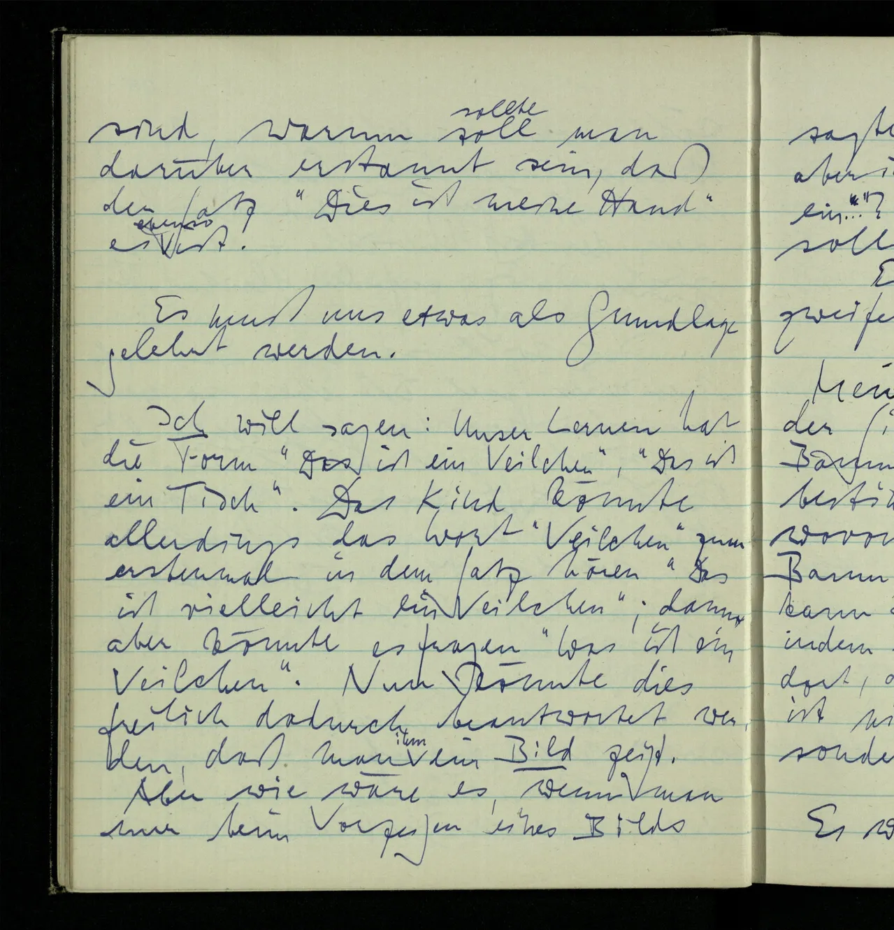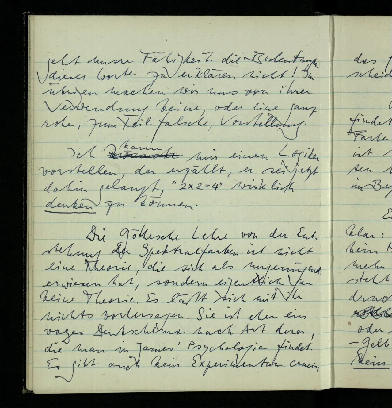 Man könnte z.B. die Sicherheit des Satzes, daß Wasser ca. bei 100˚ C kocht, beschreiben. Es ist das z.B. nicht ein Satz, den ich einmal gehört habe wie etwa den & jenen, die ich nennen könnte. Ich habe das Experiment selber in der Schule gemacht. Der Satz ist ein sehr elementarer unserer Lehrbücher, denen in solchen Dingen zu trauen ist, weil …. – Man kann nun allem dem Beispiele entgegenhalten, die zeigen, daß Menschen dies & jenes für gewiß gehalten haben, was sich später, unsrer Meinung nach, für falsch erwiesen hat. Aber dieses Argument ist wertlos. Zu sagen: wir können am Ende nur solche Gründe anführen, die wir für Gründe halten, sagt gar nichts. Kann es denn nicht auch geschehen, daß man heute einen Irrtum früherer Zeiten zu erkennen glaubt, & später darauf kommt, daß die erste Ansicht richtig war. etc. Ich glaube es liegt hier ein Mißverständnis des Wesens unserer Sprachspiele zu Grunde.