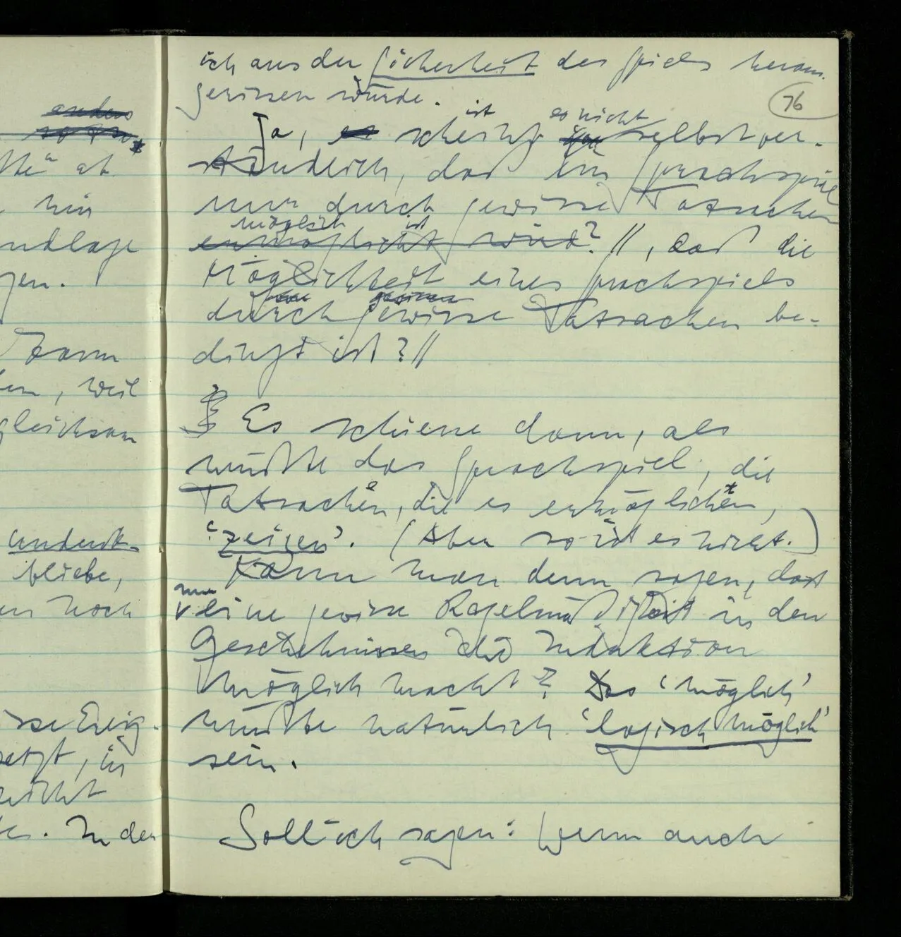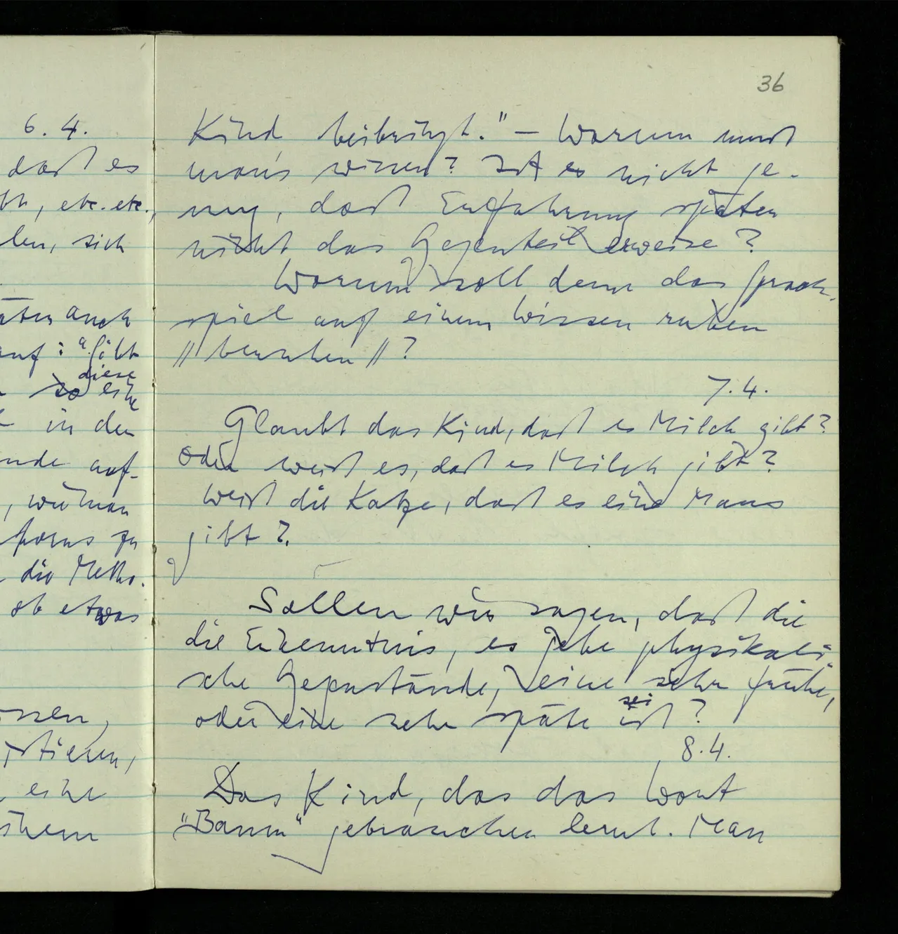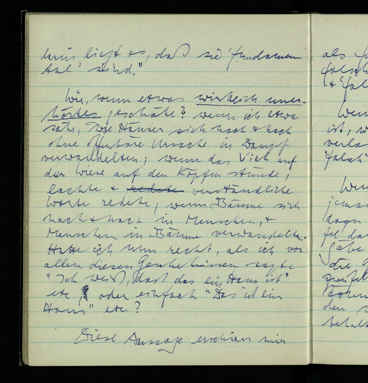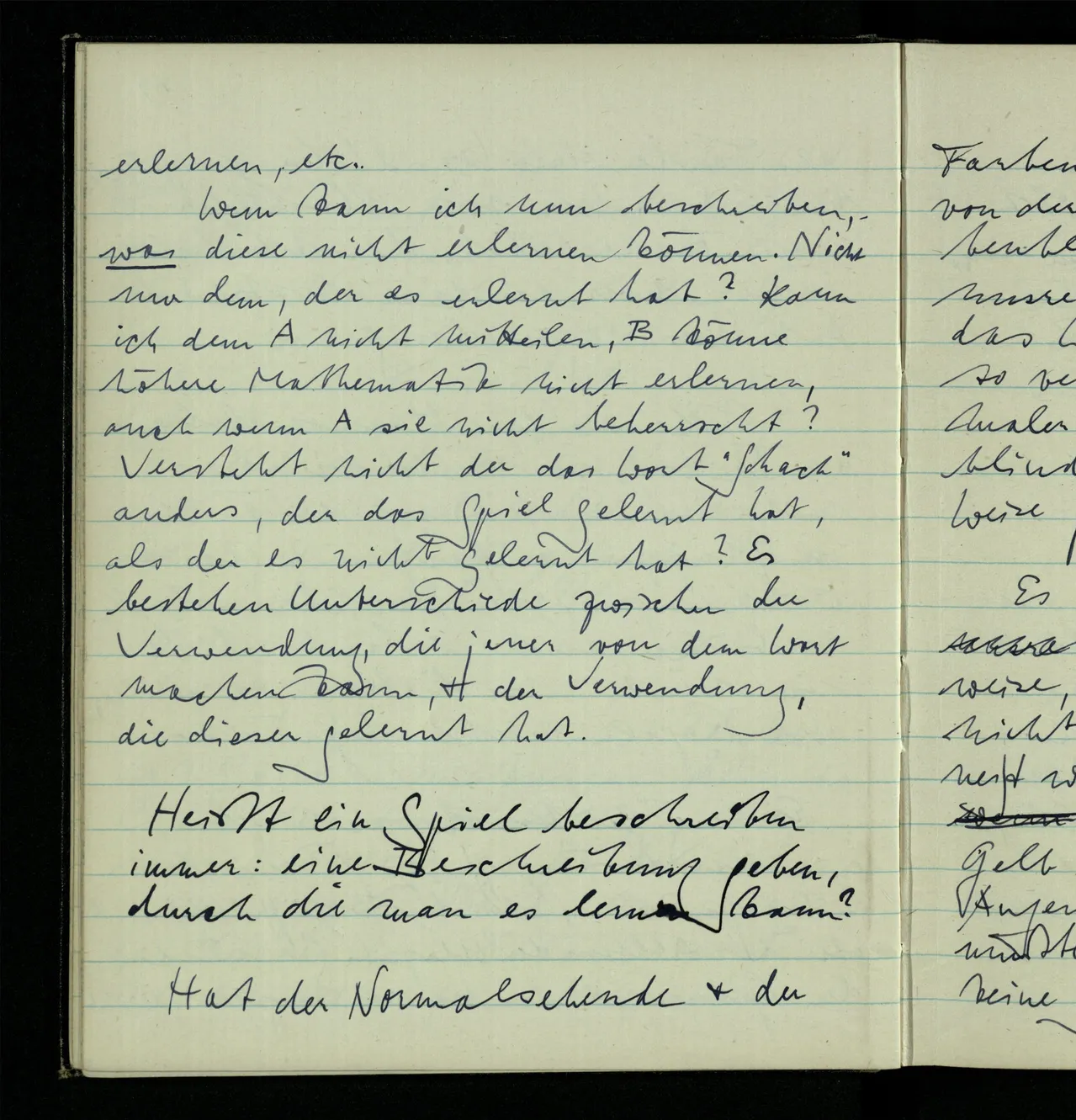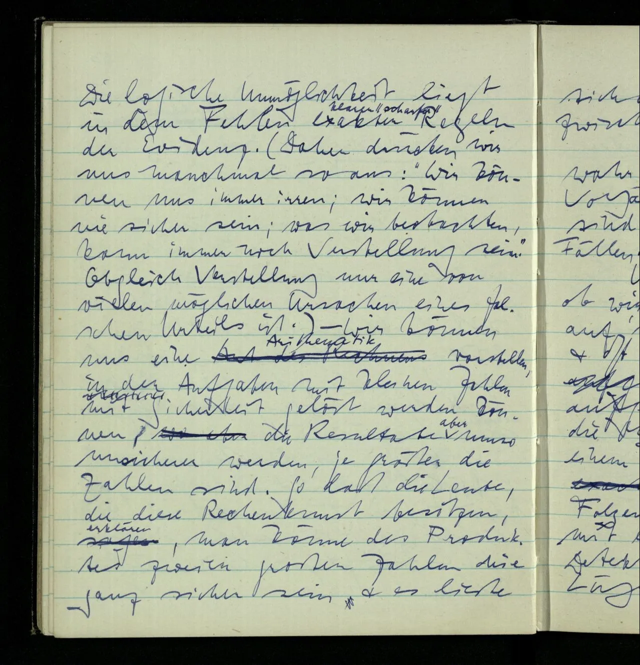Man könnte z.B. die Sicherheit des Satzes, daß Wasser ca. bei 100˚ C kocht, beschreiben. Es ist das z.B. nicht ein Satz, den ich einmal gehört habe wie etwa den & jenen, die ich nennen könnte. Ich habe das Experiment selber in der Schule gemacht. Der Satz ist ein sehr elementarer unserer Lehrbücher, denen in solchen Dingen zu trauen ist, weil …. – Man kann nun allem dem Beispiele entgegenhalten, die zeigen, daß Menschen dies & jenes für gewiß gehalten haben, was sich später, unsrer Meinung nach, für falsch erwiesen hat. Aber dieses Argument ist wertlos. Zu sagen: wir können am Ende nur solche Gründe anführen, die wir für Gründe halten, sagt gar nichts. Kann es denn nicht auch geschehen, daß man heute einen Irrtum früherer Zeiten zu erkennen glaubt, & später darauf kommt, daß die erste Ansicht richtig war. etc. Ich glaube es liegt hier ein Mißverständnis des Wesens unserer Sprachspiele zu Grunde.