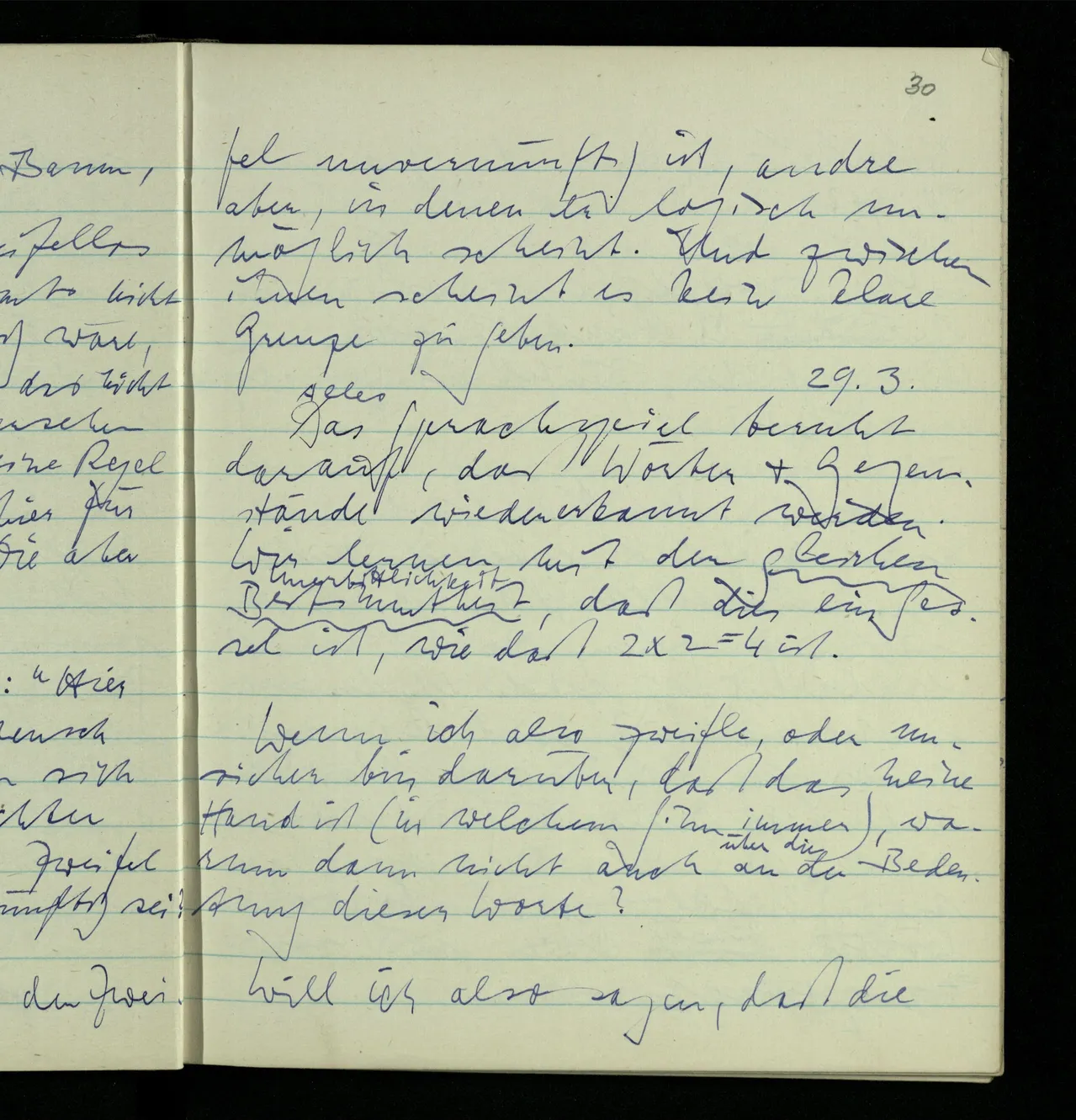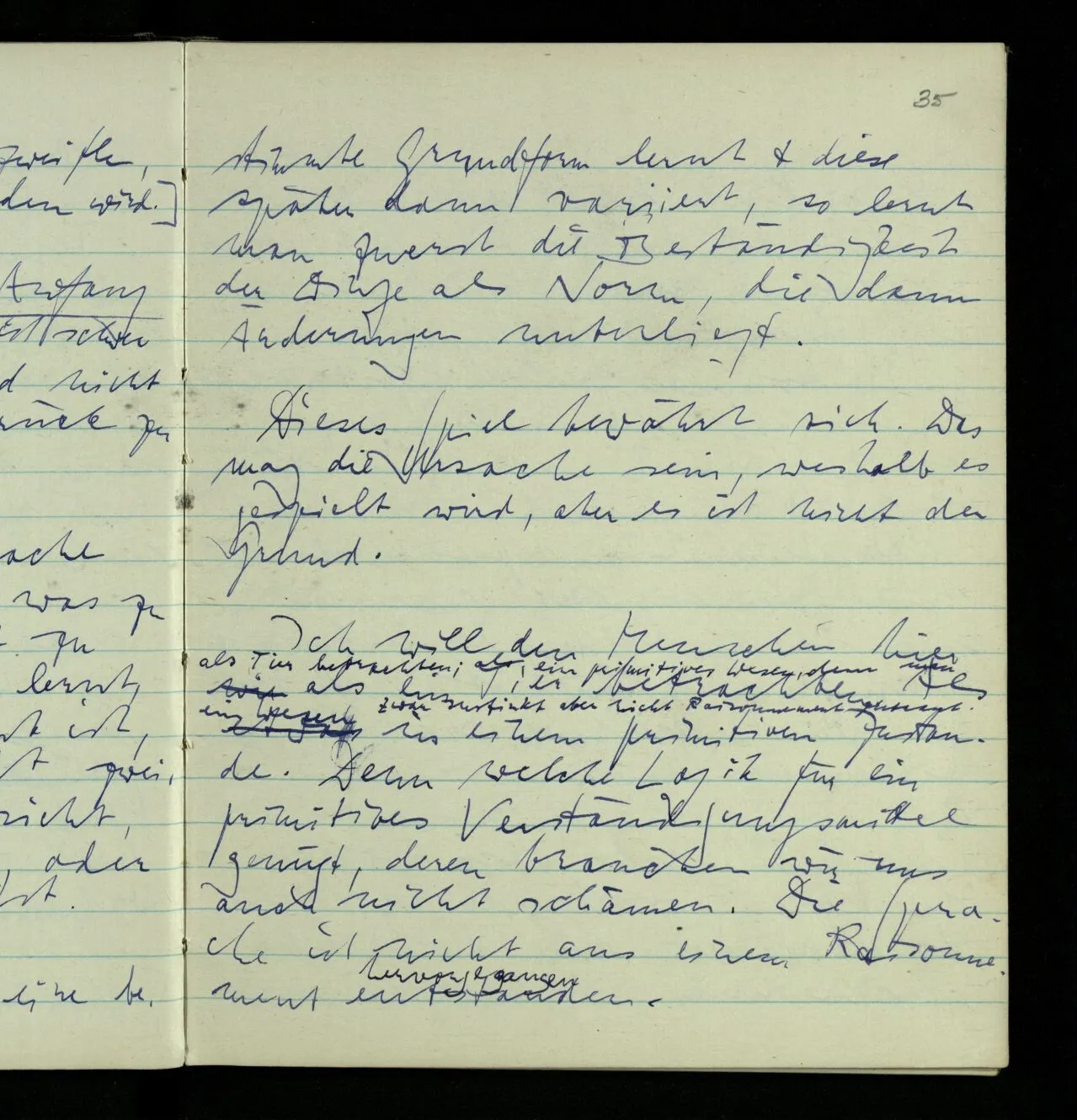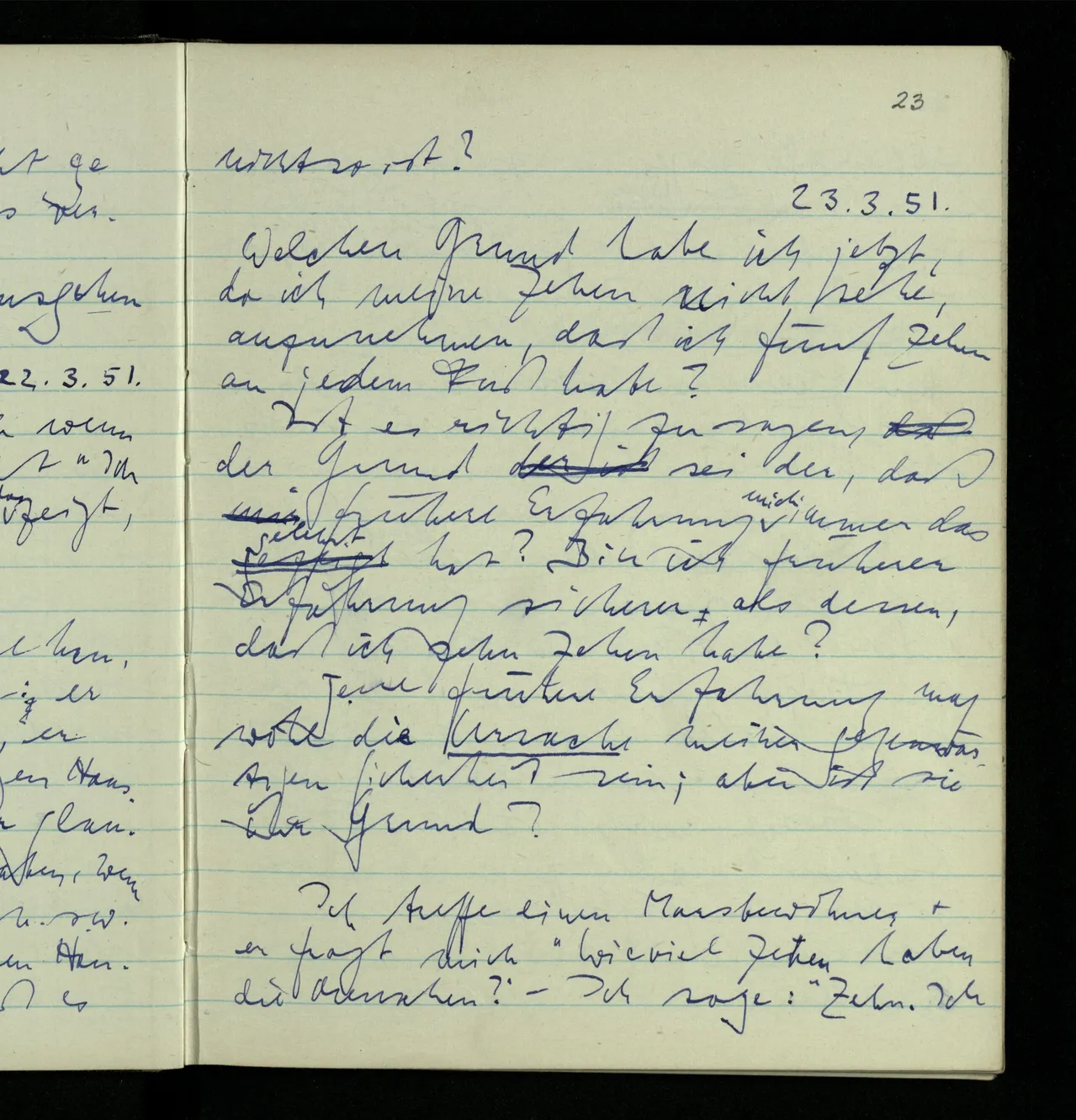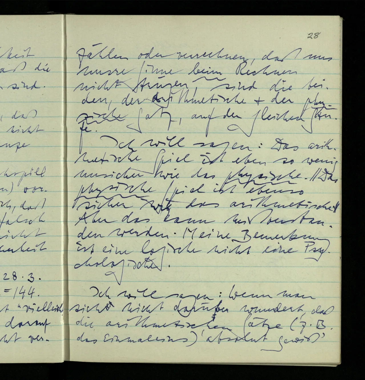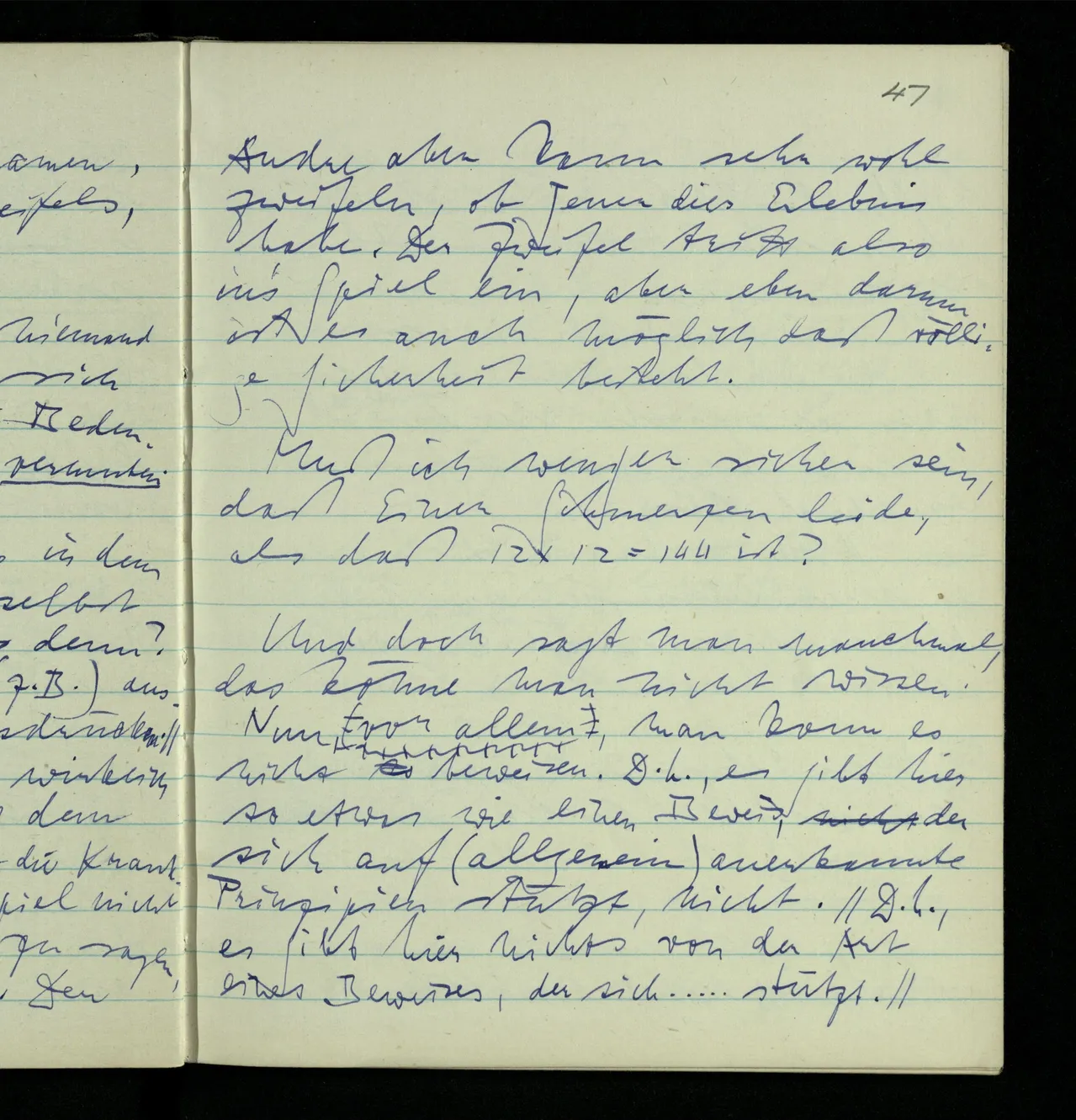Man könnte z.B. die Sicherheit des Satzes, daß Wasser ca. bei 100˚ C kocht, beschreiben. Es ist das z.B. nicht ein Satz, den ich einmal gehört habe wie etwa den & jenen, die ich nennen könnte. Ich habe das Experiment selber in der Schule gemacht. Der Satz ist ein sehr elementarer unserer Lehrbücher, denen in solchen Dingen zu trauen ist, weil …. – Man kann nun allem dem Beispiele entgegenhalten, die zeigen, daß Menschen dies & jenes für gewiß gehalten haben, was sich später, unsrer Meinung nach, für falsch erwiesen hat. Aber dieses Argument ist wertlos. Zu sagen: wir können am Ende nur solche Gründe anführen, die wir für Gründe halten, sagt gar nichts. Kann es denn nicht auch geschehen, daß man heute einen Irrtum früherer Zeiten zu erkennen glaubt, & später darauf kommt, daß die erste Ansicht richtig war. etc. Ich glaube es liegt hier ein Mißverständnis des Wesens unserer Sprachspiele zu Grunde.
