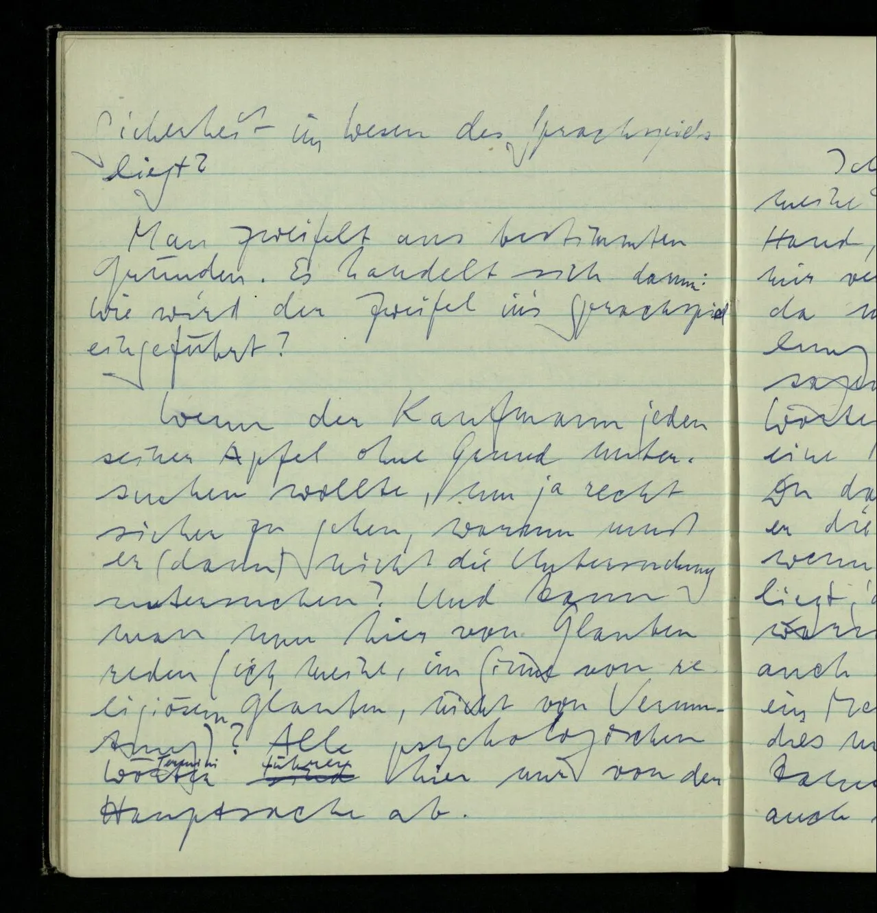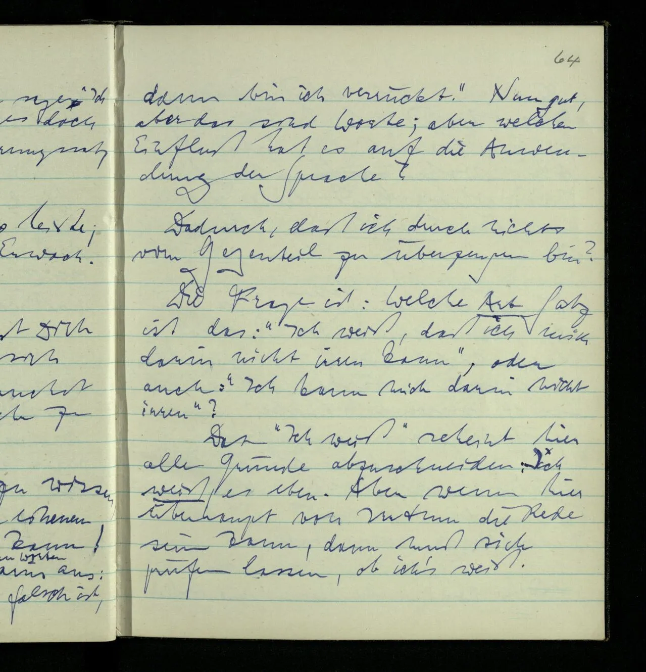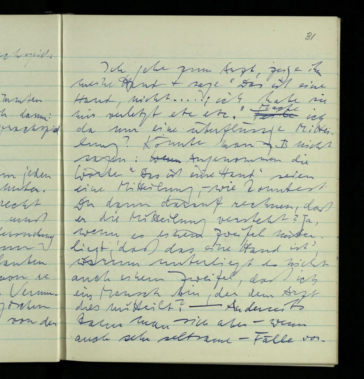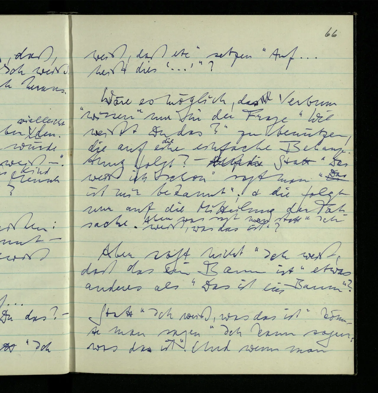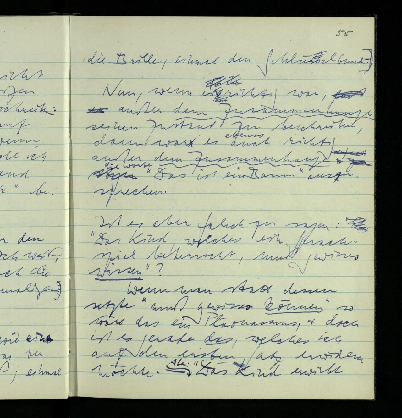 Man könnte z.B. die Sicherheit des Satzes, daß Wasser ca. bei 100˚ C kocht, beschreiben. Es ist das z.B. nicht ein Satz, den ich einmal gehört habe wie etwa den & jenen, die ich nennen könnte. Ich habe das Experiment selber in der Schule gemacht. Der Satz ist ein sehr elementarer unserer Lehrbücher, denen in solchen Dingen zu trauen ist, weil …. – Man kann nun allem dem Beispiele entgegenhalten, die zeigen, daß Menschen dies & jenes für gewiß gehalten haben, was sich später, unsrer Meinung nach, für falsch erwiesen hat. Aber dieses Argument ist wertlos. Zu sagen: wir können am Ende nur solche Gründe anführen, die wir für Gründe halten, sagt gar nichts. Kann es denn nicht auch geschehen, daß man heute einen Irrtum früherer Zeiten zu erkennen glaubt, & später darauf kommt, daß die erste Ansicht richtig war. etc. Ich glaube es liegt hier ein Mißverständnis des Wesens unserer Sprachspiele zu Grunde.