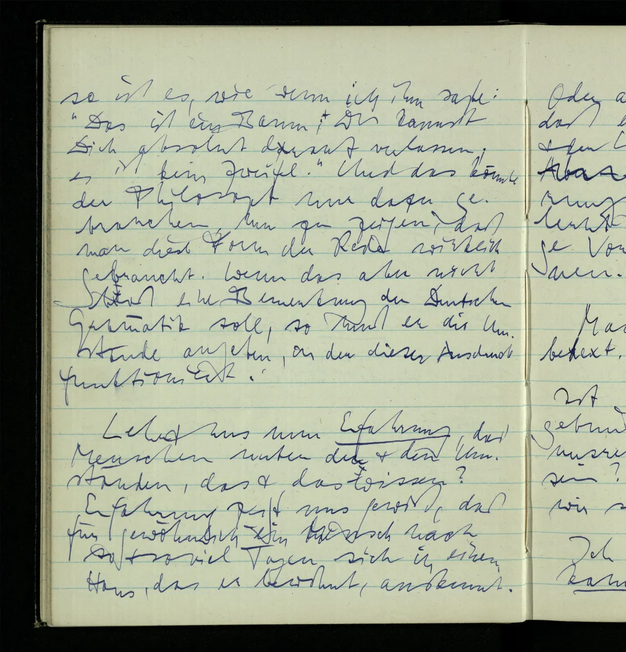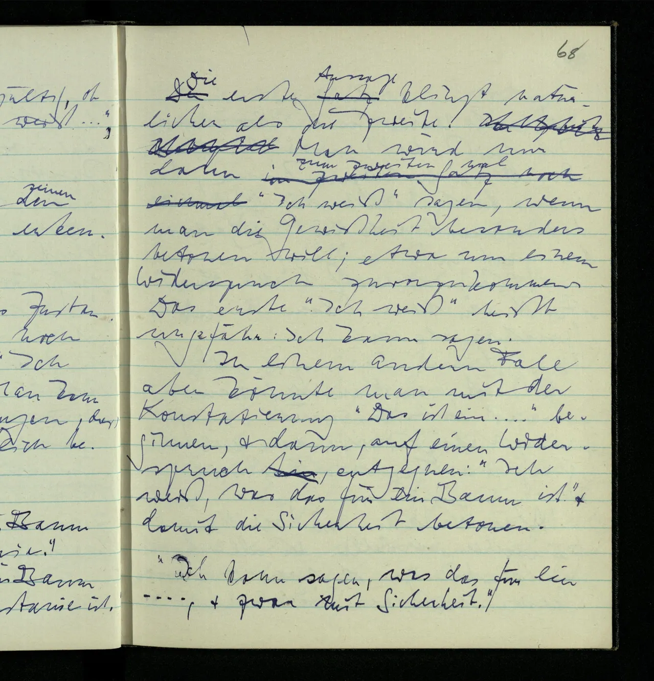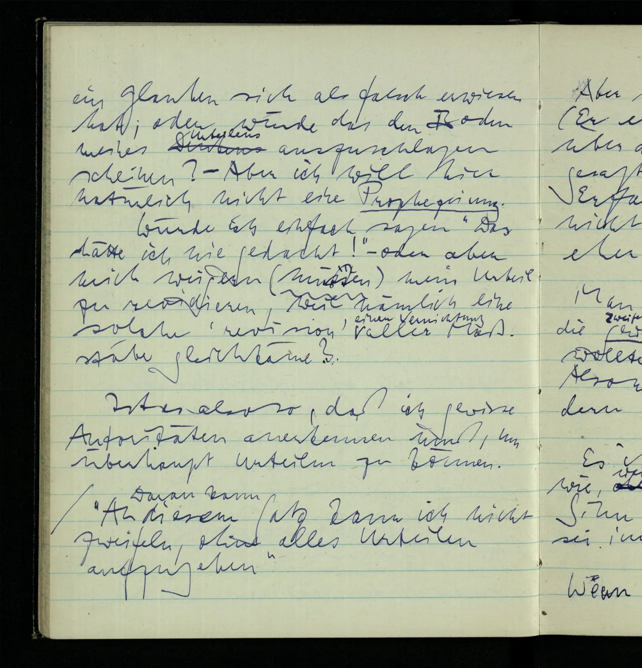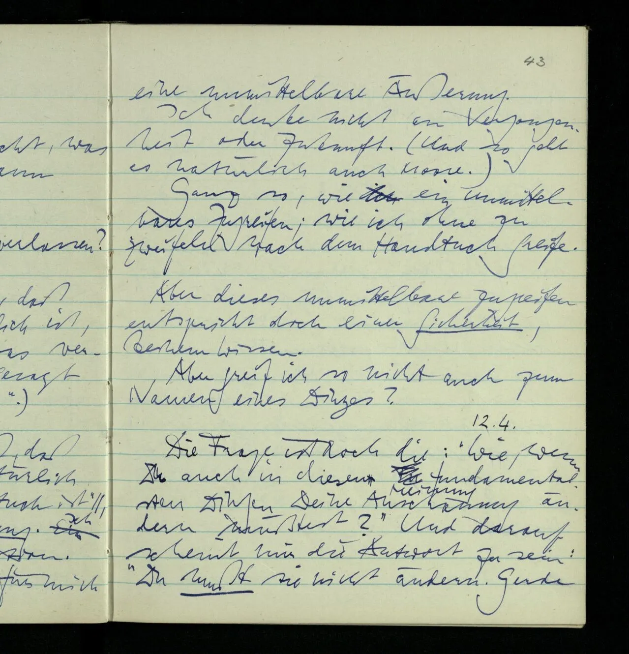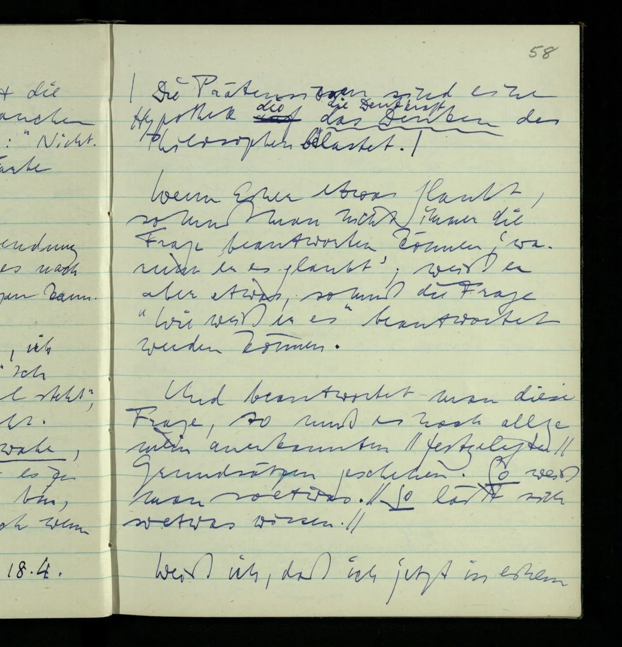 Man könnte z.B. die Sicherheit des Satzes, daß Wasser ca. bei 100˚ C kocht, beschreiben. Es ist das z.B. nicht ein Satz, den ich einmal gehört habe wie etwa den & jenen, die ich nennen könnte. Ich habe das Experiment selber in der Schule gemacht. Der Satz ist ein sehr elementarer unserer Lehrbücher, denen in solchen Dingen zu trauen ist, weil …. – Man kann nun allem dem Beispiele entgegenhalten, die zeigen, daß Menschen dies & jenes für gewiß gehalten haben, was sich später, unsrer Meinung nach, für falsch erwiesen hat. Aber dieses Argument ist wertlos. Zu sagen: wir können am Ende nur solche Gründe anführen, die wir für Gründe halten, sagt gar nichts. Kann es denn nicht auch geschehen, daß man heute einen Irrtum früherer Zeiten zu erkennen glaubt, & später darauf kommt, daß die erste Ansicht richtig war. etc. Ich glaube es liegt hier ein Mißverständnis des Wesens unserer Sprachspiele zu Grunde.