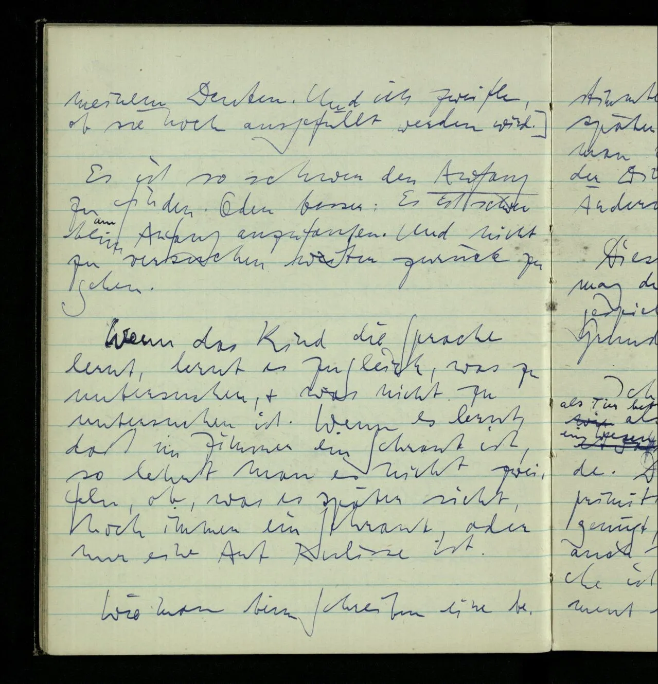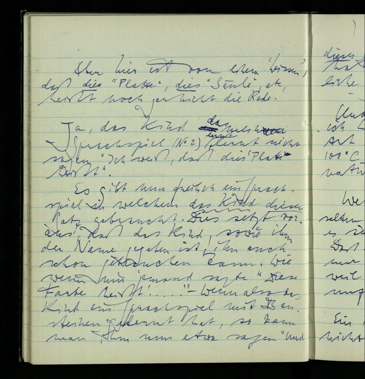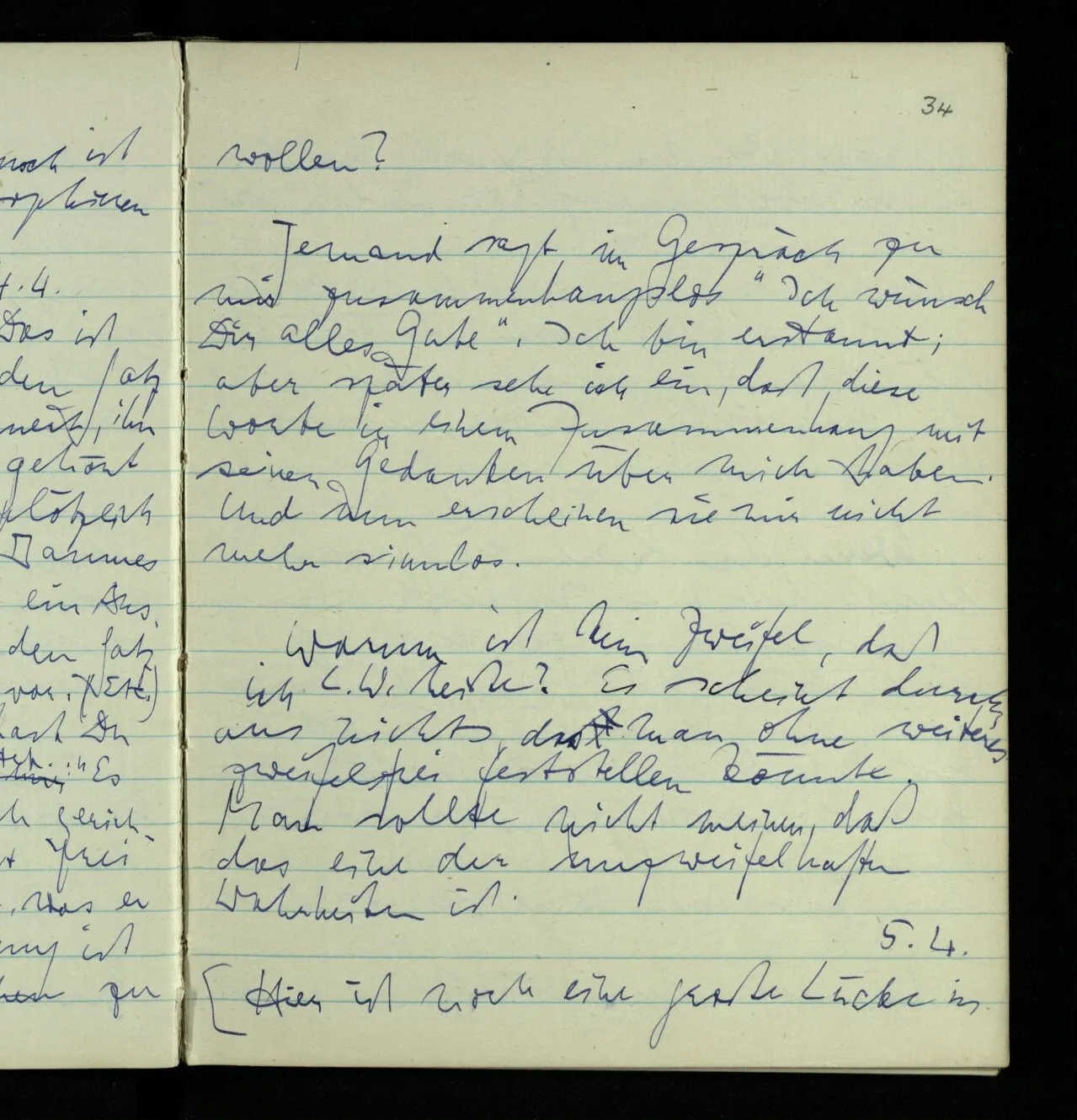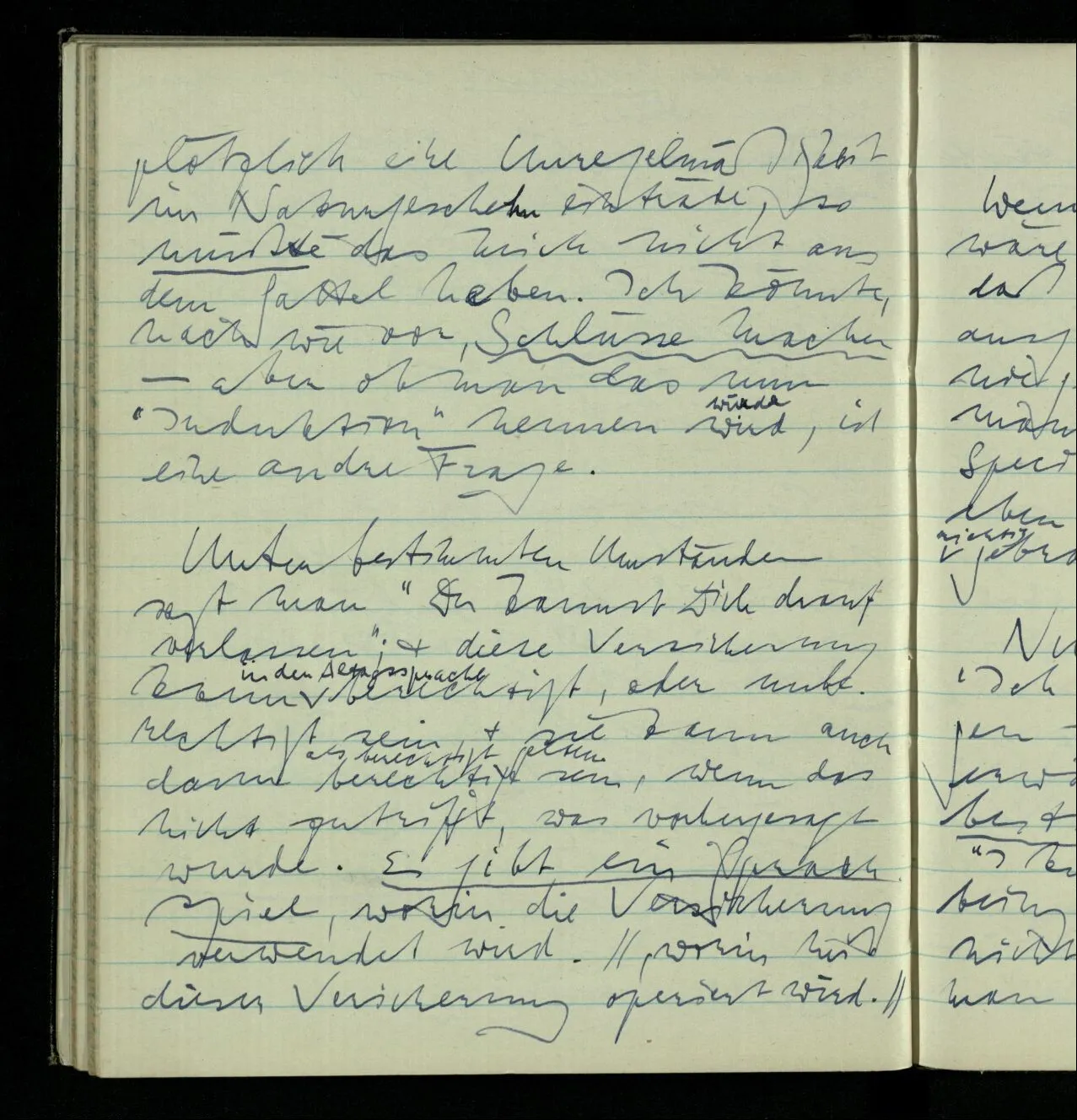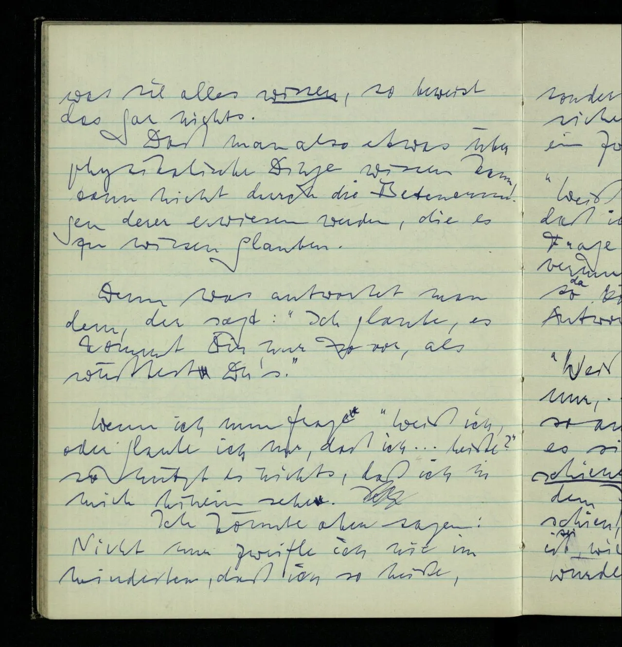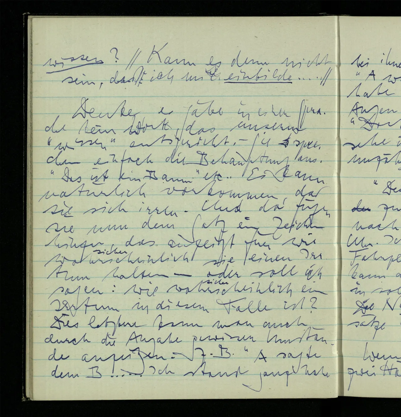 Man könnte z.B. die Sicherheit des Satzes, daß Wasser ca. bei 100˚ C kocht, beschreiben. Es ist das z.B. nicht ein Satz, den ich einmal gehört habe wie etwa den & jenen, die ich nennen könnte. Ich habe das Experiment selber in der Schule gemacht. Der Satz ist ein sehr elementarer unserer Lehrbücher, denen in solchen Dingen zu trauen ist, weil …. – Man kann nun allem dem Beispiele entgegenhalten, die zeigen, daß Menschen dies & jenes für gewiß gehalten haben, was sich später, unsrer Meinung nach, für falsch erwiesen hat. Aber dieses Argument ist wertlos. Zu sagen: wir können am Ende nur solche Gründe anführen, die wir für Gründe halten, sagt gar nichts. Kann es denn nicht auch geschehen, daß man heute einen Irrtum früherer Zeiten zu erkennen glaubt, & später darauf kommt, daß die erste Ansicht richtig war. etc. Ich glaube es liegt hier ein Mißverständnis des Wesens unserer Sprachspiele zu Grunde.