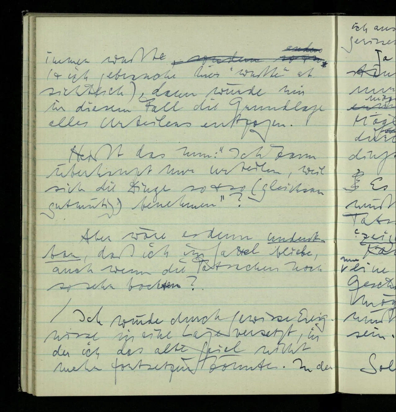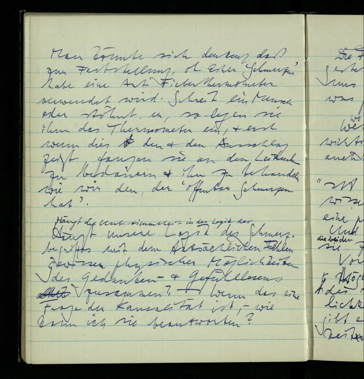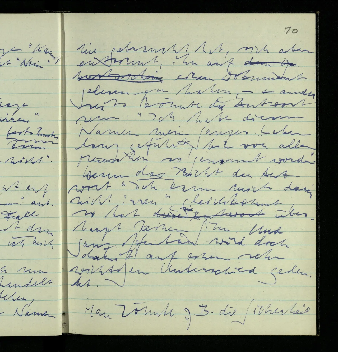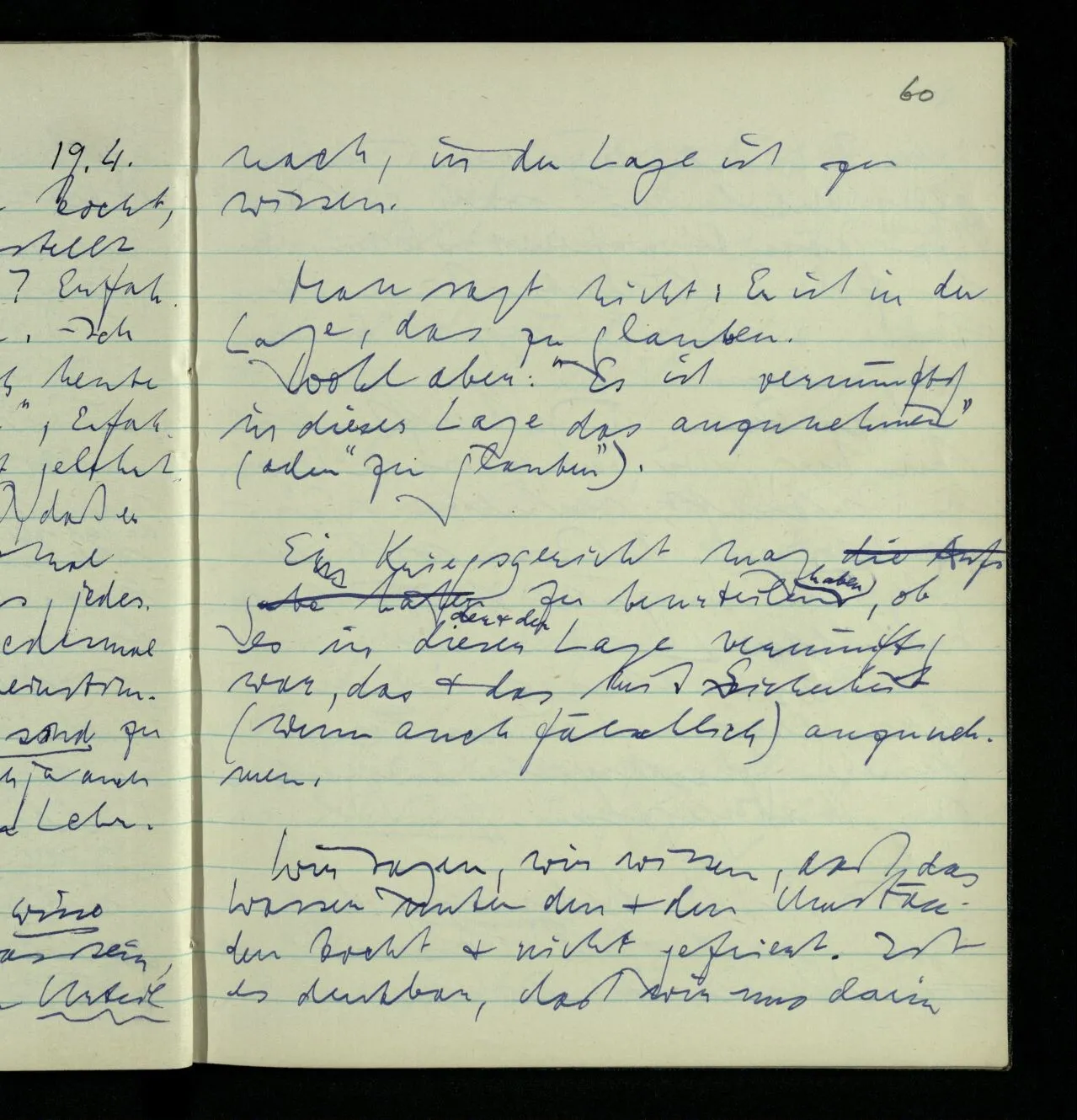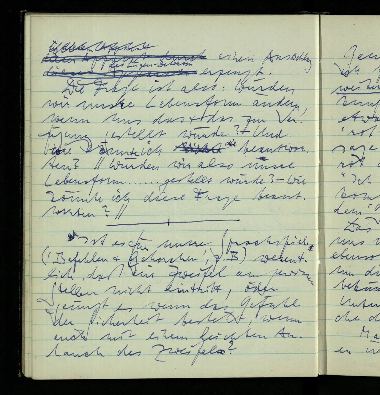 Man könnte z.B. die Sicherheit des Satzes, daß Wasser ca. bei 100˚ C kocht, beschreiben. Es ist das z.B. nicht ein Satz, den ich einmal gehört habe wie etwa den & jenen, die ich nennen könnte. Ich habe das Experiment selber in der Schule gemacht. Der Satz ist ein sehr elementarer unserer Lehrbücher, denen in solchen Dingen zu trauen ist, weil …. – Man kann nun allem dem Beispiele entgegenhalten, die zeigen, daß Menschen dies & jenes für gewiß gehalten haben, was sich später, unsrer Meinung nach, für falsch erwiesen hat. Aber dieses Argument ist wertlos. Zu sagen: wir können am Ende nur solche Gründe anführen, die wir für Gründe halten, sagt gar nichts. Kann es denn nicht auch geschehen, daß man heute einen Irrtum früherer Zeiten zu erkennen glaubt, & später darauf kommt, daß die erste Ansicht richtig war. etc. Ich glaube es liegt hier ein Mißverständnis des Wesens unserer Sprachspiele zu Grunde.
