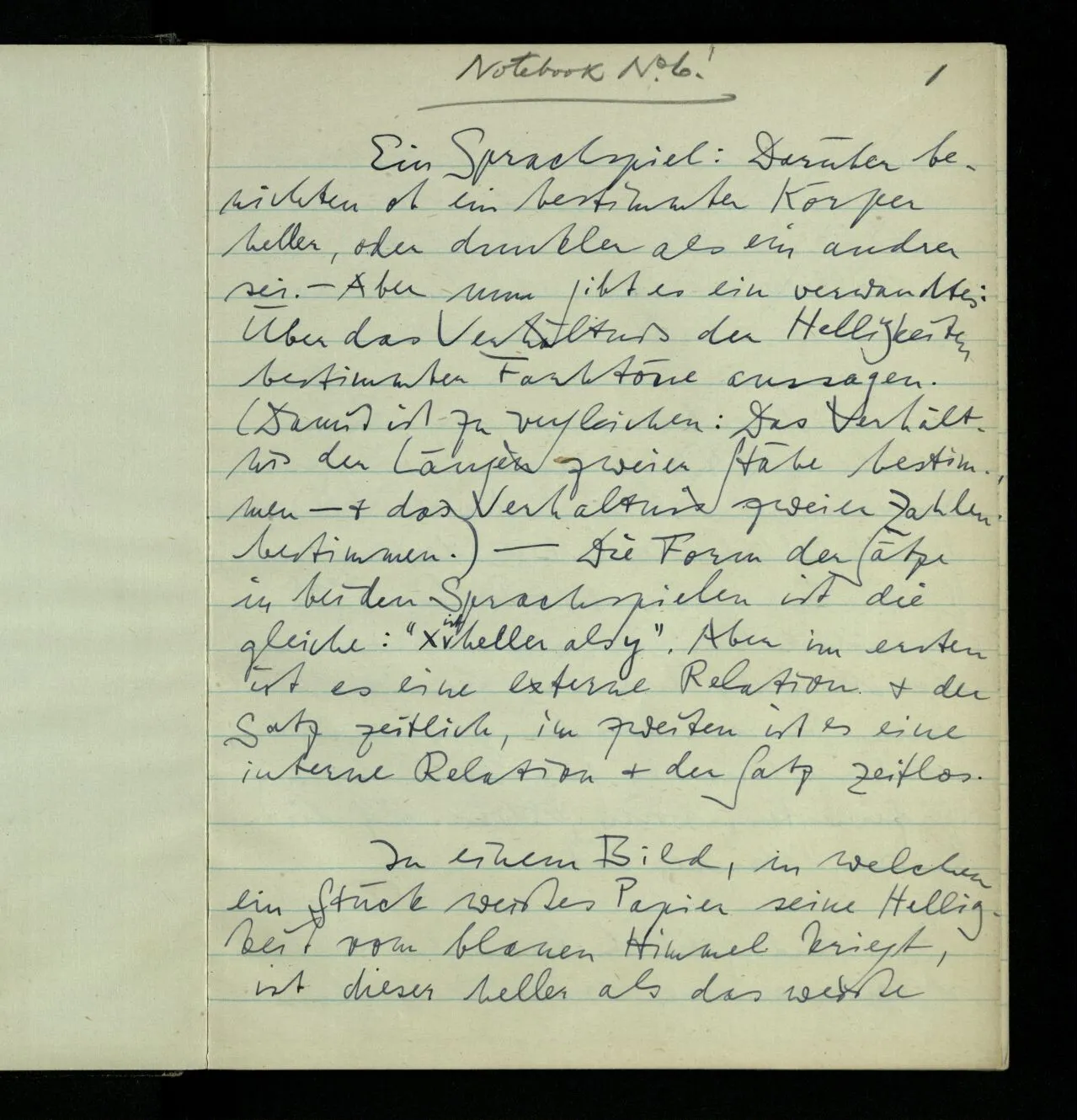Ein Sprachspiel: Darüber berichten ob ein bestimmter Körper heller, oder dunkler als ein andrer sei. – Aber nun gibt es ein verwandtes: Über das Verhältnis der Helligkeiten bestimmter Farbtöne aussagen. (Damit ist zu vergleichen: Das Verhältnis der Längen zweier Stäbe bestimmen – & das Verhältnis zweier Zahlen bestimmen.) – Die Form der Sätze in beiden Sprachspielen ist die gleiche: “x ist heller als y”. Aber im ersten ist es eine externe Relation & der Satz zeitlich, im zweiten ist es eine interne Relation & der Satz zeitlos.