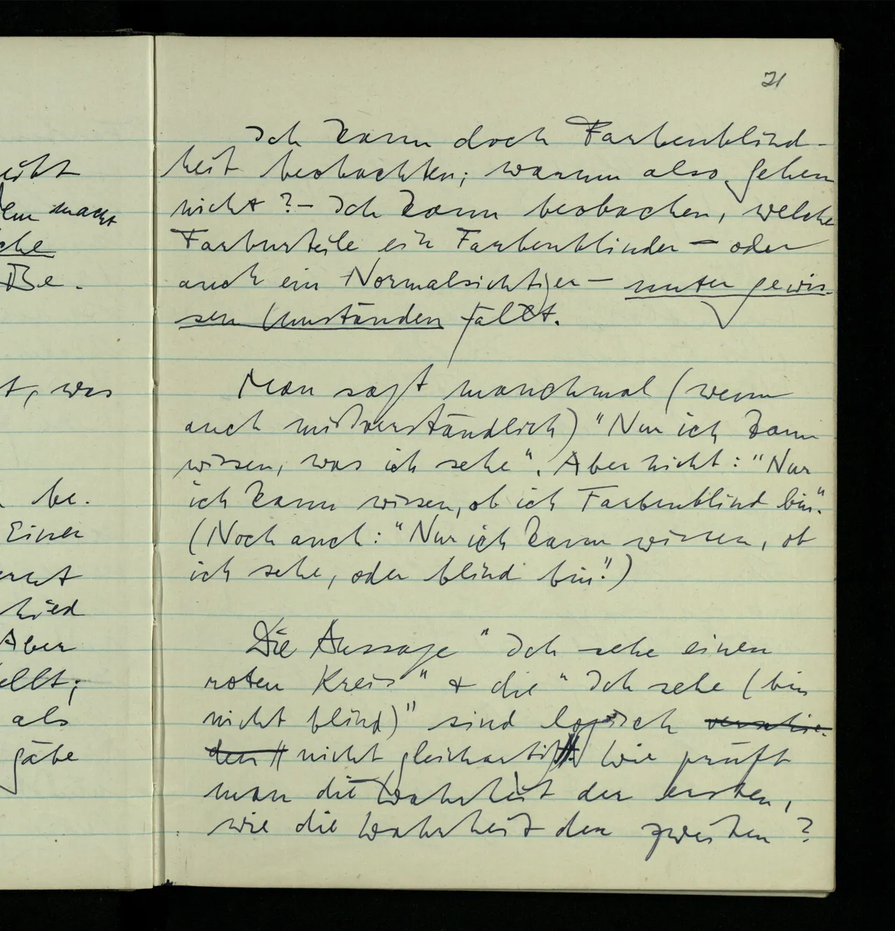 Wenn es aber auch Menschen gäbe, denen es natürlich wäre, das Wort “rötlichgrün” oder “gelblichblau” in einer konsequenten Weise zu verwenden & dabei vielleicht auch Fähigkeiten verrieten, die wir nicht haben, so wären wir dennoch nicht gezwungen anzuerkennen, sie sähen Farben, die wir nicht sehen. Es gibt ja kein allgemein anerkanntes Kriterium dafür, was eine Farbe sei, es sei denn, daß es eine unserer Farben ist.