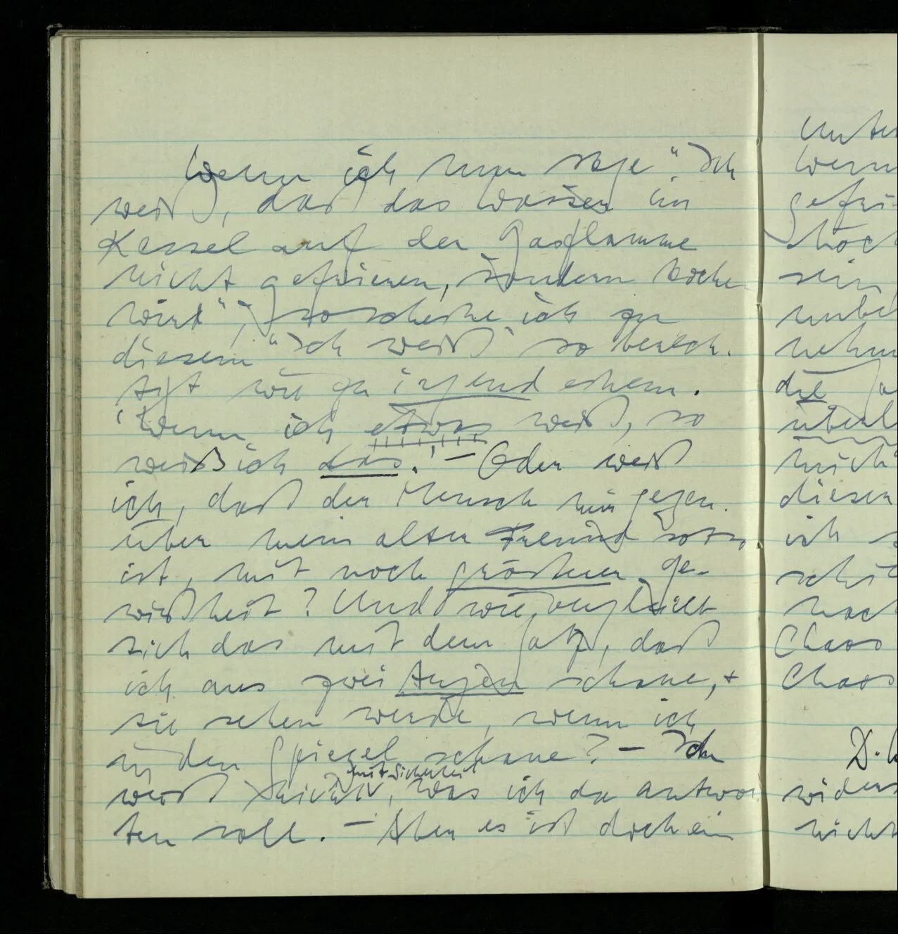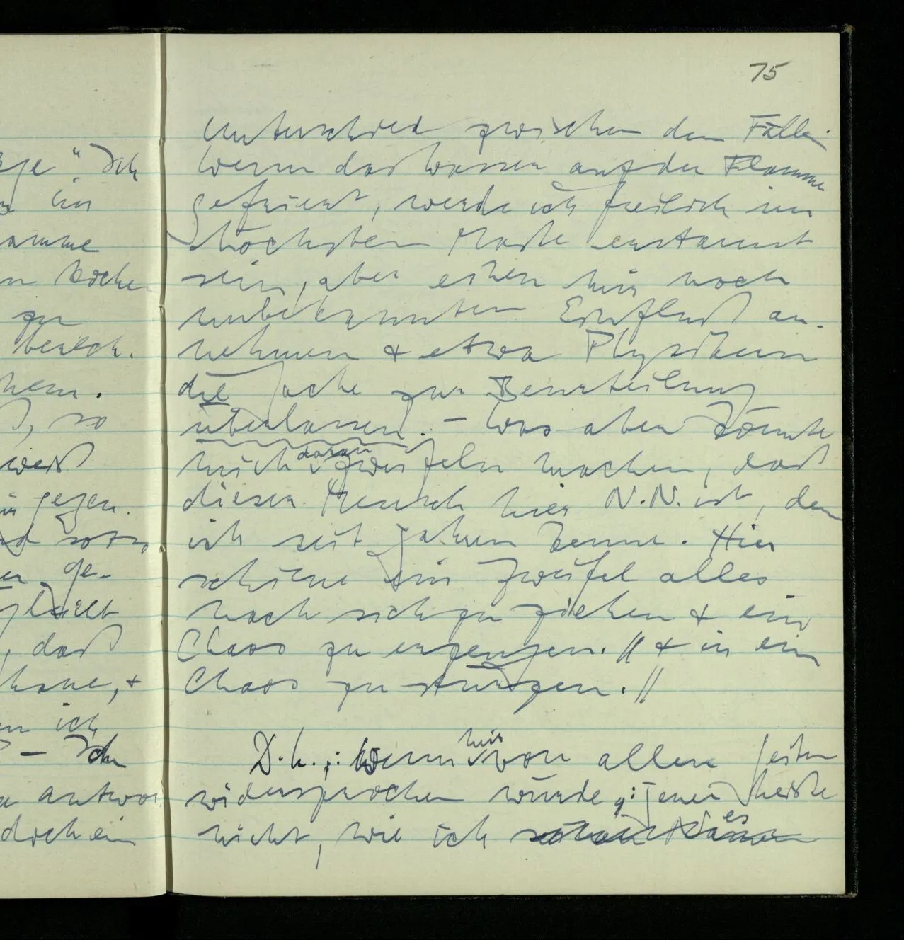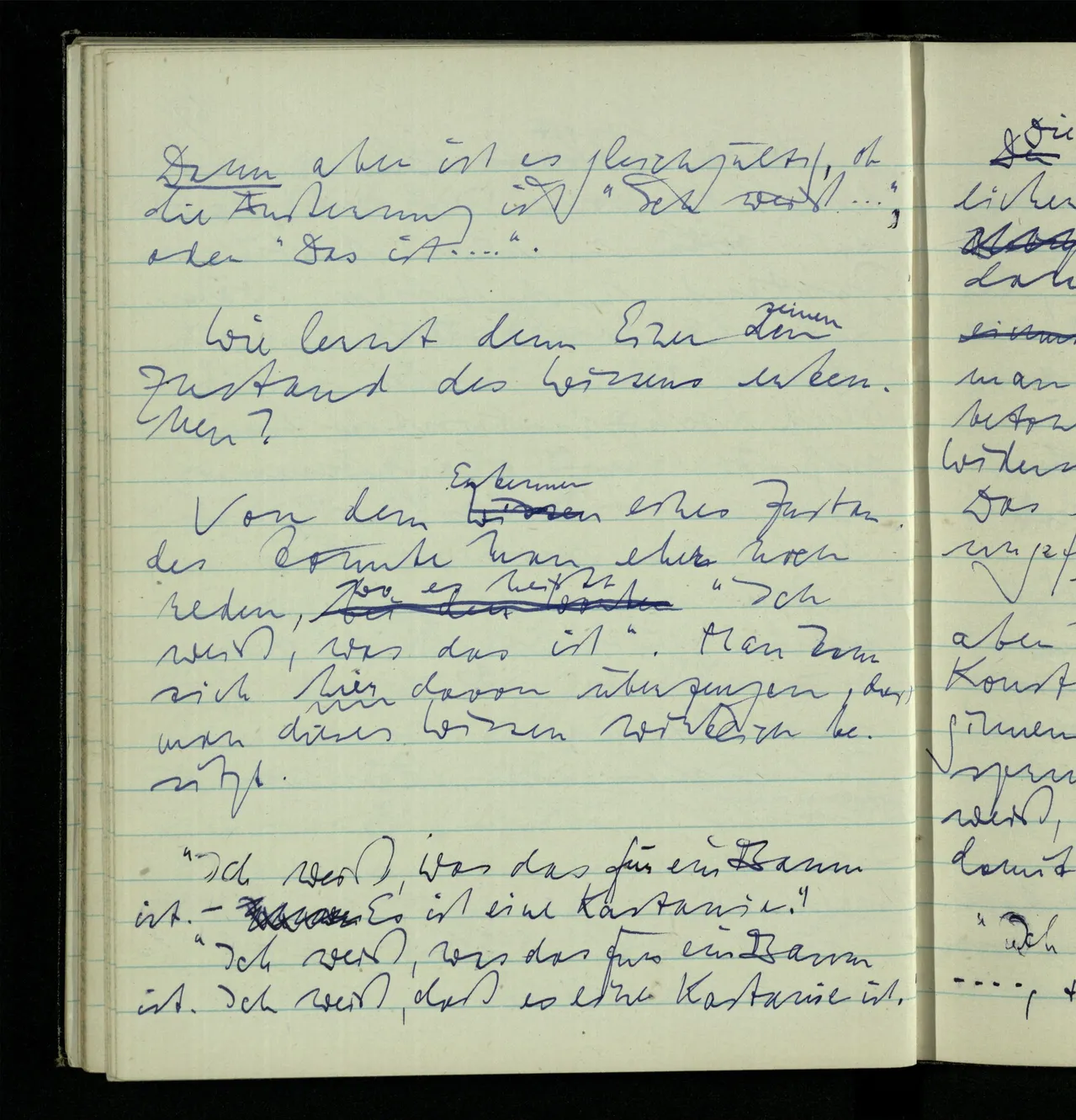 Wenn ich nun sage “Ich weiß, daß das Wasser im Kessel auf der Gasflamme nicht gefrieren, sondern kochen wird”, so scheine ich zu diesem “Ich weiß” so berechtigt wie zu irgend einem. ‘Wenn ich etwas weiß, so weiß ich das.’ – Oder weiß ich, daß der Mensch mir gegenüber mein alter Freund so & so ist, mit noch größerer Gewißheit? Und wie vergleicht sich das mit dem Satz, daß ich aus zwei Augen schaue, & sie sehen werde, wenn ich in den Spiegel schaue? – Ich weiß nicht mit Sicherheit, was ich da antworten soll. – Aber es ist doch ein Unterschied zwischen den Fällen. Wenn das Wasser auf der Flamme gefriert, werde ich freilich im höchsten Maße erstaunt sein, aber einen mir noch unbekannnten Einfluß annehmen & etwa Physikern die Sache zur Beurteilung überlassen. – Was aber könnte mich daran zweifeln machen, daß dieser Mensch hier N.N. ist, den ich seit Jahren kenne. Hier schiene ein Zweifel alles nach sich zu ziehen & ein Chaos zu erzeugen.