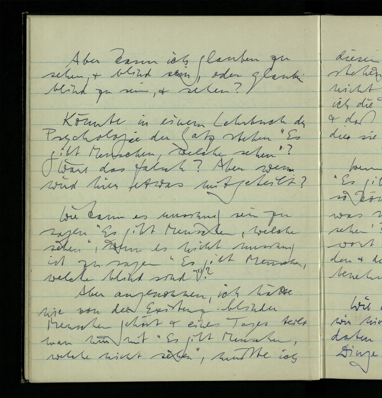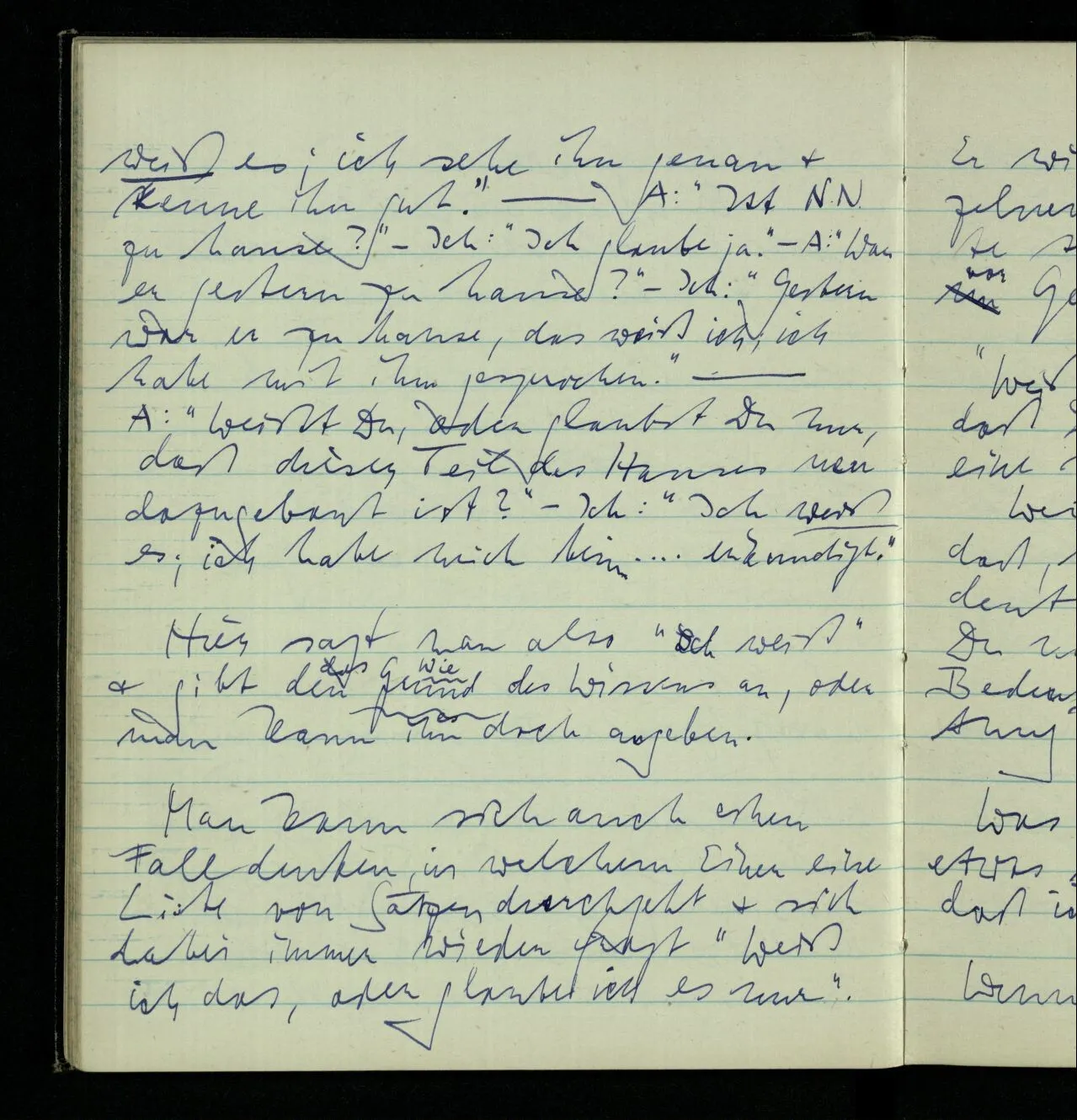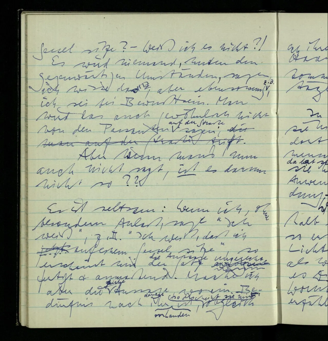 Wenn ich nun sage “Ich weiß, daß das Wasser im Kessel auf der Gasflamme nicht gefrieren, sondern kochen wird”, so scheine ich zu diesem “Ich weiß” so berechtigt wie zu irgend einem. ‘Wenn ich etwas weiß, so weiß ich das.’ – Oder weiß ich, daß der Mensch mir gegenüber mein alter Freund so & so ist, mit noch größerer Gewißheit? Und wie vergleicht sich das mit dem Satz, daß ich aus zwei Augen schaue, & sie sehen werde, wenn ich in den Spiegel schaue? – Ich weiß nicht mit Sicherheit, was ich da antworten soll. – Aber es ist doch ein Unterschied zwischen den Fällen. Wenn das Wasser auf der Flamme gefriert, werde ich freilich im höchsten Maße erstaunt sein, aber einen mir noch unbekannnten Einfluß annehmen & etwa Physikern die Sache zur Beurteilung überlassen. – Was aber könnte mich daran zweifeln machen, daß dieser Mensch hier N.N. ist, den ich seit Jahren kenne. Hier schiene ein Zweifel alles nach sich zu ziehen & ein Chaos zu erzeugen.