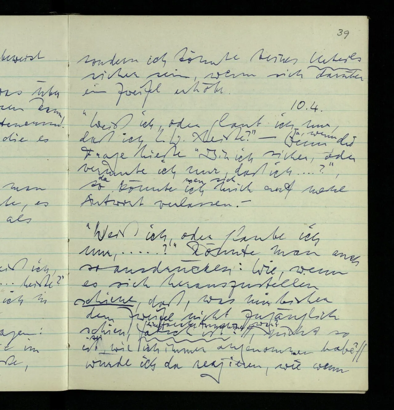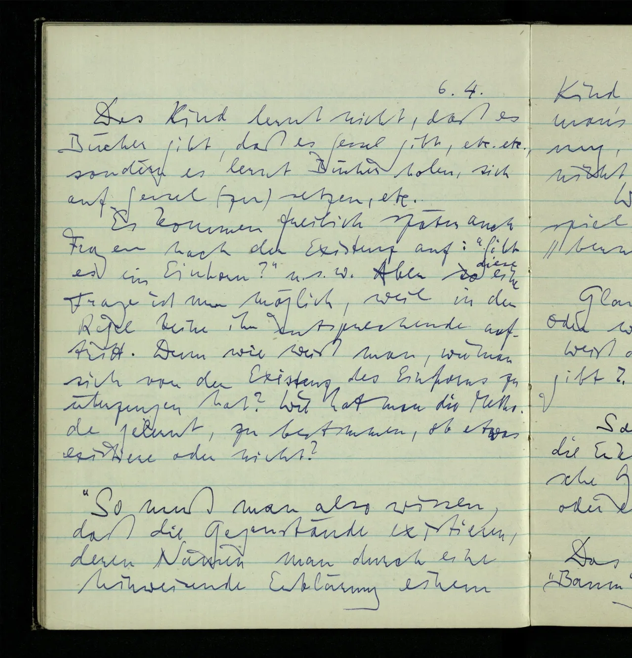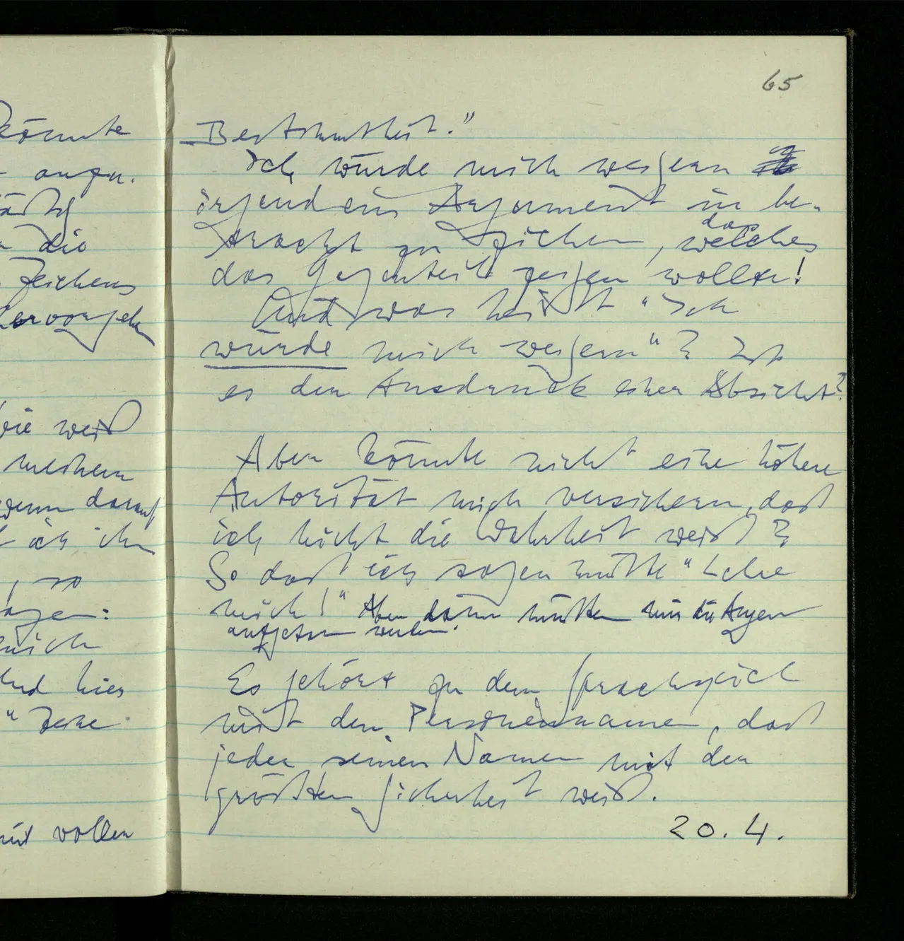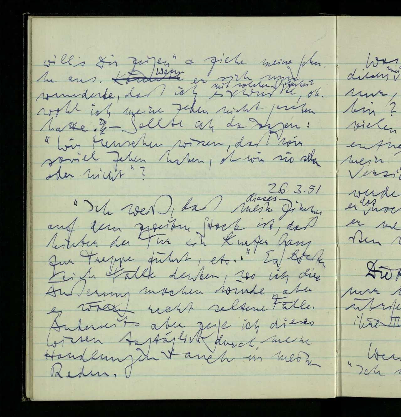 24.04.1951 Wenn von Anatomie die Rede wäre, würde ich sagen: “Ich weiß, daß vom Gehirn 12 Nervenpaare ausgehen.” Ich habe diese Nerven nie gesehen, & auch ein Fachmann hat sie nur an wenigen Spezimina beobachtet. – So wird aber hier das Wort “Ich weiß” richtig gebraucht.