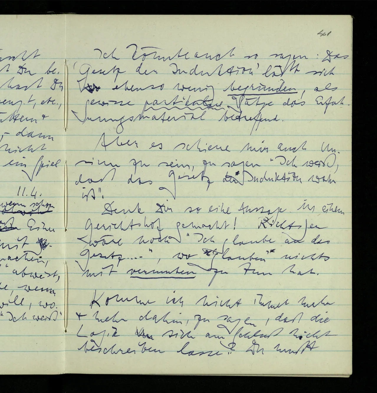 Soll ich sagen: Wenn auch plötzlich eine Unregelmäßigkeit im Naturgeschehn einträte, so müßte das mich nicht aus dem Sattel heben. Ich könnte, nach wie vor, Schlüsse machen – aber ob man das nun “Induktion” nennen wird, ist eine andre Frage.