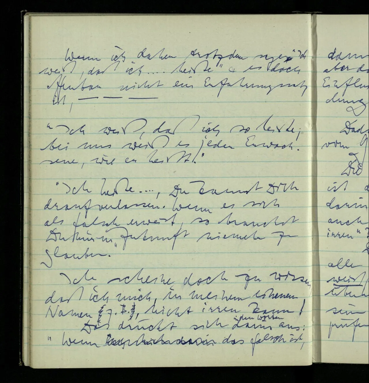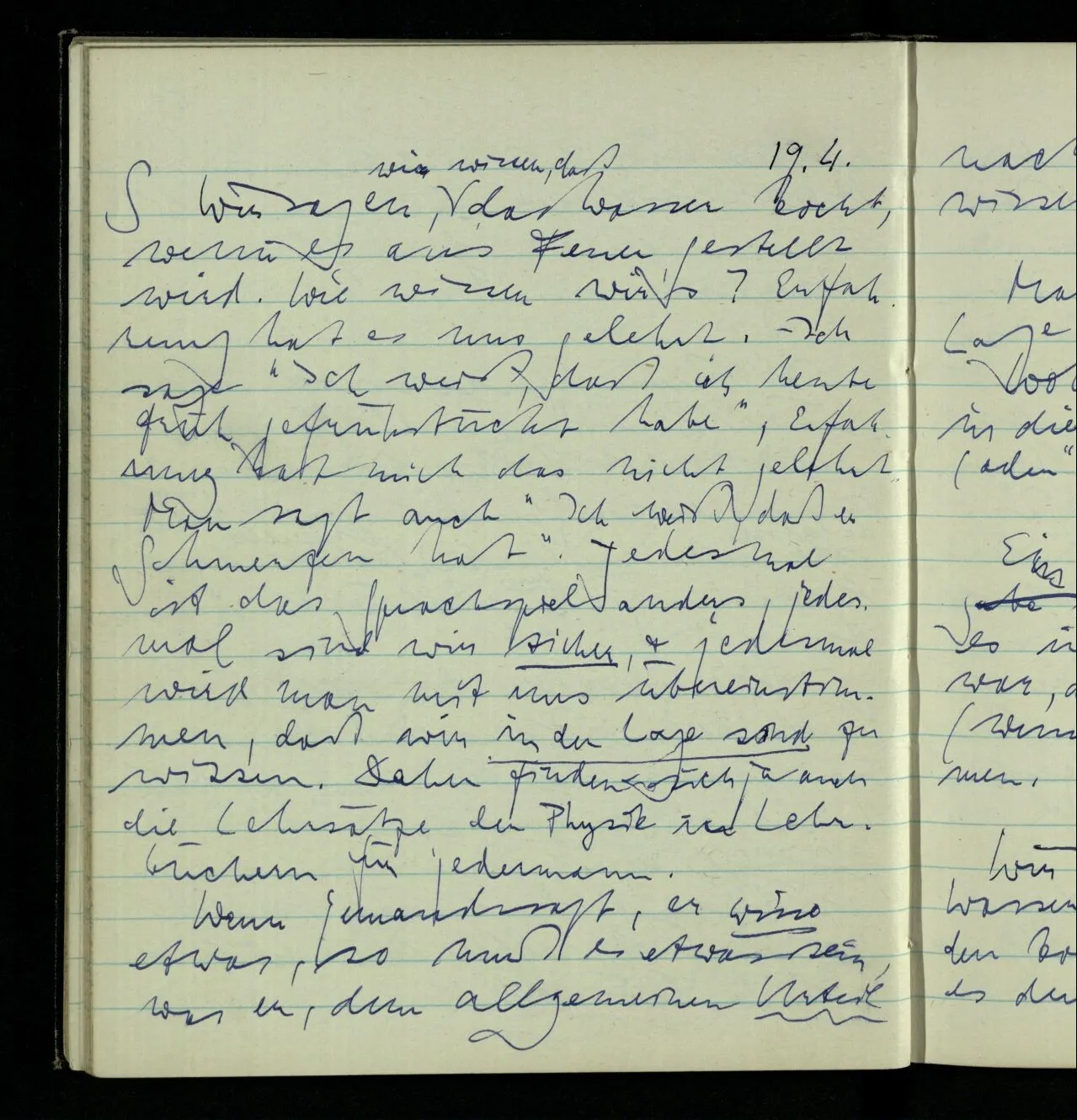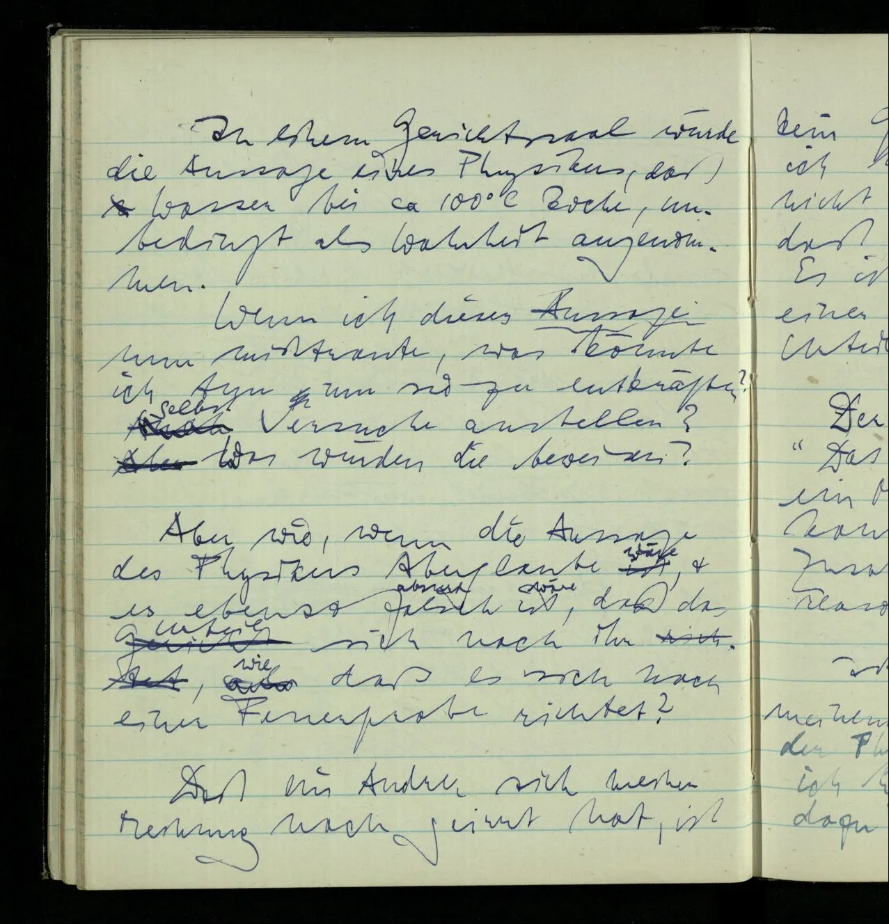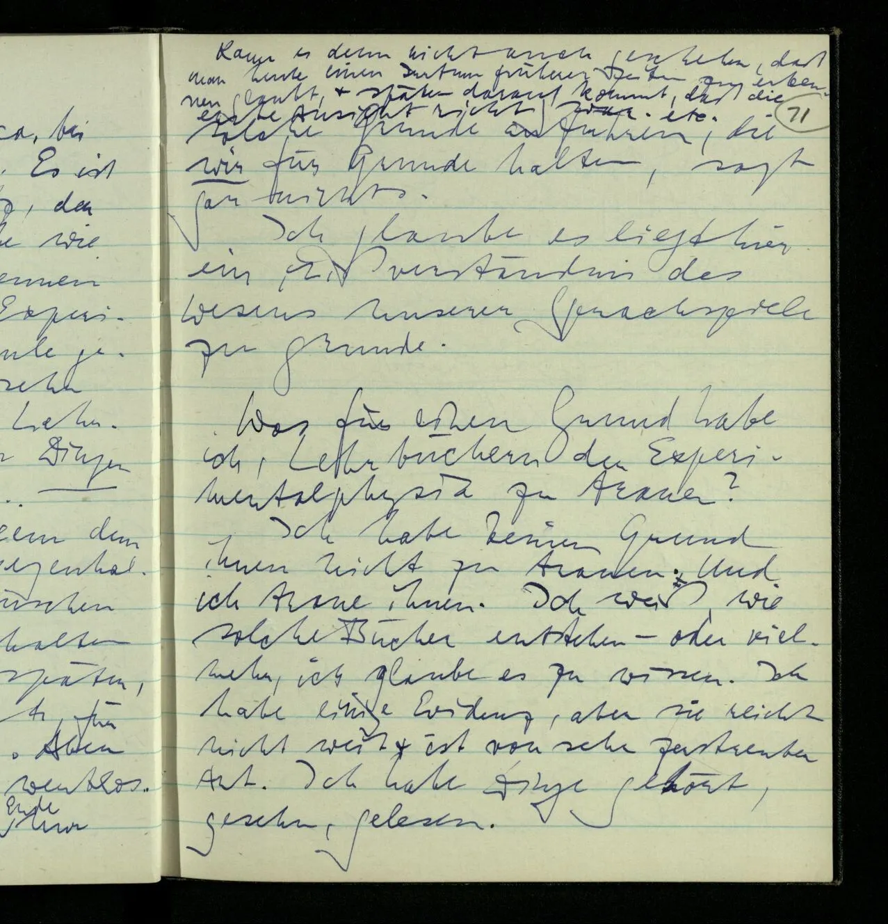 Was für einen Grund habe ich, Lehrbüchern der Experimentalphysik zu trauen? Ich habe keinen Grund ihnen nicht zu trauen. Und ich traue ihnen. Ich weiß, wie solche Bücher entstehen – oder vielmehr, ich glaube es zu wissen. Ich habe einige Evidenz, aber sie reicht nicht weit & ist von sehr zerstreuter Art. Ich habe Dinge gehört, gesehn, gelesen.