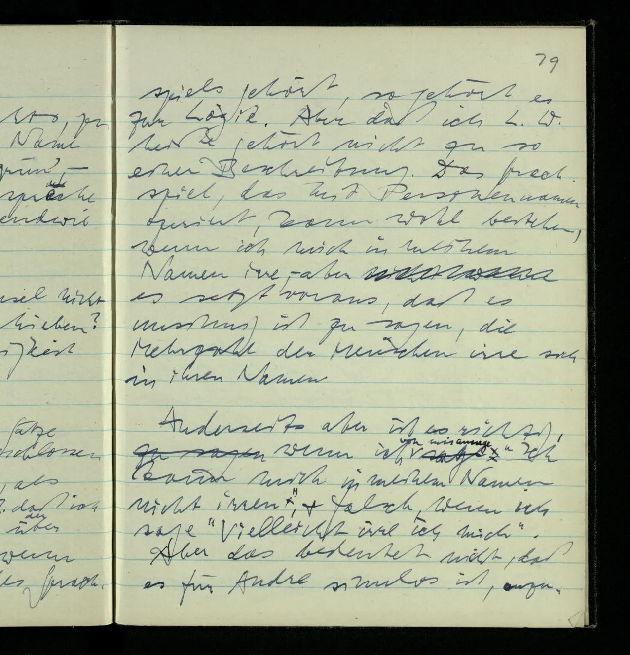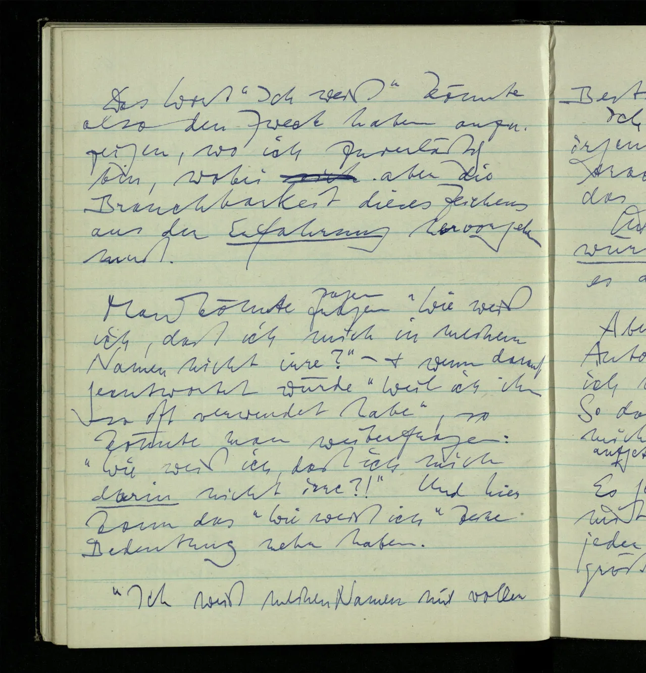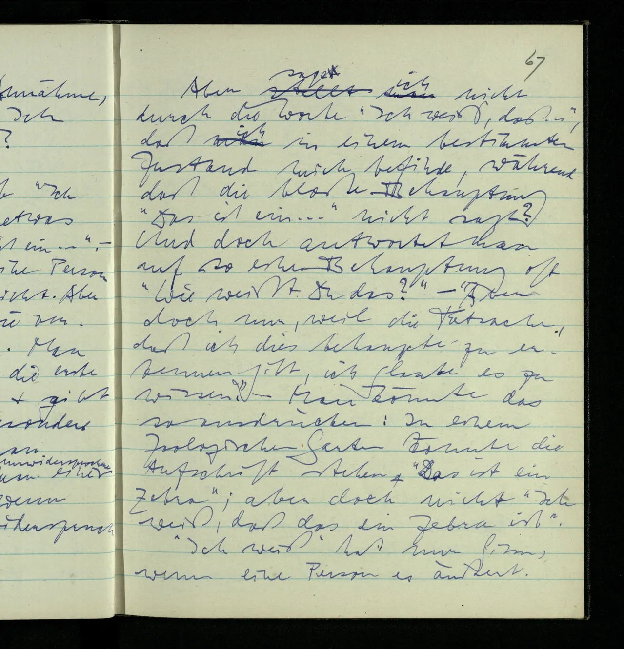 Wenn man sagt: “Gewisse Sätze müssen vom Zweifel ausgeschlossen werden”, dann scheint es, als sollte ich diese Sätze, z.B. daß ich L. W. heiße, in ein Buch über Logik aufnehmen. Denn wenn es zur Beschreibung des Sprachspiels gehört, so gehört es zur Logik. Aber daß ich L.W. heiße gehört nicht zu so einer Beschreibung. Das Sprachspiel, das mit Personennamen operiert, kann wohl bestehen, wenn ich mich in meinem Namen irre, – aber es setzt voraus, daß es unsinnig ist zu sagen, die Mehrzahl der Menschen irre sich in ihren Namen.