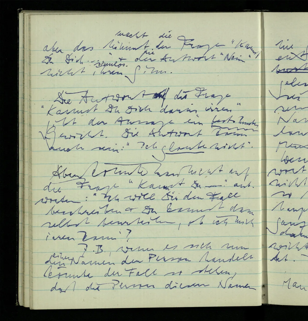 “Kannst Du Dich darin irren, daß diese Farbe auf Deutsch ‘Grün’ heißt?” Meine Antwort darauf kann nur “Nein” sein. Sagte ich “Ja, – denn eine Verblendung ist immer möglich”, so hieße das gar nichts. Ist denn der Nachsatz etwas dem Andern Unbekanntes? Und wie ist er mir bekannt?