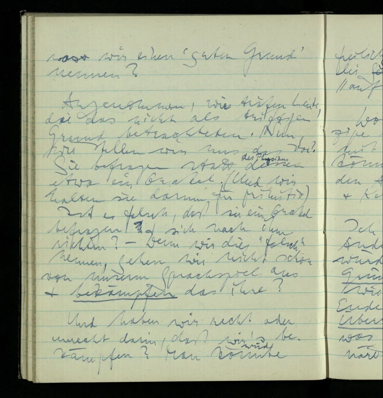Ist es falsch, daß ich mich in meinem Handeln nach dem Satze der Physik richte? Soll ich sagen, ich habe keinen guten Grund dazu? Ist nicht eben das, was wir einen ‘guten Grund’ nennen?