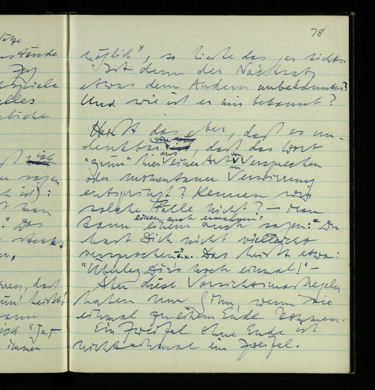 Heißt das aber, daß es undenkbar wäre, daß das Wort “grün” hier aus einer Art von Versprechen oder momentaner Verwirrung entspringt? Kennen wir solche Fälle nicht? – Man kann einem auch sagen: “Du hast Dich nicht vielleicht versprochen –”. Das heißt etwa: “Überleg Dir’s noch einmal!” – Aber diese Vorsichtsmaßregeln haben nur Sinn, wenn sie einmal zu einem Ende kommen. Ein Zweifel ohne Ende ist nicht einmal ein Zweifel.