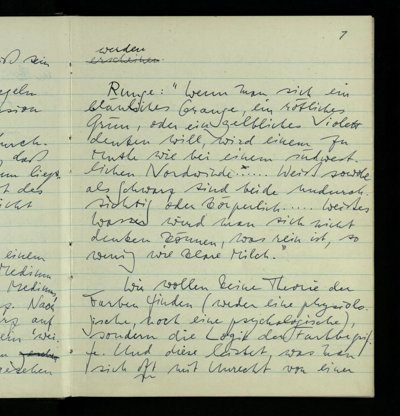 Runge: “Wenn man sich ein bläuliches Orange, ein rötliches Grün, oder ein gelbliches Violett denken will, wird einem zu Muthe wie bei einem südwestlichen Nordwinde … Weiß sowohl als Schwarz sind beide undurchsichtig oder körperlich … Weißes Wasser wird man sich nicht denken können, was rein ist, so wenig wie klare Milch.”