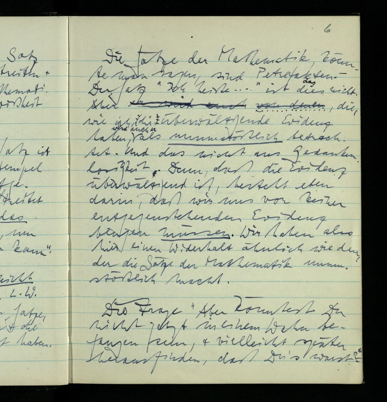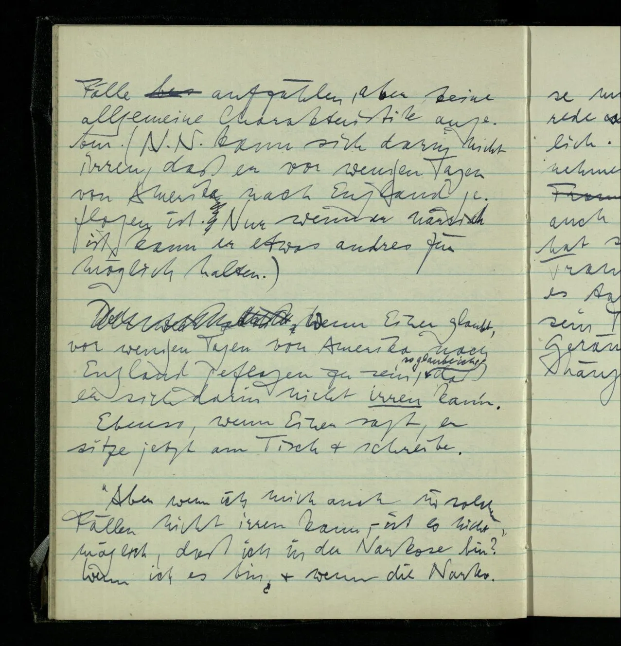 Wenn Einer glaubt, vor wenigen Tagen von Amerika nach England geflogen zu sein, so glaube ich, daß er sich darin nicht irren kann. Ebenso, wenn Einer sagt, er sitze jetzt am Tisch & schreibe.