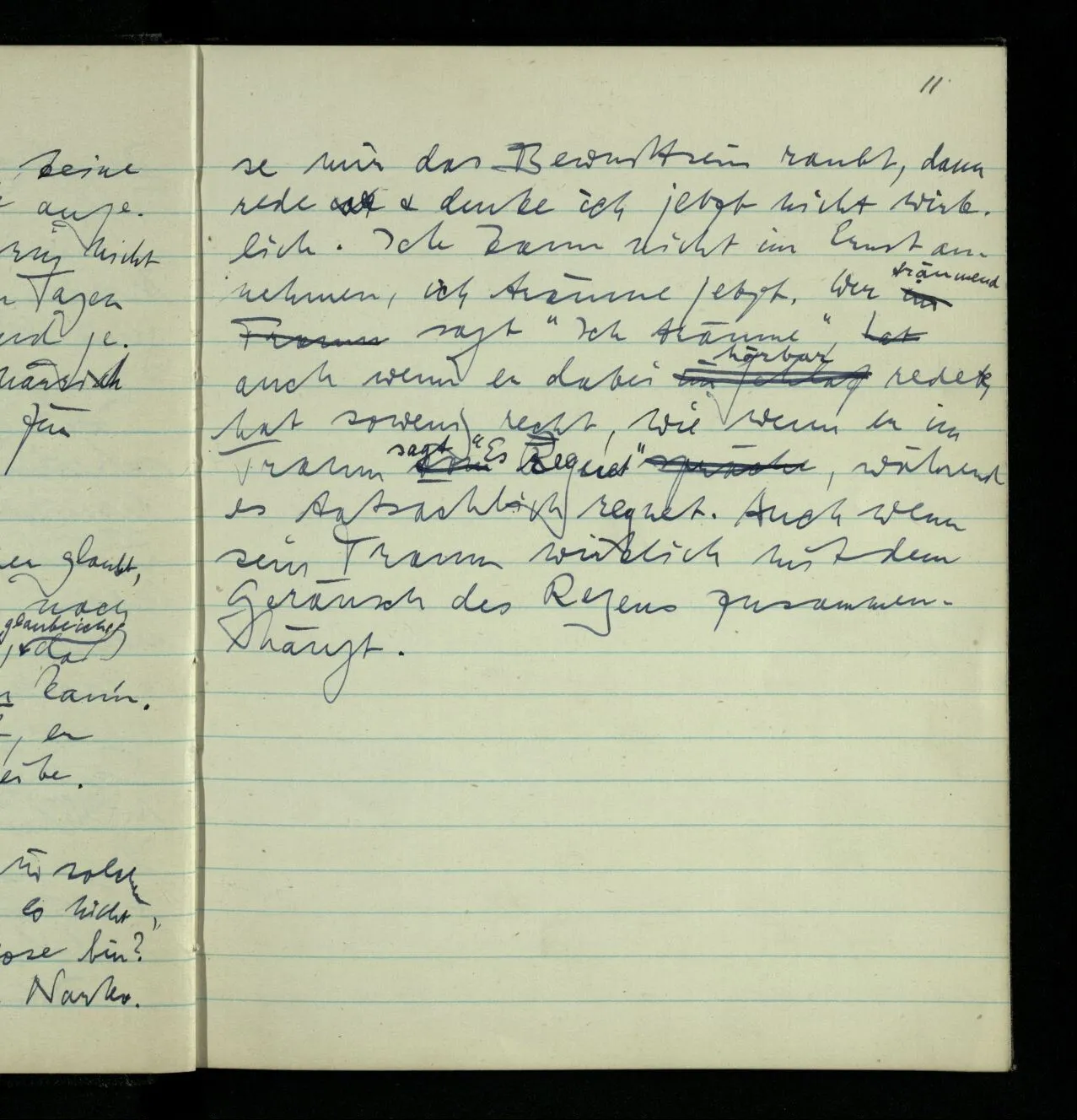 “Aber wenn ich mich auch in solchen Fällen nicht irren kann, – ist es nicht möglich, daß ich in der Narkose bin?” Wenn ich es bin & wenn die Narkose mir das Bewußtsein raubt, dann rede & denke ich jetzt nicht wirklich. Ich kann nicht im Ernst annehmen, ich träume jetzt. Wer träumend sagt “Ich träume”, auch wenn er dabei hörbar redete, hat sowenig recht, wie wenn er im Traum sagt “Es regnet”, während es tatsächlich regnet. Auch wenn sein Traum wirklich mit dem Geräusch des Regens zusammenhängt.