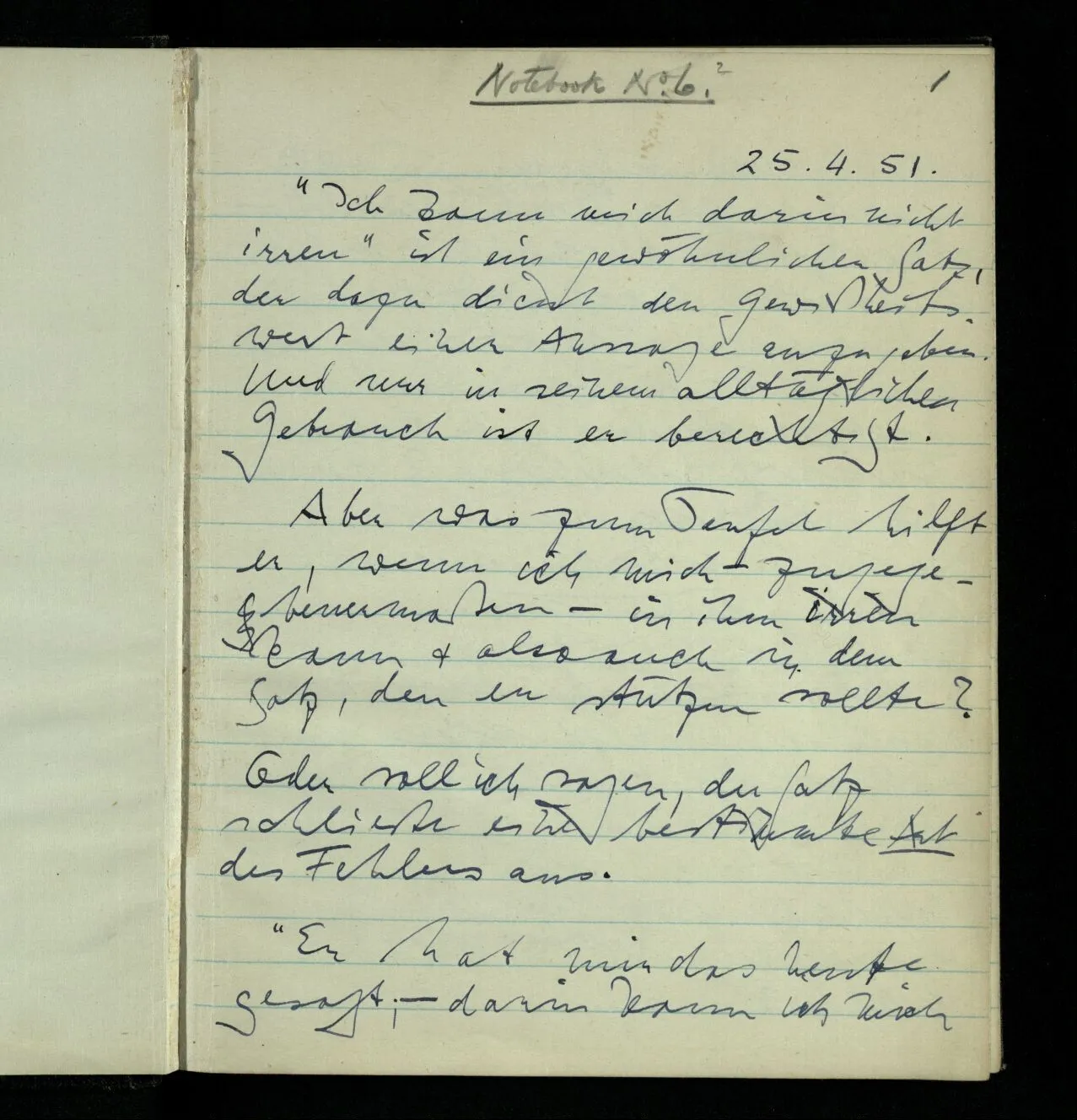 25.04.1951 “Ich kann mich darin nicht irren” ist ein gewöhnlicher Satz, der dazu dient den Gewißheitswert einer Aussage anzugeben. Und nur in seinem alltäglichen Gebrauch ist er berechtigt.