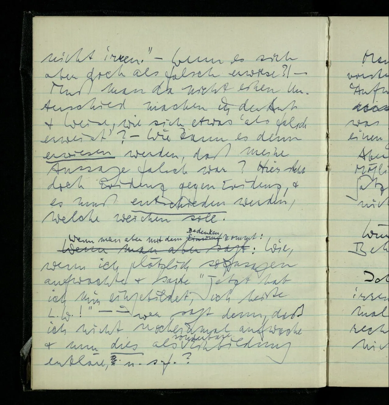 Wenn man aber mit dem Bedenken kommt: Wie, wenn ich plötzlich sozusagen aufwachte & sagte “Jetzt hab ich mir eingebildet, ich heiße L.W.!” – – wer sagt denn, daß ich nicht nocheinmal aufwache & nun dies als sonderbare Einbildung erkläre, u.s.f.?