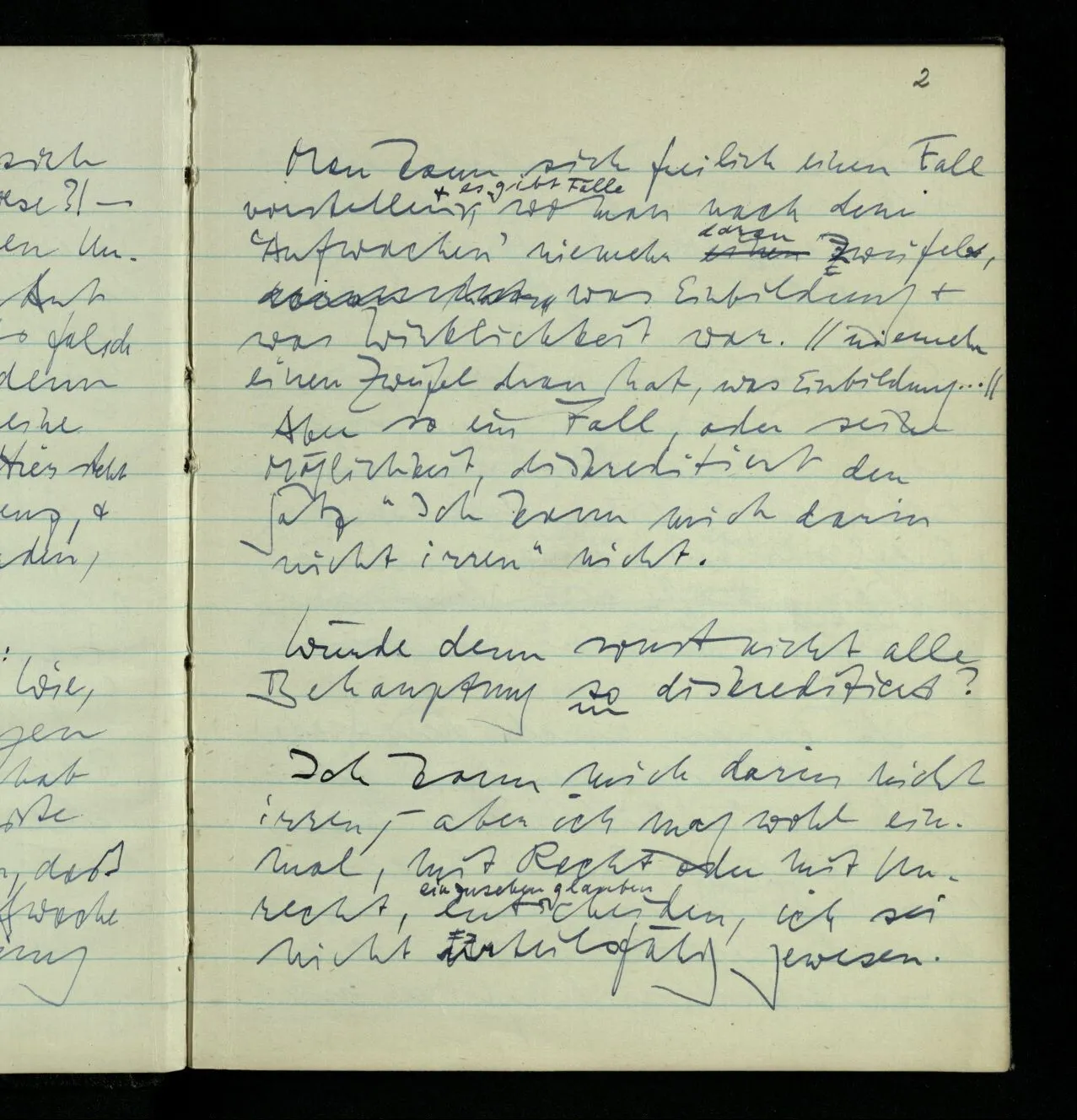 Man kann sich freilich einen Fall vorstellen & es gibt Fälle, wo man nach dem ‘Aufwachen’ nie mehr daran zweifelt, was Einbildung & was Wirklichkeit war. Aber so ein Fall, oder seine Möglichkeit, diskreditiert den Satz “Ich kann mich darin nicht irren” nicht.