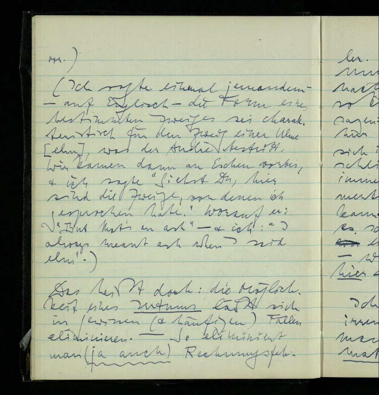 (Ich sagte einmal jemandem – auf Englisch – die Form eines bestimmten Zweiges sei charakteristisch für den Zweig einer Ulme [elm], was der Andre bestritt. Wir kamen dann an Eschen vorbei, & ich sagte “Siehst Du, hier sind die Zweige, von denen ich gesprochen habe.” Worauf er: “But that’s an ash” – & ich: “I always meant ash when I said elm”.)