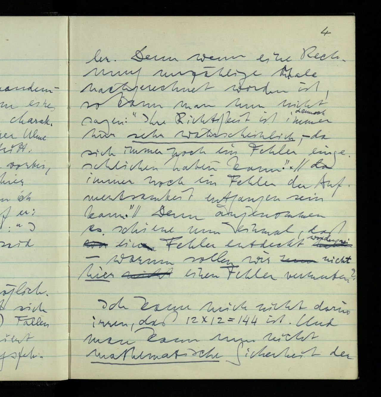 Ich kann mich nicht darin irren, daß 12 × 12 = 144 ist. Und man kann nun nicht mathematische Sicherheit der relativen Unsicherheit von Erfahrungssätzen entgegensetzen. Denn der mathematische Satz wurde durch eine Reihe von Handlungen erhalten, die sich in keiner Weise von Handlungen des übrigen Lebens unterscheiden & die gleichermaßen dem Vergessen, Übersehen, der Täuschung, ausgesetzt sind.